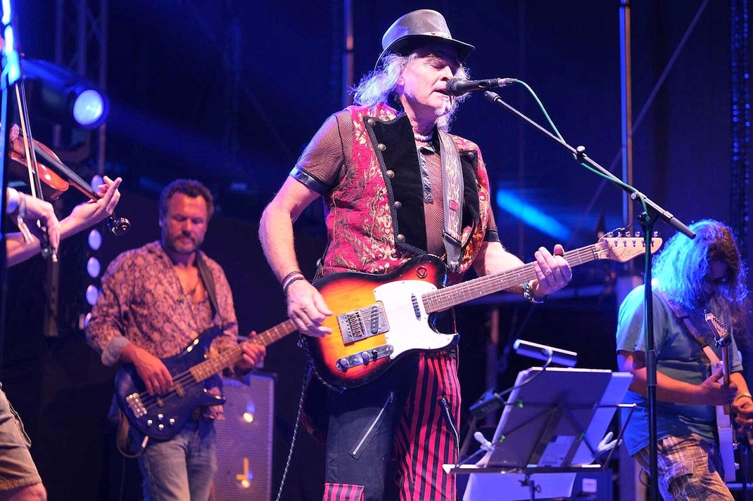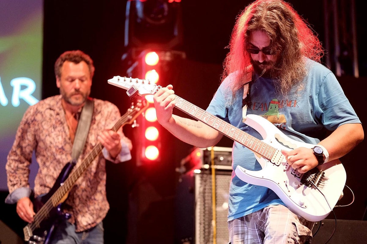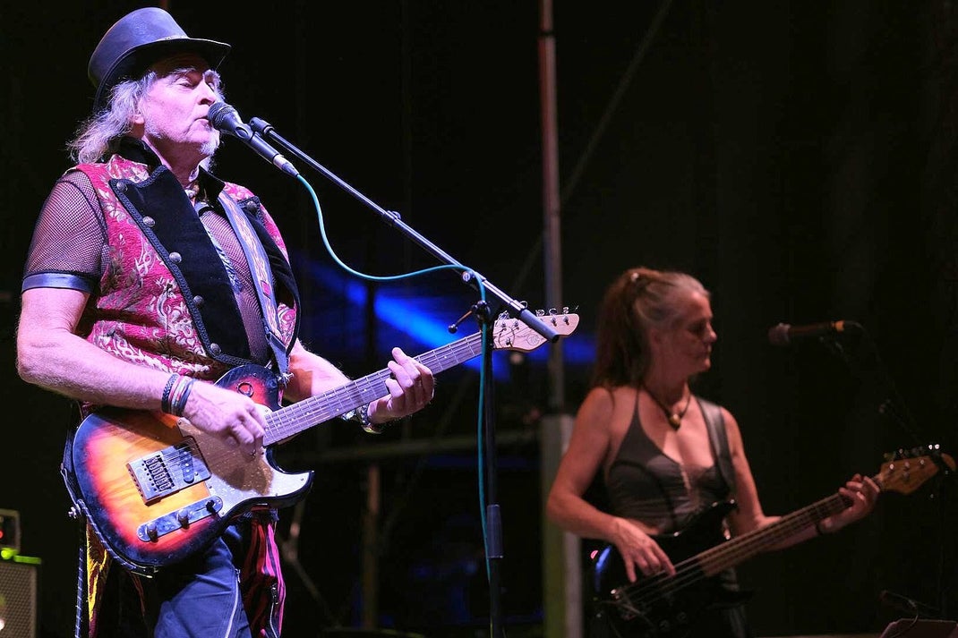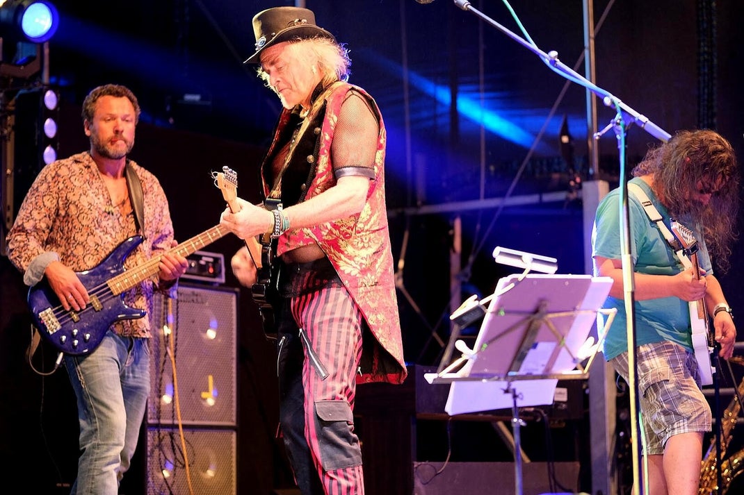 Und sich dann für die Zeit des Festivals häuslich einrichten. Nach getaner Arbeit, sitzt man dann meist gesellig beieinander und erfreut sich bei Kulinarik und Gequatsche des Lebens, dazu passt natürlich auch Musik und Tanz. Das war auch schon vor 150 Jahren in den großen Weiten eines kolonisierten Kontinents so, wo vor allem die versklavten Menschen so zusammenkamen. Das war die Geburtsstunde des Blues, der die Wurzel bildete für einen Großteil der populären Musik; Jazz, Rock ’n’ Roll, Rock, Soul und Funk. Im Feriendorf Auenland in Waffenrod hat es mit gleicher Intension ebenso klein und bescheiden angefangen. Melanies Mann Ralf Peter organisiert inzwischen die gewachsene Woodstock Forever Jam Gang bestehend aus befreundeten Musiker, die als Sixty Amp Fuse zur Freude der Besucher mit einer offenen Jam Session das Festival traditionsgemäß am ersten Abend eröffnen. Die Bühne, teils proppenvoll mit jederzeit willkommenen, spielfreudigem, erfahrenem Musik-Personal aus Nah und Fern, wird zum regen Spielplatz für bluesige Mucke aller Art. Schwerpunkt ist aber, wie der Bandname schon sagt, schwerer, röhrenverstärkter Blues-Rock. Die jeweiligen circa 3-stündige Jam Sessions werden durch die Kern-Band organisiert, bilden das Fundament über die gesamte Spielzeit und begleiten wechselnde, zum Teil sehr renommierte Gäste bei ihren Vorträgen. Lasst euch überraschen wer diesmal gastiert !! B_T: Roland Koch, Bild oben rechts: Hartmut von Stauffenberg