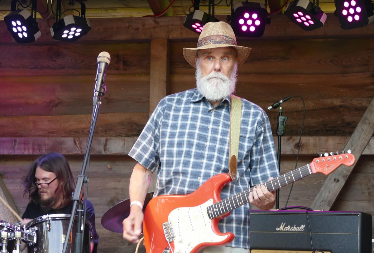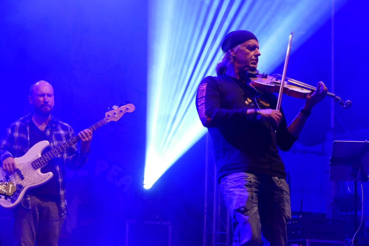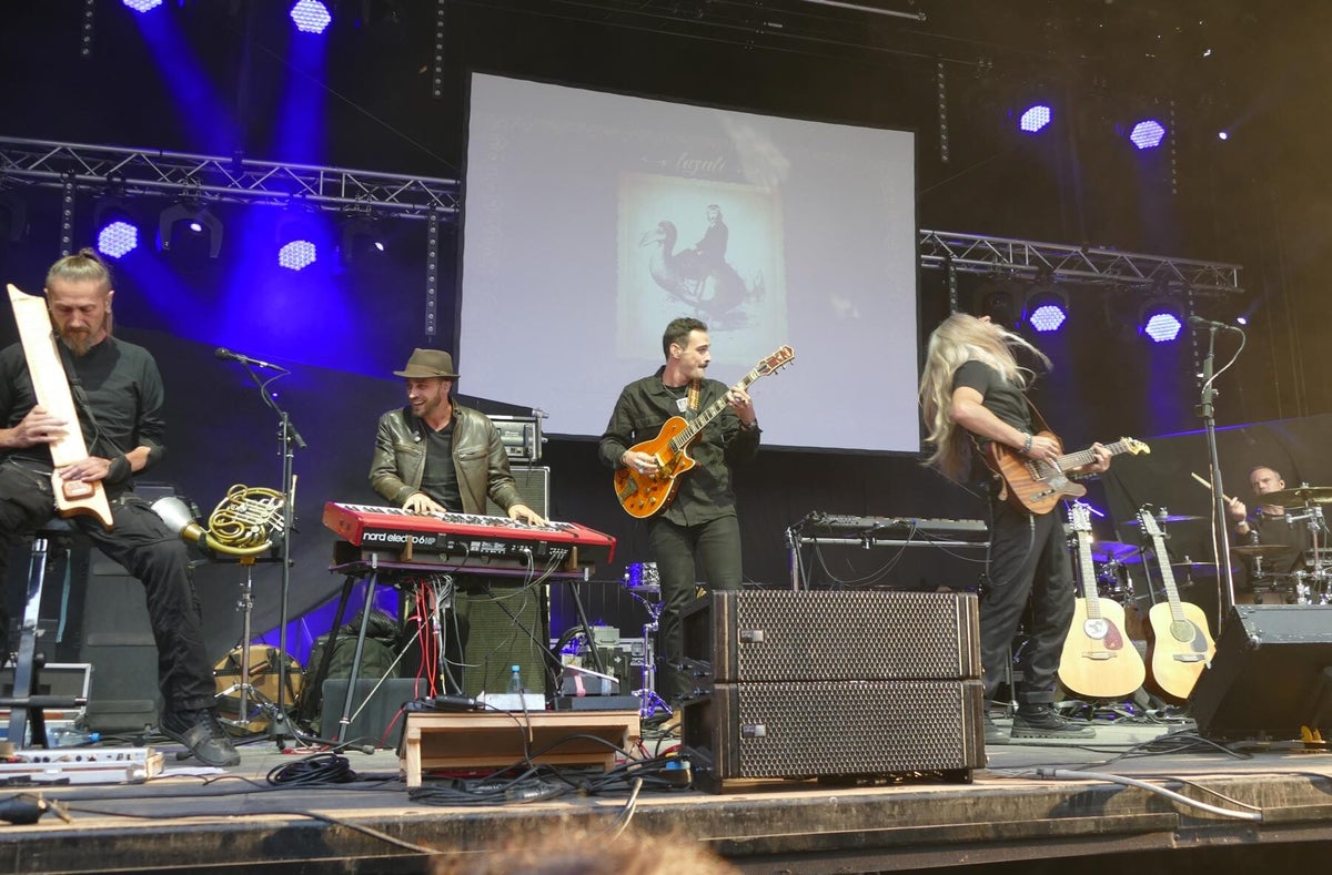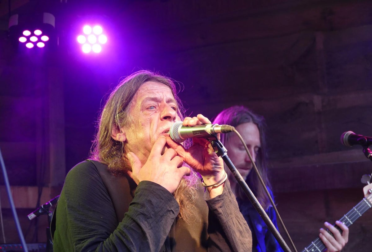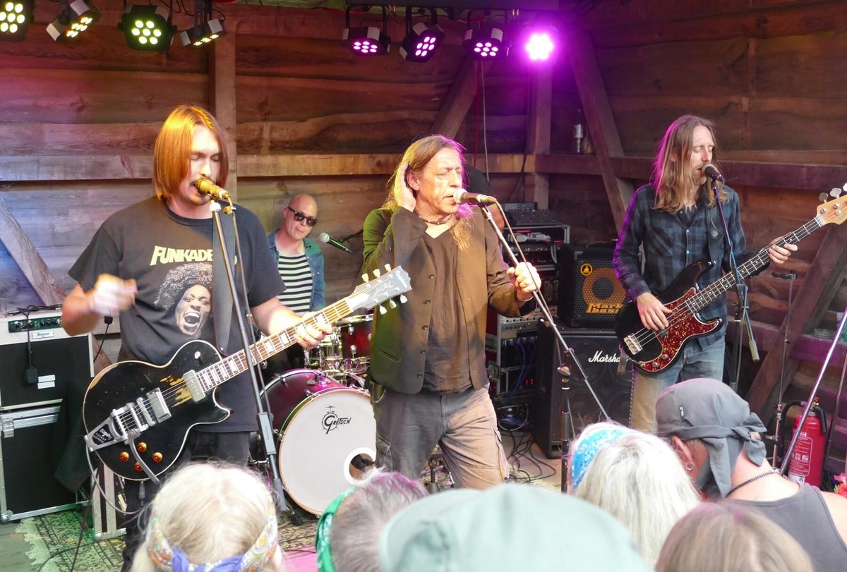 Haupt-Bühne – ATEMBERAUBEND wie Veranstalter Melanie und Michael das Thüringer Woodstock Forever Festival weiterentwickelt haben. 3 vollgepackte Tage, 3 exquisite Spielstätten, dort jeweils täglich 3 Konzerte, macht 27 Formationen Non-Stopp ohne zeitliche Überlappung und immer gut platziert sowie mit ausgezeichneter Spielfreude. Inzwischen Maßstab in jeder Hinsicht; Infrastruktur, Künstlerauswahl, Emotionalität; eben auch die gesamte Bühnentechnik inklusive Bedien-Personal ist Premium-Niveau. Das ist auch der Grund für diese üppige Berichterstattung. Und die Stars der Szene geben sich hier inzwischen freudig die Klinke in die Hand, besonders auf der Bühne unten an der Backstage-Scheune. Hierüber geht es nun im letzten Teil zu berichten. Die untere Bühne, abgeschirmt und am weitesten vom Camp entfernt, startet das geplante Tages-Programm als letzte Spielstätte, damit findet dort auch akustisch abgelegener von Frühschläfern und Ruhesuchende der Abschluss bis in die Morgenstunden statt. 2021 waren noch die alten Kraut-Rocker die dominierenden Künstler, diesmal die Blues-orientierten Formationen. Über viele habe ich im vorangegangen Text berichtet. Bereits Mittwochabend gab es Blues-Rock mit Sixty Amp Fuse und Voodoo Room, nach einer kurzen Nacht wird daran mit den Berlinern East Blues Experience genauso druckvoll angeknüpft. EBE wurde Anfang der 90er von Gitarrist Peter Schmidt gegründet, Ronny Dehn (Schlagzeug) und Jäcki Reznicek (Bass), beide auch Silly-Urgesteine, sind seitdem treue Weggefährten und mit Adrian Dehn auch heute an Bord. EBE haben massig eigenes Material, nach einer längeren Pause sind sie aktuell wieder taufrisch unterwegs, präsentieren wie eine US-Südstaaten-Band souverän das Material vom Album Live und Make It Better. Und auch der Mittelteil des Donnerstags bringt mit Man Legenden ins Rampenlicht. Bass-Zupfer Martin Ace, nun seit 1971 der absolute Dauerbrenner dieser britischen Legende, wirkt immer noch vital und lebensfroh. Während des Auftritt genehmigt er sich eine Flasche Rotwein und kommt dadurch immer mehr in Schwung, reißt seine drei Kumpel Josh Ace, James Beck und Shane Dixon mit zu einem immer größeren Spektakel. Was geht denn hier ab und wohin soll das denn noch führen. Ab Mitternacht wusste ich es dann. Zu der skurrilen Elektro-Welt des progressiven Alternativ-Indie-Rock von Cato & Joost van Dijck und Gitarrist Daniel de Vries vom phänomenalen Amsterdamer Trio My Baby. Harter treibender Blues-Rock trifft auf moderne Elektro-Beats. Dass alles geschickt zusammengesetzt, mit ausgeklügelter Technik verfeinert sowie durch Licht- und Visual-Effekten verstärkt. Hier werden die Vorteile einer großen, volldigitalen Multimedia-Bühne besonders deutlich. Glasklarer, ausgewogener Klang, gekoppelt mit erstklassiger modernster Beleuchtung. Der Platz vor der Bühne ist erdrückend voll mit Feiernden, tanzend, glücklich strahlend, Publikum und My Baby verschmelzen, hier startet ein reinrassiges, sommerliches Happening. Gut, das alles Freiluft stattfindet, sonst könnte das Hallendach in den erdnahen Orbit geschossen werden. Die letzte halbe Stunde genoss ich die unglaublichen Klanggewitter der jungen Niederländer angenehm zum Tagesausklang in meinem stabilen, mobilen Kastenwagen circa 300 Meter vom Epizentrum entfernt. Dennoch vibrierten die Einbaumöbel und Plexi-Fenster im Rhythmus der dröhnenden Musik. Aber auch auf dieser Bühne ist mal Schluss, DJ Electric aus der Schweiz übernimmt, alle ruhen danach und sammeln die Kräfte die sie auch brauchen werden. Denn die furiose Blues-Orgie geht übergangslos weiter mit der Hamburg Blues Band um Chef-Blues-Stimme Gert Lange. Von Gert’s ersten glasklaren Akkord an, waren alle im Umkreis der unteren Freifläche elektrisiert. Die diesmal zu viert mit Reggie Worthy, Eddie Filipp und natürlich Krissy Matthews angetretene Combo, hatte natürlich wie immer auch für Verstärkung gesorgt, allen voran crazy Arthur Brown, Tastenbediener Frank Tischer (Miller Anderson Band), Rotwein-Liebhaber Martin Ace (Man) und Anden-Flötist Sergio Cuadros (Flor De Loto). Und was hier über zwei Stunden geboten wurde, auch wenn es für einige abgedroschen klingt, war sicher wieder eine Sternstunde des Blues-Rock sowie Woodstock Forever Festival. Die Zuschauer und Musiker waren schier aus dem Häuschen, auch zeigte sich wieder was eine gute Organisation & Technik heraufbeschwören kann. Ich habe die HBB und Gäste sicher 3-Dutzendmal erlebt, aber selbst mich hat es hier diesmal schier aus den Stiefeln gehauen. Andere Melodien, aber die gleichen starken Emotionen. Die fünf französischen eruptiven Ethno-Rocker Lazuli braucht man inzwischen nicht mehr vorzustellen. Sie haben als Live-Superstars praktisch fast jedes bekannte Festival in Europa gespielt, überall die Menschen mit ihrer atemberaubenden Qualität und purer Lebensfreude mitgerissen. Die vielen Fans die sie hier bereits kannten, waren darüber nicht erstaunt. Flor De Loto dagegen, nach 36-stündiger ermüdender Anreise aus Lima (Peru) punktgenau fit wie die indianischen Mokassins, überraschten dagegen auf ganzer Linie und wurden als Tagessieger-Samstag zum Abschluss gekürt. Was alleine diese beiden Bands an Spiel/Lebensfreude und beim Publikum an Feierlaune entfachten, steht für die ganzen vier Tage über dieser sensationellen Veranstaltung. Wie am Vortag brennt ab Mitternacht die Luft. Diesmal hat das Schweden-Trio Kamchatka die Lunte gezündet. Grundzutaten für das explosive Destillat sind ausufernde Instrumentalorgien, riffbetonte Gitarrenarbeit, klassischer Rock der Geburtsjahre, aber nicht zu vergessen, wieder mal rauer Blues. DJ Bunzel übernimmt diesmal die Spätschicht !! Die einzige der neun Bands auf der Hauptbühne die nicht direkt mit Blues im Zusammenhang steht beginnt am Samstag. Riddim Of Zion ist eine Patchwork-Künstler-Kollektiv verschiedener Nationen. Die acht Tournee- und Studiomusiker haben bereits mit vielen bekannten Größe