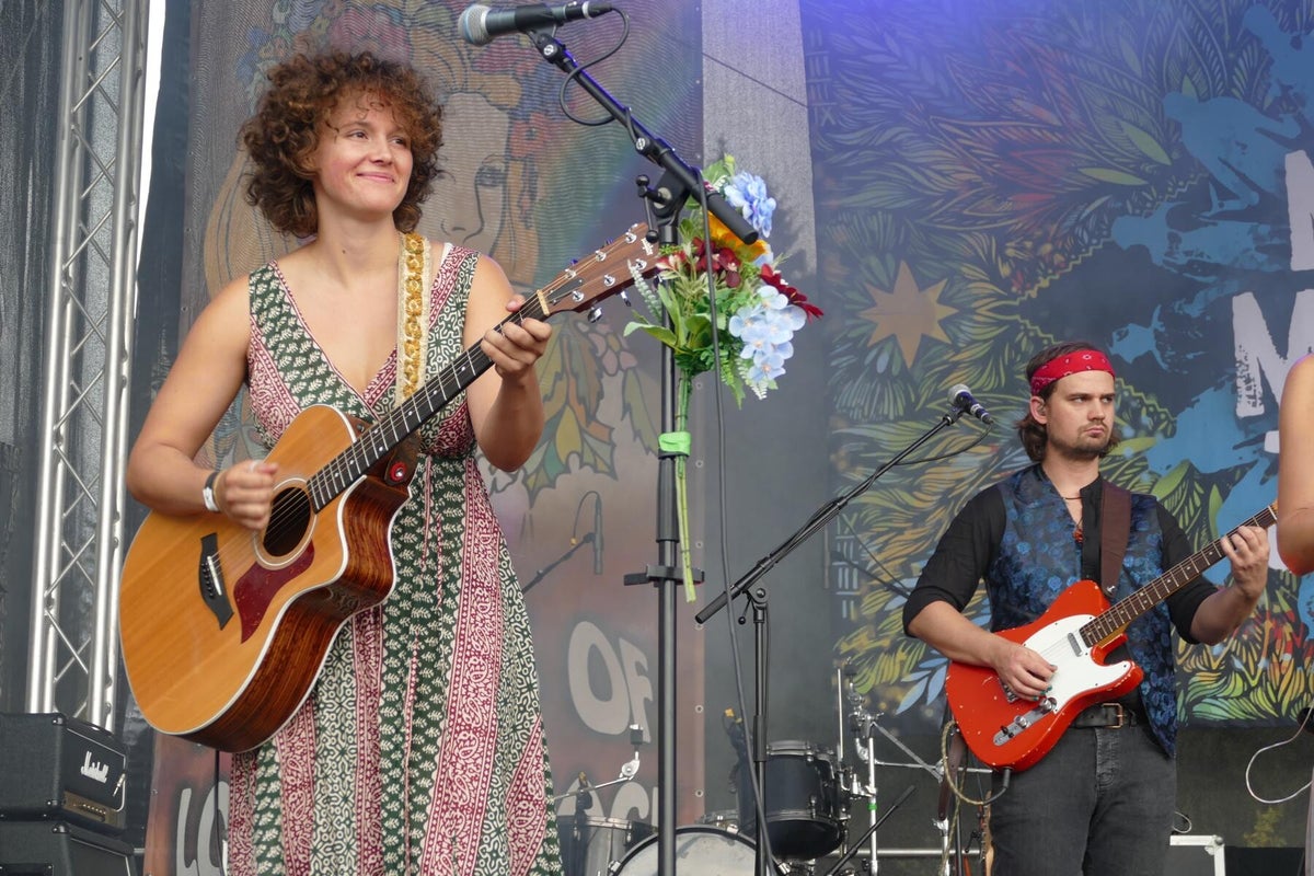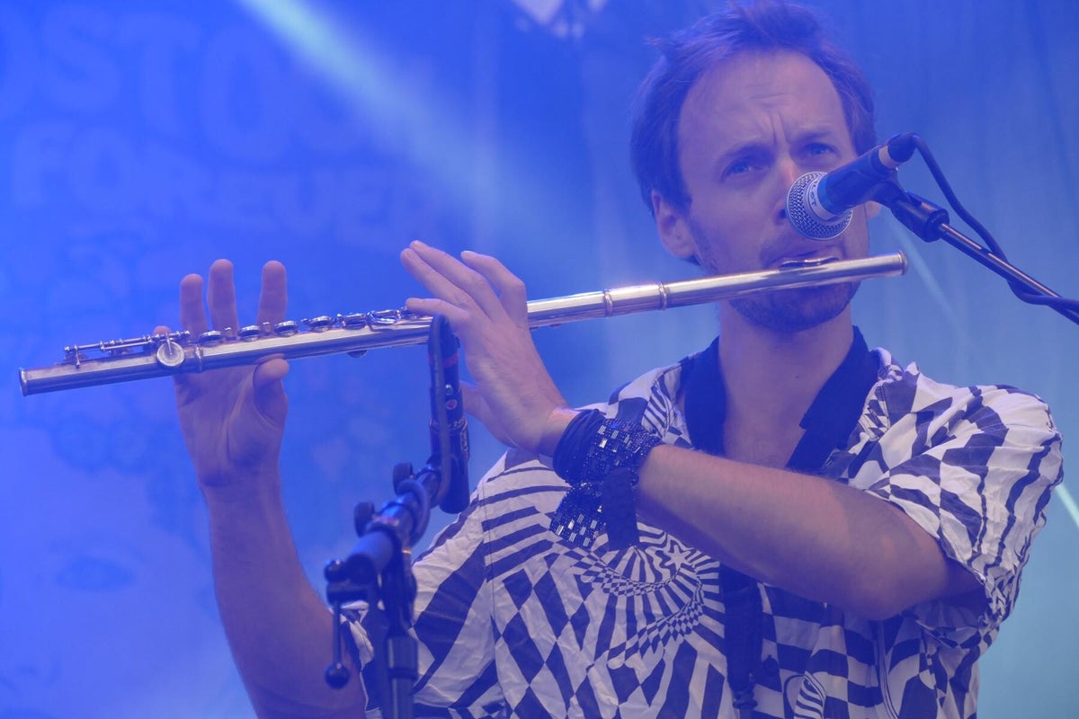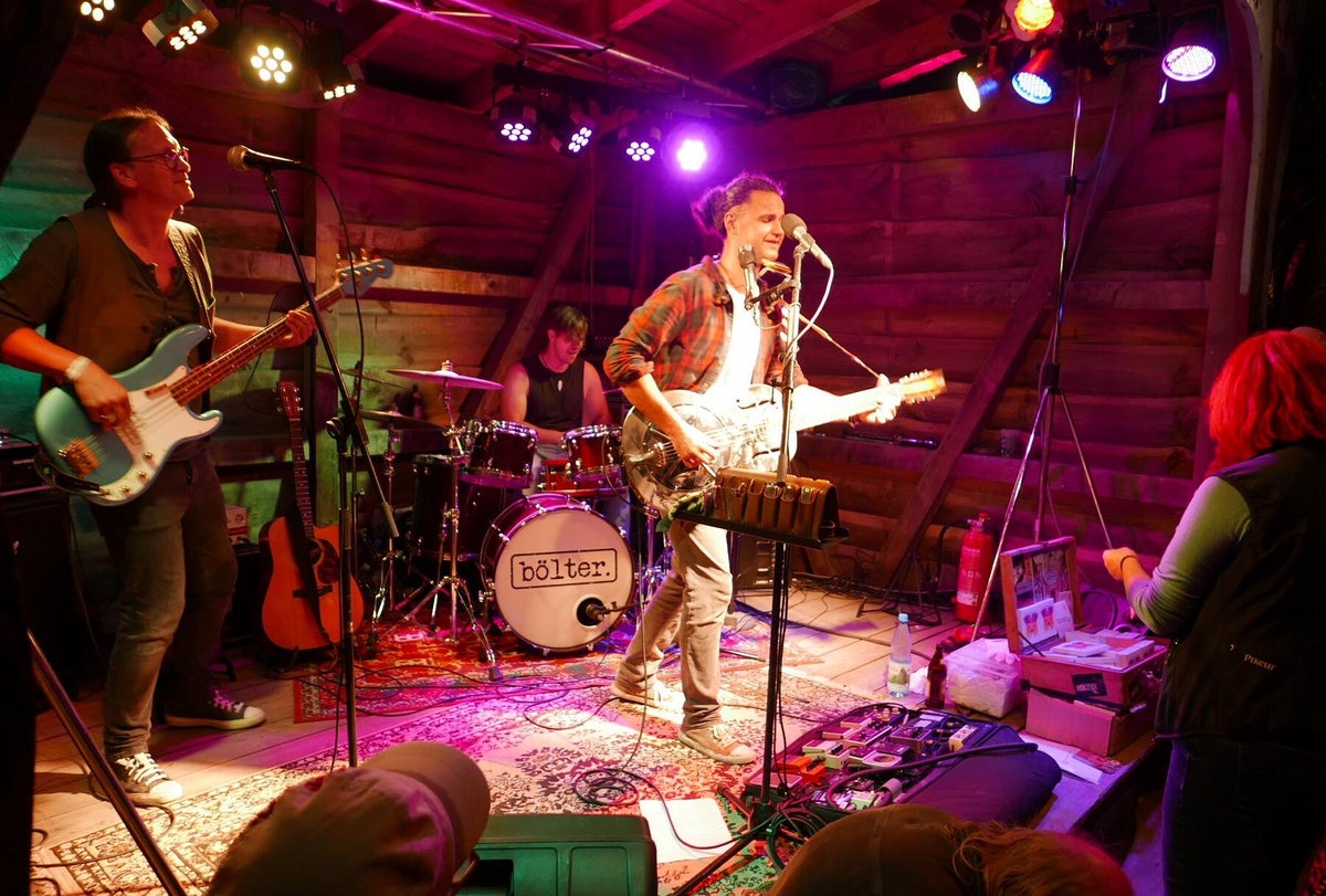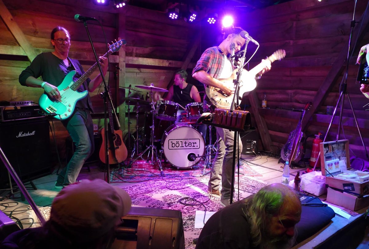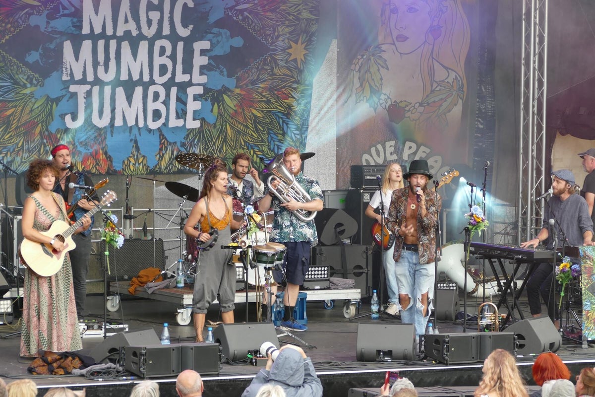 Haupt-Bühne – ATEMBERAUBEND wie Veranstalter Melanie und Michael das Thüringer Woodstock Forever Festival weiterentwickelt haben. 3 vollgepackte Tage, 3 exquisite Spielstätten, dort jeweils täglich 3 Konzerte, macht 27 Formationen Non-Stopp ohne zeitliche Überlappung und immer gut platziert sowie mit ausgezeichneter Spielfreude. Inzwischen Maßstab in jeder Hinsicht; Infrastruktur, Künstlerauswahl, Emotionalität; eben auch die gesamte Bühnentechnik inklusive Bedien-Personal ist Premium-Niveau. Das ist auch der Grund für diese üppige Berichterstattung. Und die Stars der Szene geben sich hier inzwischen freudig die Klinke in die Hand, besonders auf der Bühne unten an der Backstage-Scheune. Hierüber geht es nun im letzten Teil zu berichten. Die untere Bühne, abgeschirmt und am weitesten vom Camp entfernt, startet das geplante Tages-Programm als letzte Spielstätte, damit findet dort auch akustisch abgelegener von Frühschläfern und Ruhesuchende der Abschluss bis in die Morgenstunden statt. 2021 waren noch die alten Kraut-Rocker die dominierenden Künstler, diesmal die Blues-orientierten Formationen. Über viele habe ich im vorangegangen Text berichtet. Bereits Mittwochabend gab es Blues-Rock mit Sixty Amp Fuse und Voodoo Room, nach einer kurzen Nacht wird daran mit den Berlinern East Blues Experience genauso druckvoll angeknüpft. EBE wurde Anfang der 90er von Gitarrist Peter Schmidt gegründet, Ronny Dehn (Schlagzeug) und Jäcki Reznicek (Bass), beide auch Silly-Urgesteine, sind seitdem treue Weggefährten und mit Adrian Dehn auch heute an Bord. EBE haben massig eigenes Material, nach einer längeren Pause sind sie aktuell wieder taufrisch unterwegs, präsentieren wie eine US-Südstaaten-Band souverän das Material vom Album Live und Make It Better. Und auch der Mittelteil des Donnerstags bringt mit Man Legenden ins Rampenlicht. Bass-Zupfer Martin Ace, nun seit 1971 der absolute Dauerbrenner dieser britischen Legende, wirkt immer noch vital und lebensfroh. Während des Auftritt genehmigt er sich eine Flasche Rotwein und kommt dadurch immer mehr in Schwung, reißt seine drei Kumpel Josh Ace, James Beck und Shane Dixon mit zu einem immer größeren Spektakel. Was geht denn hier ab und wohin soll das denn noch führen. Ab Mitternacht wusste ich es dann. Zu der skurrilen Elektro-Welt des progressiven Alternativ-Indie-Rock von Cato & Joost van Dijck und Gitarrist Daniel de Vries vom phänomenalen Amsterdamer Trio My Baby. Harter treibender Blues-Rock trifft auf moderne Elektro-Beats. Dass alles geschickt zusammengesetzt, mit ausgeklügelter Technik verfeinert sowie durch Licht- und Visual-Effekten verstärkt. Hier werden die Vorteile einer großen, volldigitalen Multimedia-Bühne besonders deutlich. Glasklarer, ausgewogener Klang, gekoppelt mit erstklassiger modernster Beleuchtung. Der Platz vor der Bühne ist erdrückend voll mit Feiernden, tanzend, glücklich strahlend, Publikum und My Baby verschmelzen, hier startet ein reinrassiges, sommerliches Happening. Gut, das alles Freiluft stattfindet, sonst könnte das Hallendach in den erdnahen Orbit geschossen werden. Die letzte halbe Stunde genoss ich die unglaublichen Klanggewitter der jungen Niederländer angenehm zum Tagesausklang in meinem stabilen, mobilen Kastenwagen circa 300 Meter vom Epizentrum entfernt. Dennoch vibrierten die Einbaumöbel und Plexi-Fenster im Rhythmus der dröhnenden Musik. Aber auch auf dieser Bühne ist mal Schluss, DJ Electric aus der Schweiz übernimmt, alle ruhen danach und sammeln die Kräfte die sie auch brauchen werden. Denn die furiose Blues-Orgie geht übergangslos weiter mit der Hamburg Blues Band um Chef-Blues-Stimme Gert Lange. Von Gert’s ersten glasklaren Akkord an, waren alle im Umkreis der unteren Freifläche elektrisiert. Die diesmal zu viert mit Reggie Worthy, Eddie Filipp und natürlich Krissy Matthews angetretene Combo, hatte natürlich wie immer auch für Verstärkung gesorgt, allen voran crazy Arthur Brown, Tastenbediener Frank Tischer (Miller Anderson Band), Rotwein-Liebhaber Martin Ace (Man) und Anden-Flötist Sergio Cuadros (Flor De Loto). Und was hier über zwei Stunden geboten wurde, auch wenn es für einige abgedroschen klingt, war sicher wieder eine Sternstunde des Blues-Rock sowie Woodstock Forever Festival. Die Zuschauer und Musiker waren schier aus dem Häuschen, auch zeigte sich wieder was eine gute Organisation & Technik heraufbeschwören kann. Ich habe die HBB und Gäste sicher 3-Dutzendmal erlebt, aber selbst mich hat es hier diesmal schier aus den Stiefeln gehauen. Andere Melodien, aber die gleichen starken Emotionen. Die fünf französischen eruptiven Ethno-Rocker Lazuli braucht man inzwischen nicht mehr vorzustellen. Sie haben als Live-Superstars praktisch fast jedes bekannte Festival in Europa gespielt, überall die Menschen mit ihrer atemberaubenden Qualität und purer Lebensfreude mitgerissen. Die vielen Fans die sie hier bereits kannten, waren darüber nicht erstaunt. Flor De Loto dagegen, nach 36-stündiger ermüdender Anreise aus Lima (Peru) punktgenau fit wie die indianischen Mokassins, überraschten dagegen auf ganzer Linie und wurden als Tagessieger-Samstag zum Abschluss gekürt. Was alleine diese beiden Bands an Spiel/Lebensfreude und beim Publikum an Feierlaune entfachten, steht für die ganzen vier Tage über dieser sensationellen Veranstaltung. Wie am Vortag brennt ab Mitternacht die Luft. Diesmal hat das Schweden-Trio Kamchatka die Lunte gezündet. Grundzutaten für das explosive Destillat sind ausufernde Instrumentalorgien, riffbetonte Gitarrenarbeit, klassischer Rock der Geburtsjahre, aber nicht zu vergessen, wieder mal rauer Blues. DJ Bunzel übernimmt diesmal die Spätschicht !! Die einzige der neun Bands auf der Hauptbühne die nicht direkt mit Blues im Zusammenhang steht beginnt am Samstag. Riddim Of Zion ist eine Patchwork-Künstler-Kollektiv verschiedener Nationen. Die acht Tournee- und Studiomusiker haben bereits mit vielen bekannten Größe