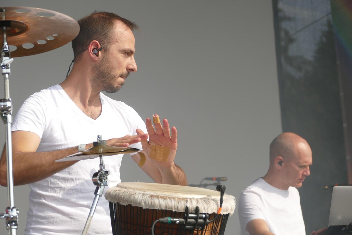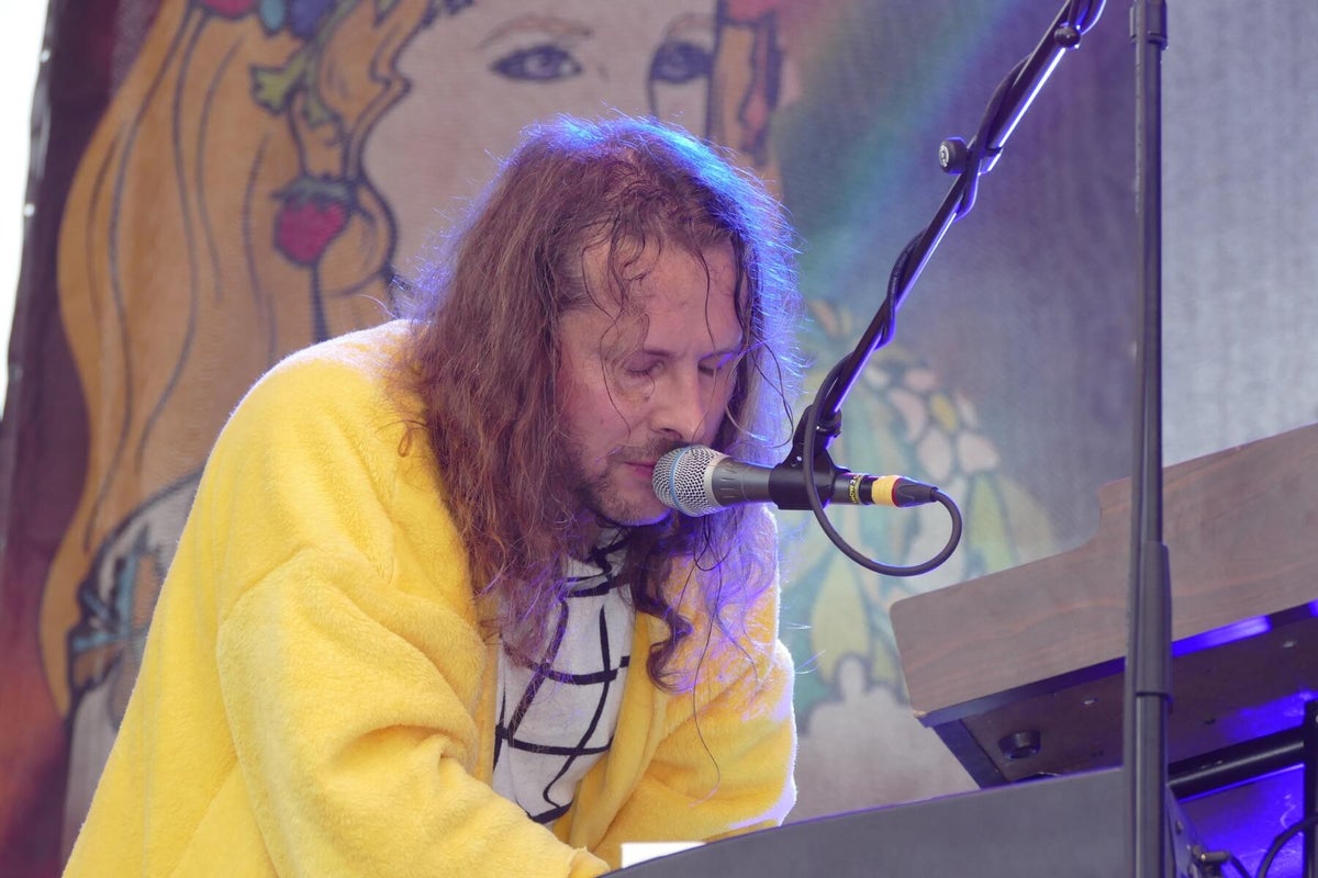 Wald-Bühne – Die habe ich am Mittwochabend schon das erste Mal inspiziert, die Techniker waren zu später Stunde noch fleißig mit den finalen Arbeiten beschäftigt. Chef der Technik-Mission Elias von LS Professional verriet mir, das er Michael empfohlen hatte beide Bühnen gleich hochwertig auszustatten. Und das schon vorweg: es hat sich echt gelohnt!! Hier beim Woodstock Forever Festival werden wie im italienischen Veruno beim 2 Days Prog + 1 nunmehr Maßstäbe in punkto Gelände, Personal, Infrastruktur, Technik, Wohlfühlen gesetzt. Hier ist der Künstler König und die Gäste sind kaiserliche Hoheiten !! Was in Italien auf einer Bühne abgeht, hier gibt es sogar zwei gleichwertige Spielstätten mit Mega-Programm. Die imposante Wald-Bühne, mit täglicher Startzeit mittags, sieht man schon von weitem, der Weg dorthin ist gesäumt von Ständen aller Art und führt direkt, vorbei am geschickt platzierten Technik-Zelt, vor die große Bühne. Alles eingefasst mit Gitternetzzäunen die komplett verhangen sind mit bunten Bannern der letzten Festivals. Das Gefühl man schreitet in eine der großen überdachten Musik-Tempeln der Metropolen drängt sich einem auf. Der Unterschied ist, kein Hallendach vorhanden und der Blick geht offen in den Himmel und Wald. Schon zum Festival-Start steht mit der zierlichen Cynthia Nickschas eine renommierte und bereits mehrfach ausgezeichnete, wenn auch in der Rockszene noch nicht so bekannten Musikerin, mit ihren sechs großgewachsenen Friends auf den Bühnen-Brettern. Sie spielt ein Lieder-Potpourri aus ihrer 10-jährigen Karriere und das breite musikalische Spektrum ist genau das richtige für die sich langsam versammelte Schar von Zuhörern. Ich zitiere mal aus einer Laudatio: „Du triffst den Nerv Deines Publikums so vibrierend, so präzise und so dauerhaft.“ Das kann ich bestätigen, der Vortrag dieser jungen bayrischen Künstlerin und ihrer versierten Combo macht Appetit auf mehr. Und das mehr kommt später ebenso aus Bayern von einer Band mit komplett anderer Musik. Ungewöhnlich für die hypnotischen Orange ist die frühe Tageszeit. Normalerweise tritt das rhythmische Natural-Trance-Projekt um Gesangsakrobat Rainer Von Vielen und Schlagzeuger Jürgen Schlachter fast immer zum Tagesabschluss an, dann meist in Lichtkaskaden, Laserstrahlen, Nebelschwaden gehüllte Endlos-Jam-Sessions. Aber Michael geht Risiko und gewinnt. Der Auftritt wird trotz des sonnigen Nachmittags zu einem kollektiven Feiererlebnis, endlich kann man die ganz in weiß gewandeten Männer mal bei ihrer schweißtreibenden Arbeit an Trommeln, Didgeridoo und Synthesizern gut beobachten, und die Wirkung ist ähnlich wie nachts. Der dritte Streich am Donnerstag ist die britische Blues-Rock-Legende Hundred Seventy Split, die passend zum Festival das gesamte TYA-Programm vom legendären 69-Woodstock spielen. Von Love Like A Man bis I’m Going Home ist es ein Pafoursritt durch das klassische Material von Ten Years After, aber auch das HSS-Material fügt sich gut ein. Für viele, auch für mich als Blues-Rocker, ein Filetstück des Festivals. Am nächsten Morgen geht früh der Sound-Check los, ich kann die Bühne von meiner Schlafstätte gut beobachten. Dank Organisations-Chefin Melanie habe ich einen Standplatz mitten im Dorf. Und gleich zu Mittag brodelt es oben am Waldrand. Mit B.I.R.D. steht eine Gruppe junger deutscher Musiker auf der Bühne, interpretieren gekonnt bekannte Mega-Hits der 60er bis 80er, sie selbst waren da alle noch nicht geboren. Und so gut, das man meint die Originalen spielen hier auf. Michael hat mit seinem Woodstock-Riecher – zurück zu den Wurzeln, zurück zu Liebe, Frieden, Hippie 60er – die sensationelle Qualität dieser Truppe früh erkannt und sie bereits für weitere Events gebucht. Mich haben Katz & Philipp Graf, Marko Burkhart, Jonas Jenet, Tobias Schwarz, Chris Geenen mit ihrem Mix der Ohrwürmer im zeitgemäßen Gewand restlos begeistert. Vielen anderen ging es ebenso, das konnte man bei der Besucherzahl und in deren Gesichtern sehen. Und mit frischer, tanzbarer Folk-Jazz-Pop-World Klangwelt und Tanzeinlagen aus den Niederlanden geht es am Waldrand in die nächste Runde. Unser Bild-Reporter Marvin Brauer war letztes Jahr schon völlig begeistert: die herzlichste Band des Wochenendes. Jetzt verstehe ich es endlich. Warum einen Aerobic-Kurs besuchen, hier beim achtstimmigen Multi-Instrumental-Ensemble The Magic Mumble Jumble um die authentischen Vorturner Leah Uijterlinde und Paul Istance ist kollektives gemeinsames Fitmachen Band & Publikum ein wichtiger Teil der gemeinsamen Zeit. Ich stehe auf dem erhöhten Wall, ein ständiges zucken in allen Gliedmaßen, für mich ist es sehr ergreifend, diese große Masse an fröhlichen Menschen jeden Alters in herzlicher Verbundenheit zu beobachten. Man spürt förmlich die pure positive Energie, die wunderbare Atmosphäre, den zeitlosen Geist von Woodstock Forever, hier und jetzt. Schön bei der Party dabei gewesen zu sein. Pausieren oder Weiterfeiern vor den anderen Bühnen?? Hier präsentiert erst zum späten Abend hin Dauergast Miller Anderson mit Blues-Band seine Lieder von zwei Dutzend Karrierestationen. Die Protagonisten aufzuzählen mit denen Woodstock-Veteran Mill bisher zusammengearbeitet hat, würde etwa so umfangreich sein wie dieser komplette Beitrag. Er ist krankheitsbedingt noch etwas angeschlagen, sitzt umringt von seinen vielen Saiten-Instrumenten etwas verloren mittig auf der Bühne. Band-Dompteur und Tastenmann Frank Tischer hatte ja bereits mit der Hamburg Blues Band als Gast auf der Hauptbühne seine Sternstunde des Woodstock Forever. Aber auch hier war, in seiner laut Mill besten Miller Anderson Formation, wieder verlass auf Frank. Das unaufgeregte, sehr präzise Gitarrenspiel in Kombination mit dem ausdrucksvollen Gesang des britischen Aushängeschilds trugen wie gewohnt das gesamte Konzert diese Rock-Dino. Die Sonne geht am Samstag auf und heute eröffnen die Plauener Polis die progre