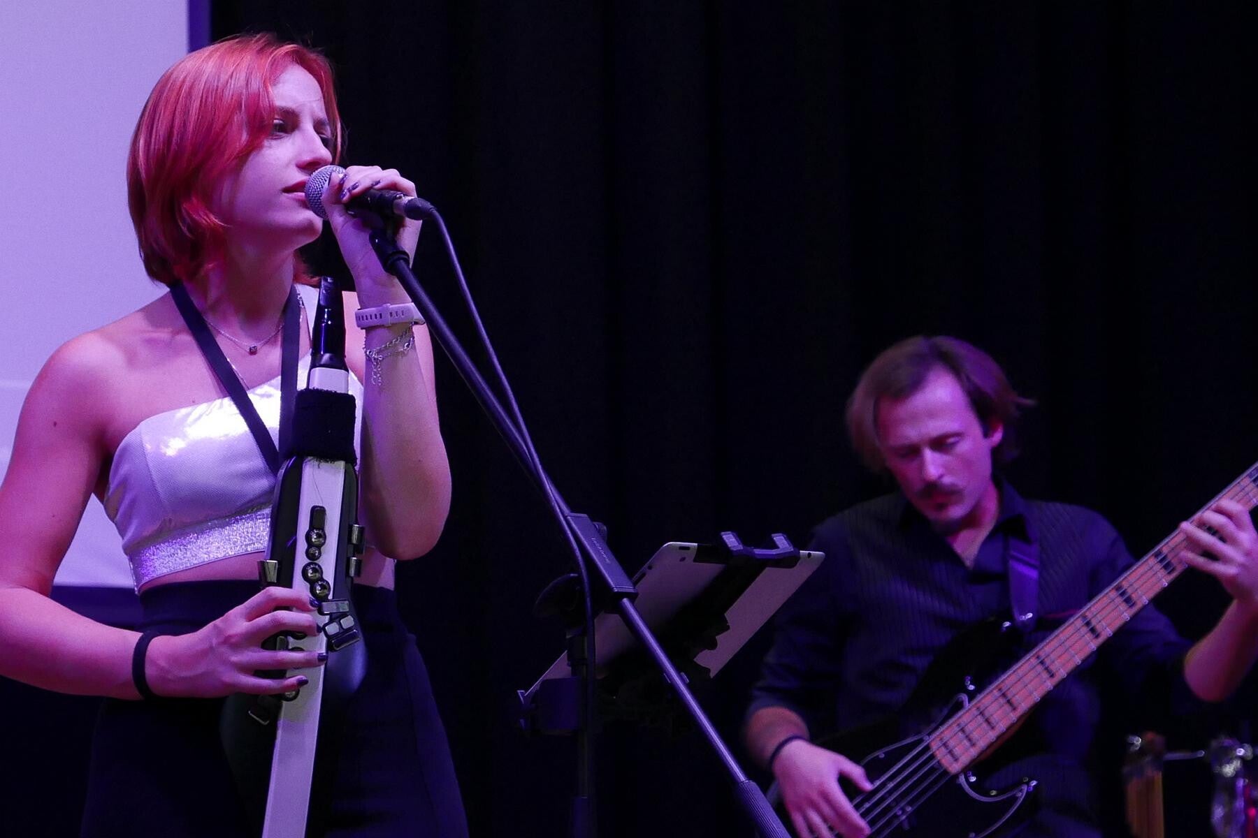 Sonntag_1 – Die Türen des Forum 19 werden am Sonntag eine halbe Stunde früher geöffnet, denn heute gibt es zwei Vorspeisen. Besonders die zweite lockt eine Vielzahl Gäste in das kleine Auditorium. Zunächst erleben wir mit dem Wilson Project eine junge Band aus dem Piemont, die sich dem Progressive Rock verschrieben hat. Die vier Musiker*innen, mit einem Altersdurschnitt von 23 Jahren, starteten ihr Bandprojekt vor über zwei Jahren. Zunächst spielten sie die ersten beiden Alben von PFM auf ihren Konzerten nach. Später wagten sie sich an Songs von Genesis und Emerson, Lake & Palmer. Doch Nachspielen reichte ihnen irgendwann nicht mehr, sie wollten eigene Songs kreieren. Im Ergebnis entstand ihr Konzept-Album Il Viaggio Da Farsi, das sie im Juli 2022 veröffentlichen konnten, und das heute Hauptbestandteil ihres Konzertes ist (Anmerkung Roland: mit Atto Primo, auf Deutsch Erster Akt, 05-2025 nun das zweite (!!) Album). Inspiriert vom Start von Elon Musks Falcon Heavy erzählt das Album die fiktive Geschichte einer Frau, die die Erde verlässt, um zum Mars zu reisen. Sie versucht, das Fehlen ihrer Welt zu kompensieren, indem sie auf dem neuen Planeten eine Kopie der alten Welt nachbaut. So sollte es nicht verwundern, dass Keyboarder Andrea Protopapa und Bassist Stefano Rapetti mit Raumanzug ähnlichen Hosen auftreten (Anmerkung Roland: Schlagzeug: Mattia Pastorino). Auf der Leinwand laufen während des Konzerts Filmsequenzen über einen Raumflug. Die Musik der Band ist oft erstaunlich komplex, ist geprägt von Tempowechseln und Gesangseinlagen, für die Sängerin Annalisa Ghiazza verantwortlich zeichnet. Nicht nur das, Annalisa spielt auch immer mal wieder auf dem EWI, dem Electric Wind Instrument mit dem man Klänge wie von Saxofon, Oboe, Flöte usw. erzeugen kann. Damit sorgt sie für interessante Klangfarben, die das Fehlen einer Gitarre nicht vermissen lassen. Auch wenn der Gesang von Annalisa manchmal etwas dünn und zerbrechlich klingt, zeugt die Band mit den Songs ihres Albums von Kreativität und Können. Der erste Preis des italienischen Band Contests „Intervallo…Prog“, der die Band schließlich hierhergeführt hat, ist verdient gewonnen. Firth of Fifth von Genesis dann noch zu covern, schreibe ich jugendlichem Übermut zu. Aus meiner Sicht hätte dieses Wagnis nicht notgetan.