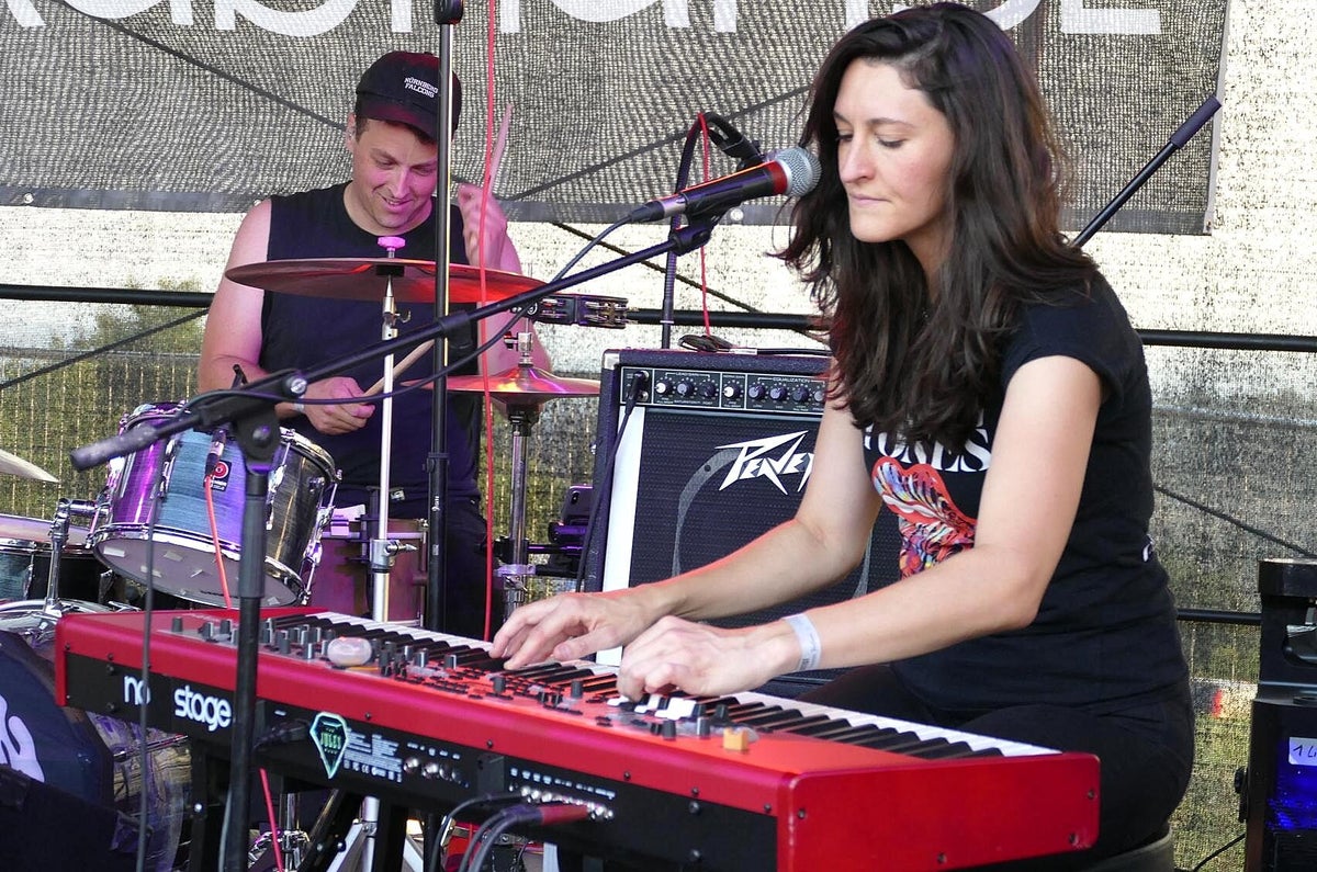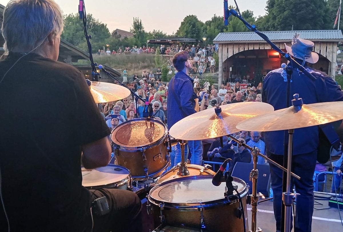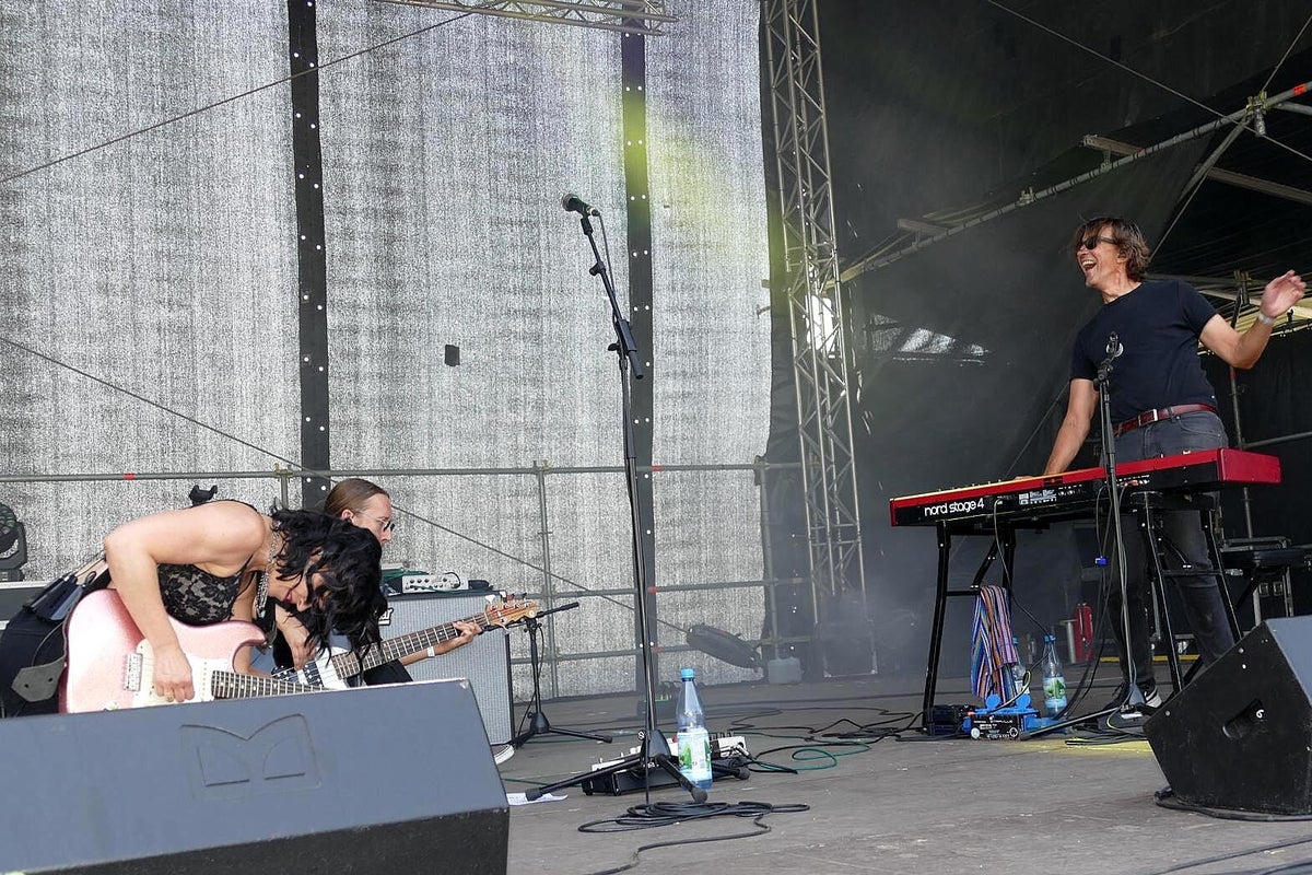 Karin Rabhansl Band – Es ist erstaunlich, welche Bandbreite an Musik immer wieder von Melanie und Michael für die Thüringer-Musik-Festspiele jedes Jahr zusammengestellt und außerdem erfreulicherweise hier dabei auch keinerlei hierarchische Unterschiede gemacht werden. Mit der Fränkin Karin Rabhansl und ihren Mitspielern Julia „Jules“ Fischer (Keyboards, Gitarre, Gesang), Joschi Joachimsthaler (Gitarre, Gesang), Simon Weber (Schlagzeug, Gesang), geht es noch rockiger weiter. Fischer & Rabe haben schon als Akustik-Duo auf der Lift-Bühne gastiert, diesmal bringt Karin nun die komplette Mannschaft mit nach Waffenrod. Ihre inzwischen sechs Werke sind punkig-frech, stets humorvoll und oft im niederbayerischem Dialekt, eine charmante besondere Attitüde. Textlich geht es dabei oft um Alltägliches, beispielsweise wie bei Außeinander, um laut streitende Nachbarn, die Karin einmal abhielten ihr Buch weiterzulesen. Optisch ist das sympathische spielfreudige Rock-Quartett verbunden durch hochgezogene buntgestreifte Socken, ein begehrter Artikel später am Merch-Stand. Julia trägt auf ihrer Brust die Rolling Stones, Joschi dagegen Ozzy Osbourne. Eine große Verbeugung vor diesen Helden, die aber auch die Bandbreite zeigt die in ihre eigene Musik einfließt. Eine besondere Überraschung stellt eine starke Interpretation The Four Horsemen von Aphrodite’s Childs dar. Der 666-Klassiker von Demis Roussos und Vangelis hat 53 Jahre auf dem Buckel und bekommt von dem Quartett hier reichlich neues Leben eingehaucht. Leider verhindert zwar der Zeitplan weitere Zugaben, doch dafür zieht es viele zum Merchandise, wo eine fröhliche Karin Rabhansl schon mit den Ringelsöckchen wartet. Die digitalen Präsentationen und das Promo-Material ist bei Karin und auch Yasi Hofer erstklassig, zwei Kollektive von jungen Helden:innen von denen wir in naher Zukunft noch einiges hören und sehen werden.
