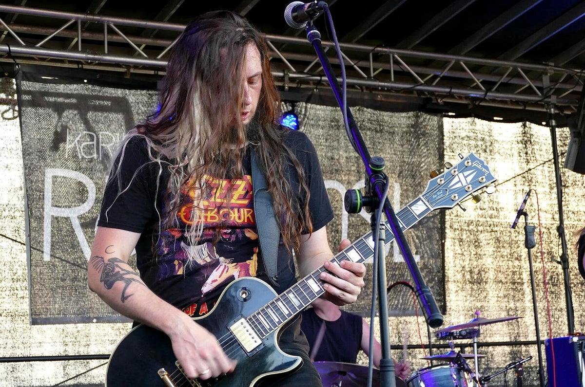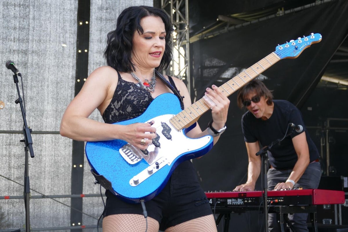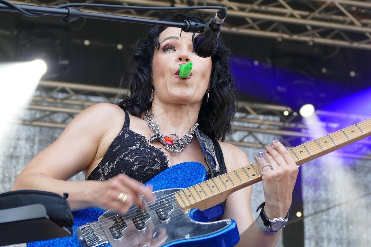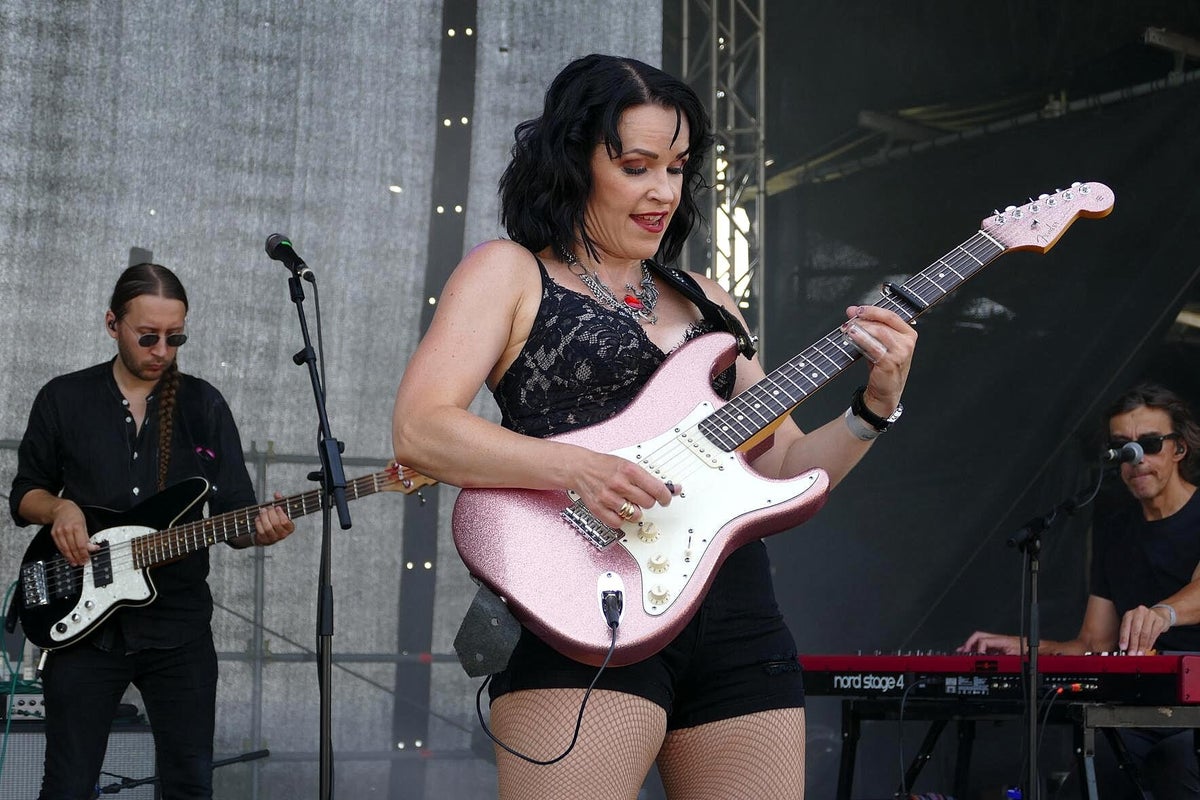 Erja Lyytinen – Der alterslose Elektrolurch Mani Neumeier, den haben wir mit Guru Guru ein paar Tage vorher beim Finkenbach Festival im Odenwald erlebt, hatte dort gesungen: „Living In The Woods.“ Eröffnet wird heute mit der geschäftstüchtigen und vielarbeitenden Finnin Erja Lyytinen aus Kuopio in Ostfinnland. Sie musiziert als Profi inzwischen fast 25 Jahre, ist eine der führenden Blues-Rock-Gitarristinnen auf dem internationalen Parkett, singt und spielt meisterlich die Slide-Gitarre und sogar Violine. Sie bringt Alben im Jahres-Rhythmus heraus und tourt regelmäßig. Jesse Lehto (Schlagzeug), Heikki Saarenkunnas (Bass) und Harri Taittonen (Keyboards, Hammond) sowie Techniker Uula Korhonen sind mit angereist und das Quartett bringt mit ihrem Repertoire aus überwiegend eigenem rockorientierten Material von Erja erfreulicherweise früh frischen Wind und ordentlich Bewegung auf das gut besuchte Gelände mitten im Wald. Aber auch auf der Bühne sieht man die Freude in den Gesichtern der Musiker, mit so einer Feierlaune der „frühen Vögel“ hatten sie hier wohl nicht gerechnet. Wenn wir die finnische Frontfrau auf der Bühne mit ihren Gitarren arbeiten sehen, glaubt man nicht, dass die Mutter von Zwillingssöhnen auch noch ein anderes Leben als Geschäftsfrau mit Format führt. Sie ist in Deutschland sehr beliebt, spielt hier öfter als in Schweden oder Norwegen und ist demnächst hierzulande wieder auf Tour.