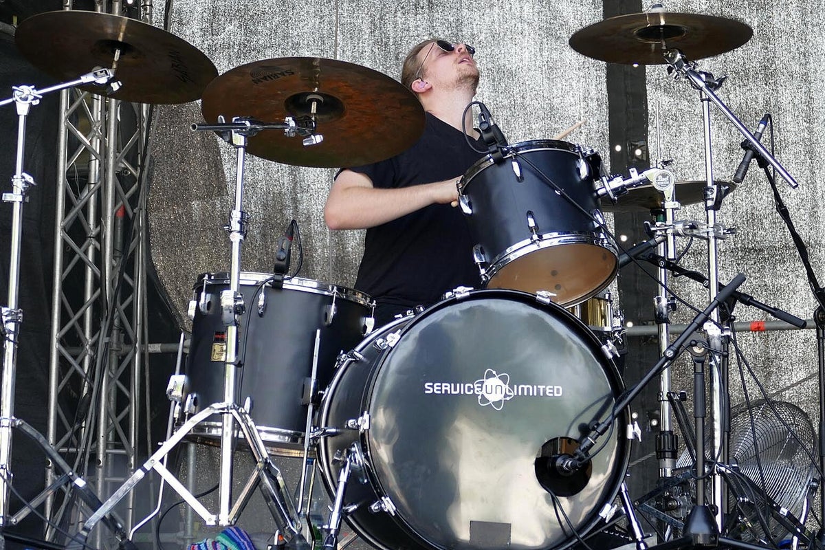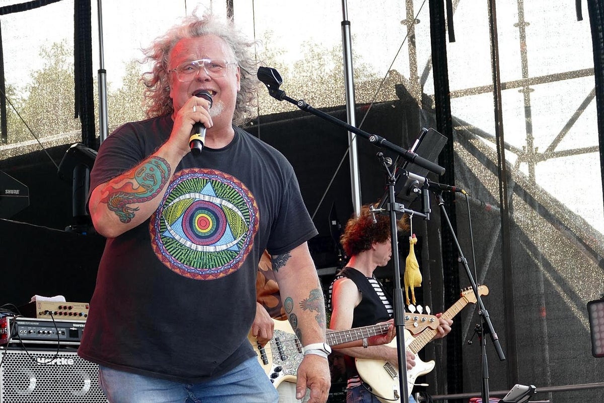 Frank Out! – Der tiefste Punkt auf dem Festival-Areal ist die Scheunenbühne. Die Besucher haben hier einen phänomenalen Blick wie bei einer klassischen Freilichtbühne, plus Fernsicht ins nahe Bayern. Hier ist über die letzten Jahre baulich immer etwas geändert worden, damit man dem zunehmenden Besucheraufkommen gerecht werden konnte. Dort unten vor der Bühne angekommen wird es dann wieder deutlich lauter, denn als Starter für die Scheunenbühne gibt es einen Frank Zappa Tribute, gespielt von der positiv-verrückten Truppe Frank Out! aus dem Hunsrück. Sie sind beim Woodstock Forever nach den Schweizern FiDO nun eine weitere Formation mit zappalesker Ausrichtung ihres Programms. Der pfälzische Zappa Thomas Jung (Keyboards) und seine fünf weiteren deutschen Musiker stehen ihren Kollegen dabei in nichts nach und beweisen, dass Zappas Musik jung geblieben ist und uns noch lange durch solche Formationen erhalten bleiben wird. Sind oben am Berg bei Namirí die Klang-Surfer auf ihre Kosten gekommen, haben an der Scheune die Liebhaber des frickeligen Rock ihr Musik-Futter bekommen. Ich greife vor, es wird wieder einmal für fast jeden Genre-Liebhaber etwas Passendes geboten. Auch für die jüngere Generation, beispielsweise mit Musenbiss oder Grusel Gewusel im Kinderland.