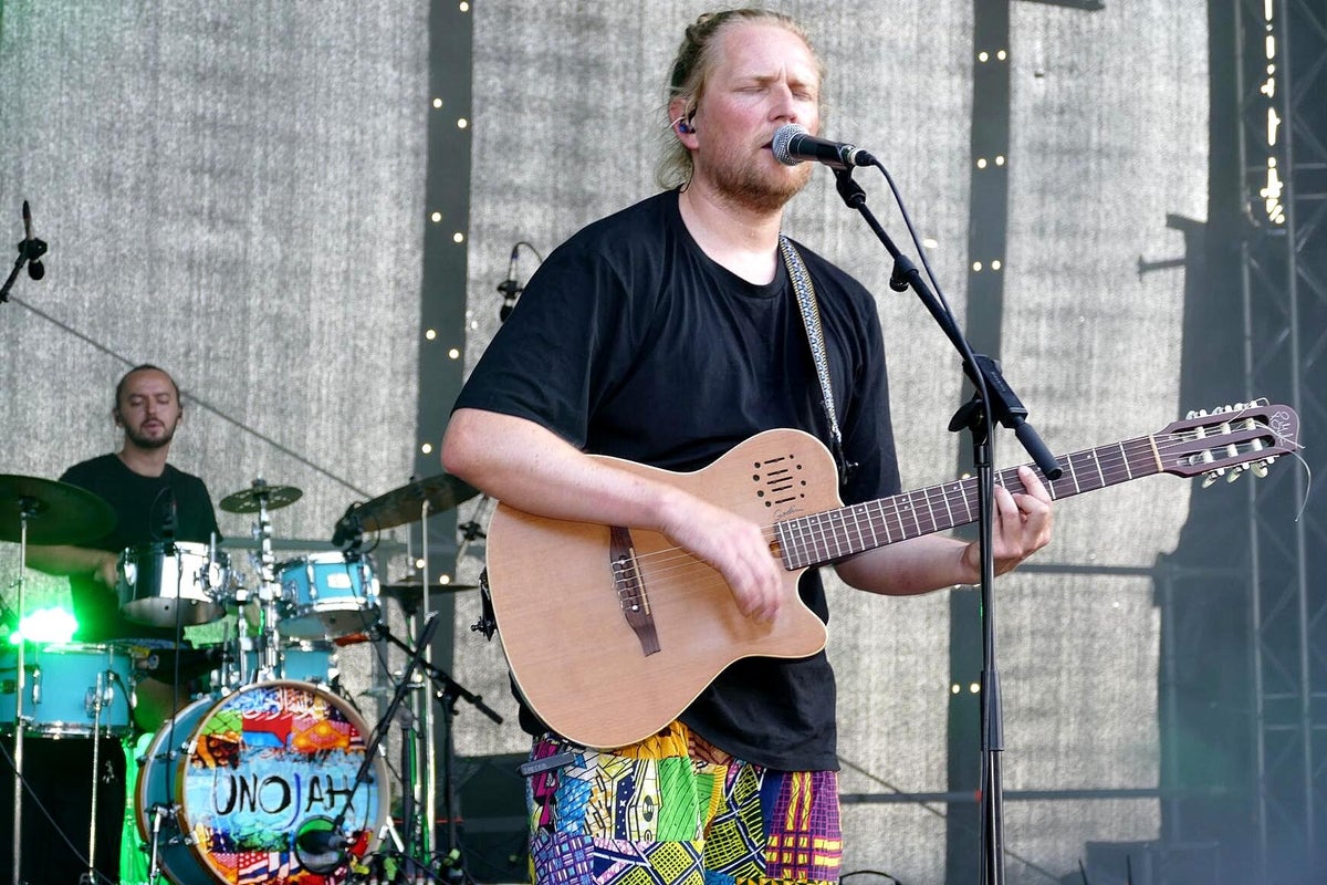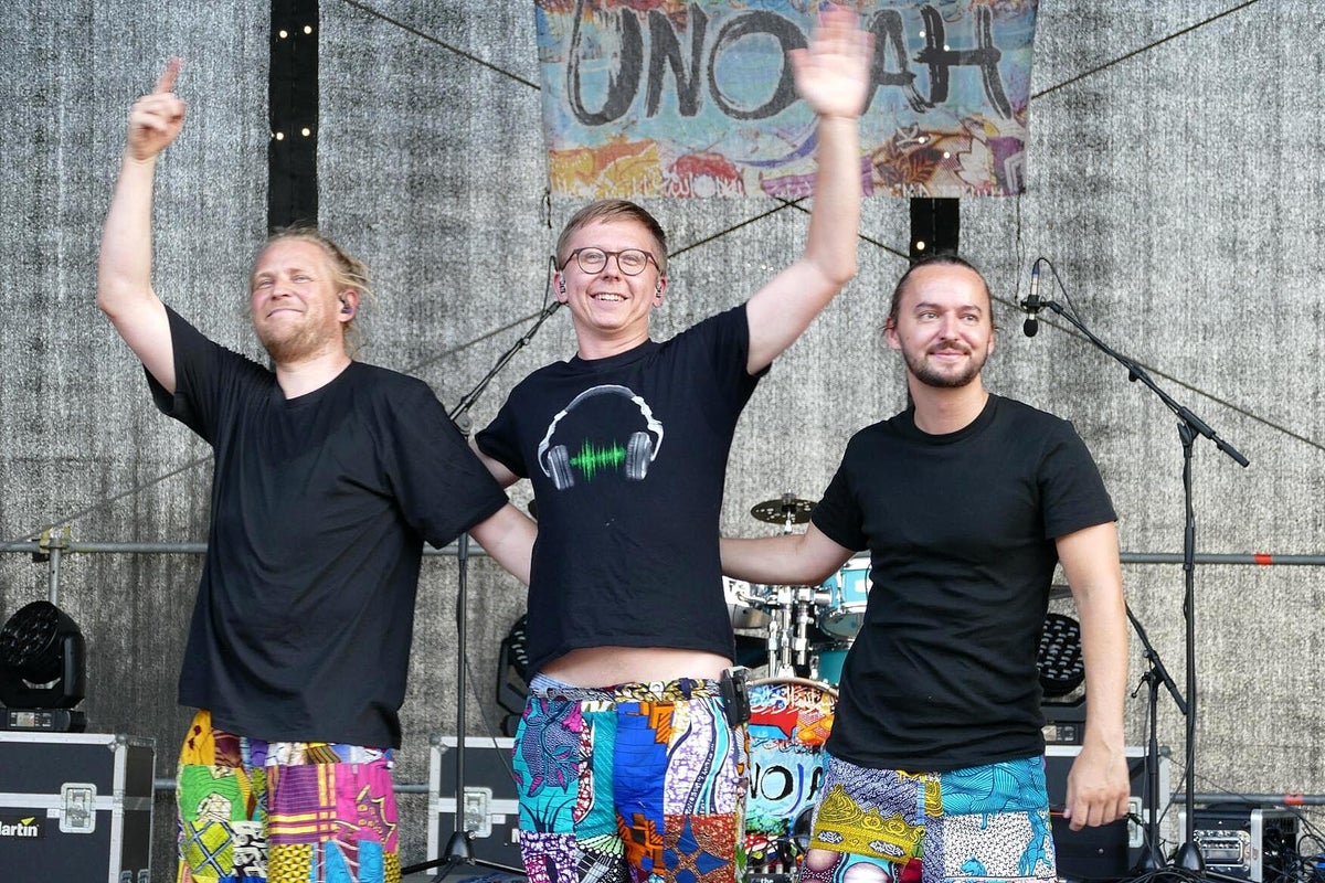 Unojah – Und kaum haben die Pfälzer Mothers Of Invention ihren Schlussakkord gespielt, wird oben im Gelände vom Häuptling Michael Memm schon die nächste Band angesagt: „Wer sich bewegen will, bekommt jetzt Gelegenheit dazu.“ Die nächsten anderthalb Stunden stehen im Zeichen von „Positive Vibrations“ und Sommer-Party mit dem Multi-Kulti-Reggae-Weltmusik-Kollektiv Unojah. Ähnlich wie bei Bukahara, Orange oder The Magic Mumble Jumble soll die Musik hier nicht nur mit den Ohren, sondern mit dem ganzen Körper zelebriert werden. Da sich nun im zweistufigen Gelände vor der Bühne noch mehr Feierwütige eingefunden haben und die Herz-Kreislauf-Systeme stimuliert werden könnten, steht der gemeinsamen anderthalb Stunden Party nichts mehr im Wege. Frontmann Chaldun Schrade: „Wir möchten hier nicht nur Musik machen, wir möchten auf die Reise gehen, den Planeten in all seinen schönen Farben feiern“. Die vielfältigen Zutaten dieses bunten Cocktails sind Reggae, Ska, Latin, Pop, Folk, Hip-Hop, orientalische- und Welt-Musik, kombiniert mit spirituellen Texten in den dazu passenden Sprachen dieser Welt. Bassist Joshua Hengstler fällt für diesen Auftritt zwar aus, Keyboarder Nico Elble übernimmt den Tieftonbereich, aber auch mit Schlagzeuger Johannes Leuschner nur zu dritt verschmelzen sie Einflüsse verschiedener Volksgruppen und Kulturen. Unojah, aus dem sonnenverwöhnten Breisgau, feiern eine Vielfalt, die für sie essenziell für ein Zusammenleben ist. Eine Botschaft, die selten so relevant war wie im Moment.