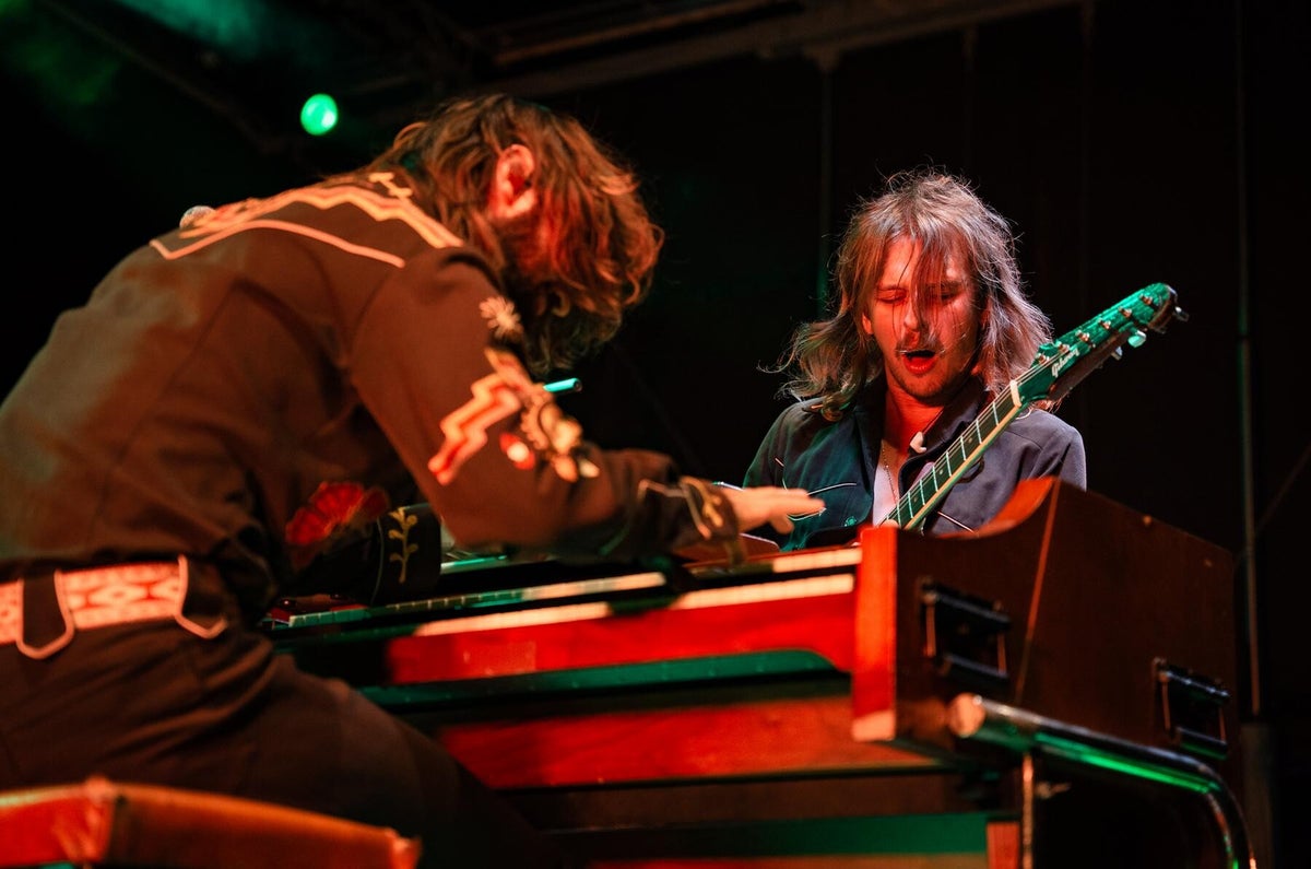 DeWolff – Mitternacht an der Scheune, Schalter auf Blues-Rock-Party. Wir haben die drei Niederländer schon getroffen und beim Technik-Check beobachtet. Das Trio steht schon in den Startlöchern, das Leslie der Hammond-Orgel rotiert trügerisch leise vor sich hin, jederzeit bereit sirenenhaft zu kreischen. Wir hatten bereits das Vergnügen DeWolff letztes Jahr beim Finkenbach Festival erleben zu dürfen. Dieses Triumvirat ist wie eine Dampflok unter Volldampf, die mit ihrer Mischung aus hochenergetischen, psychedelischen Blues- und Südstaaten-Rock sowie Funk & Soul jede Bühne der Welt sprichwörtlich in Flammen setzt. Bei ihrem ersten Plattenvertrag 2008 war das Trio DeWolff gerade einmal zwischen 14 und 17 Lenze alt. Luka und Pablo van de Pol liefern dabei bis heute an Schlagzeug und Gitarren, sowie auch Gesang, ab. Orgel-Oktopus Robin Piso stellt dabei nicht nur die Hammond-Sounds bereit, sondern navigiert mit seinen vier Gliedmaßen auch noch das gesamte Bass-Fundament. An Kraft und Virtuosität mangelt es ihnen gewiss nicht. Orgel und Gitarre liefern sich Duelle, eh sie zusammen wieder Bewegung in die Beine der Zuschauer bringen. Dank ruhiger Momente und guter Dynamik ermüdet sich dieses Konzept kaum. Auch der überraschende, aber etwas erwahrtbare, Black-Sabbath-Klassiker War Pigs, mit großer Verbeugung vor dem kürzlich verstorbenen Ozzy Osbourne, steht ihnen verdächtig gut zu Gesicht. Dafür gibt es heute auch nur eine Zugabe. Das Geheimnis: Rosita erstreckt sich auf die nächsten dreißig Minuten, inklusive Pablo’s dazugehörigen Besuch in die ersten Reihen des jubelnden Publikums. Alle Register wurden gezogen. Feierabend! Robin’s Orgel atmet endlich durch, die Verstärker-Röhren kühlen ab. Im DJ-Bereich werden aber die Verstärker hochgefahren und die Feierbiester, die immer noch nicht genug haben, bis 05:00 Uhr morgens mit Musik bedient.