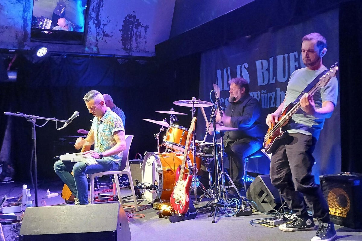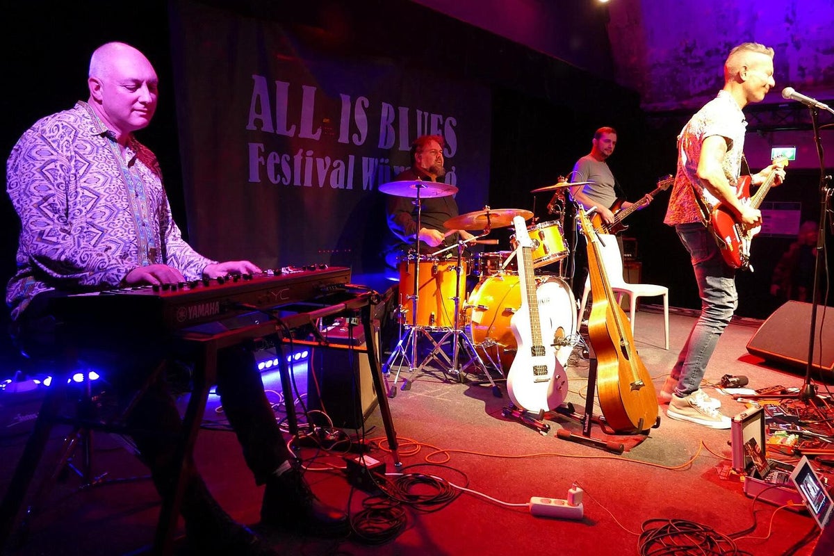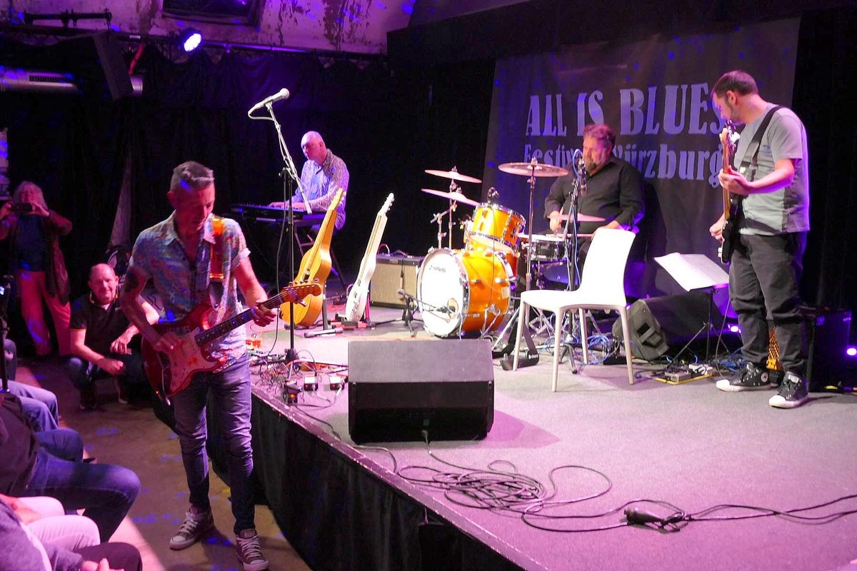 Und was gibt es am Samstag auf der schönen Bühne im imposanten Kellergewölbe des Club Z87. Zuerst einmal den erfahrenen Pfälzer Gitarrist, Sänger, Komponist, Produzent und Grafik-Designer Timo Gross, der mit seiner markanten Stimme und sein vielseitiges Gitarrenspiel seine Duftmarken gesetzt hat. Pfalz und Franken, da war doch noch was, genau, deutscher Qualitäts-Wein. Also hier verbindet nicht nur der Blues, sondern auch die hügelige Landschaft, Kulinarik und die Liebe zum deutschen Rebensaft. Er ist auch Winzer und bringt seinen eigenen Wein mit ins Frankenland. Da kann doch wohl nichts mehr schiefgehen. Timo spielt im Trio, wie auch Michael van Merwyk, bringt ebenso die zwei sehr erfahrenen Kollegen Matthias Scherer (Bass: Johnny Rieger Band, The Dynamite Daze) und Konrad Henkelüdeke (Schlagzeug: Alex Mayr, Casper) mit in den Keller Z87. Der dritte Gitarren-Frontmann in Folge, Michael der bescheidene Geschichtenerzähler, Andrea der virtuose Gitarrenheld, nun Timo der Blues-Rebell. Von der ersten Minute an ist Alarm auf der Bühne und man erfährt eine Menge über Konrad, Timo und den Tourbus-Fahrer Matthias. In unserer Berichterstattung stoßen wir bei der Recherche immer wieder auf diese drei Namen. Zwangsläufig, denn was diese drei Musiker schon alles in ihren Lebensläufen stehen haben ist gewaltig, sprich: beeindruckend !! Timo beschäftigt sich seit Ende der 70er mit Rock-Musik, hat in einer unüberschaubaren Anzahl von Projekten mitgearbeitet, das Studio und die Bühne mit vielen prominenten Kollegen geteilt. Ab 2004 tritt er dann als Solist und Projekt-Partner deutlicher in das Licht der Blues-Szene, arbeitete mit den deutschen Schwergewichten dieses Genres zusammen, beispielsweise mit Gregor Hilden, Richie Arndt (siehe Portrait), Alex Conti (siehe Werkschau). Diesmal vertritt ein weiterer Held die heimische Blues-Szene beim All Is Blues Festival. Und Timo arbeitet sich durch sein Programm, Material hat er ja massig, die widerspenstige Technik wird niedergerungen und der heiß-laufende Blues-Motor mit Gerstensaft gekühlt. Zum Schluss kommt, wie beim Festival-Debüt letztes Jahr, der Lokal-Matador Jochen Volpert mit auf die Bühne. „Ist natürlich schwer von Null auf einen Zug im Höllentempo aufzuspringen.“ Jochen, sei versichert, deine Gitarrenarbeit war von Norbert an den Reglern optimal ausgesteuert und kam druckvoll beim Publikum an. Der Szenen-Applaus für das Quartett bestätigte das ausdrücklich. Text_Bilder: Christa & Roland Koch