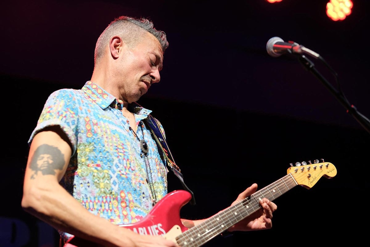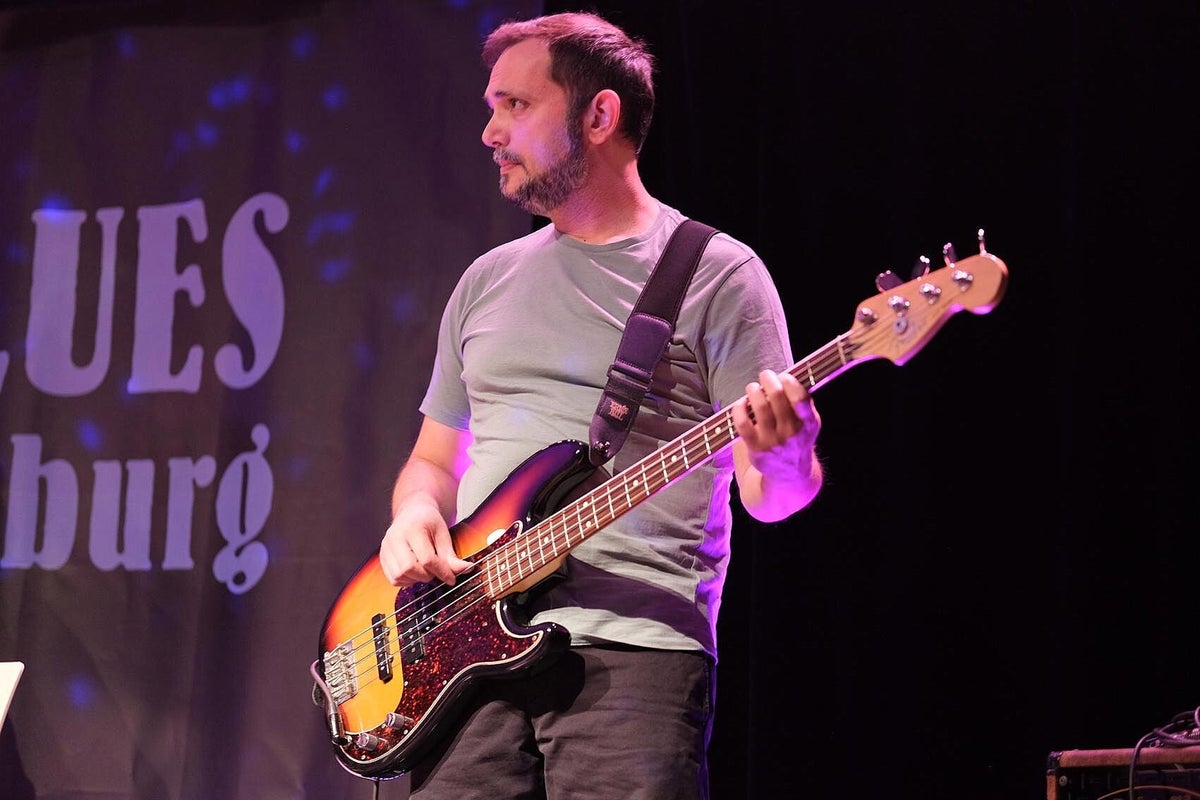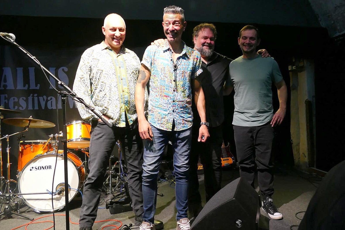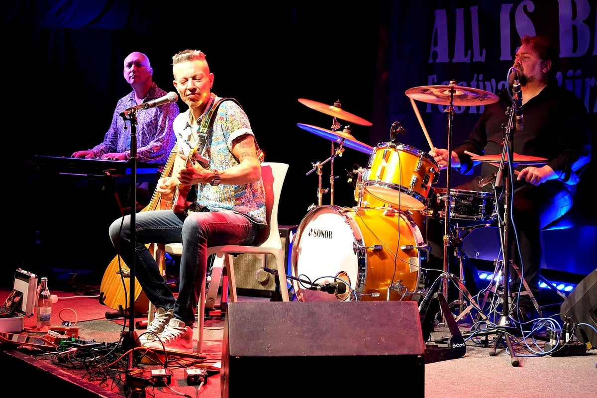 Und was gibt es am Samstag auf der schönen Bühne im imposanten Kellergewölbe des Club Z87. Zuerst einmal den erfahrenen Pfälzer Gitarrist, Sänger, Komponist, Produzent und Grafik-Designer Timo Gross, der mit seiner markanten Stimme und sein vielseitiges Gitarrenspiel seine Duftmarken gesetzt hat. Pfalz und Franken, da war doch noch was, genau, deutscher Qualitäts-Wein. Also hier verbindet nicht nur der Blues, sondern auch die hügelige Landschaft, Kulinarik und die Liebe zum deutschen Rebensaft. Er ist auch Winzer und bringt seinen eigenen Wein mit ins Frankenland. Da kann doch wohl nichts mehr schiefgehen. Timo spielt im Trio, wie auch Michael van Merwyk, bringt ebenso die zwei sehr erfahrenen Kollegen Matthias Scherer (Bass: Johnny Rieger Band, The Dynamite Daze) und Konrad Henkelüdeke (Schlagzeug: Alex Mayr, Casper) mit in den Keller Z87. Der dritte Gitarren-Frontmann in Folge, Michael der bescheidene Geschichtenerzähler, Andrea der virtuose Gitarrenheld, nun Timo der Blues-Rebell. Von der ersten Minute an ist Alarm auf der Bühne und man erfährt eine Menge über Konrad, Timo und den Tourbus-Fahrer Matthias. In unserer Berichterstattung stoßen wir bei der Recherche immer wieder auf diese drei Namen. Zwangsläufig, denn was diese drei Musiker schon alles in ihren Lebensläufen stehen haben ist gewaltig, sprich: beeindruckend !! Timo beschäftigt sich seit Ende der 70er mit Rock-Musik, hat in einer unüberschaubaren Anzahl von Projekten mitgearbeitet, das Studio und die Bühne mit vielen prominenten Kollegen geteilt. Ab 2004 tritt er dann als Solist und Projekt-Partner deutlicher in das Licht der Blues-Szene, arbeitete mit den deutschen Schwergewichten dieses Genres zusammen, beispielsweise mit Gregor Hilden, Richie Arndt (siehe Portrait), Alex Conti (siehe Werkschau). Diesmal vertritt ein weiterer Held die heimische Blues-Szene beim All Is Blues Festival. Und Timo arbeitet sich durch sein Programm, Material hat er ja massig, die widerspenstige Technik wird niedergerungen und der heiß-laufende Blues-Motor mit Gerstensaft gekühlt. Zum Schluss kommt, wie beim Festival-Debüt letztes Jahr, der Lokal-Matador Jochen Volpert mit auf die Bühne. „Ist natürlich schwer von Null auf einen Zug im Höllentempo aufzuspringen.“ Jochen, sei versichert, deine Gitarrenarbeit war von Norbert an den Reglern optimal ausgesteuert und kam druckvoll beim Publikum an. Der Szenen-Applaus für das Quartett bestätigte das ausdrücklich. Text_Bilder: Christa & Roland Koch