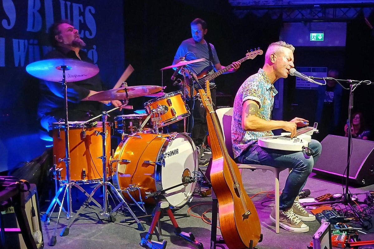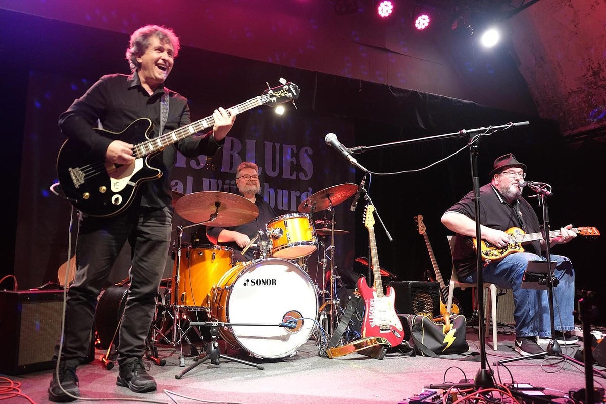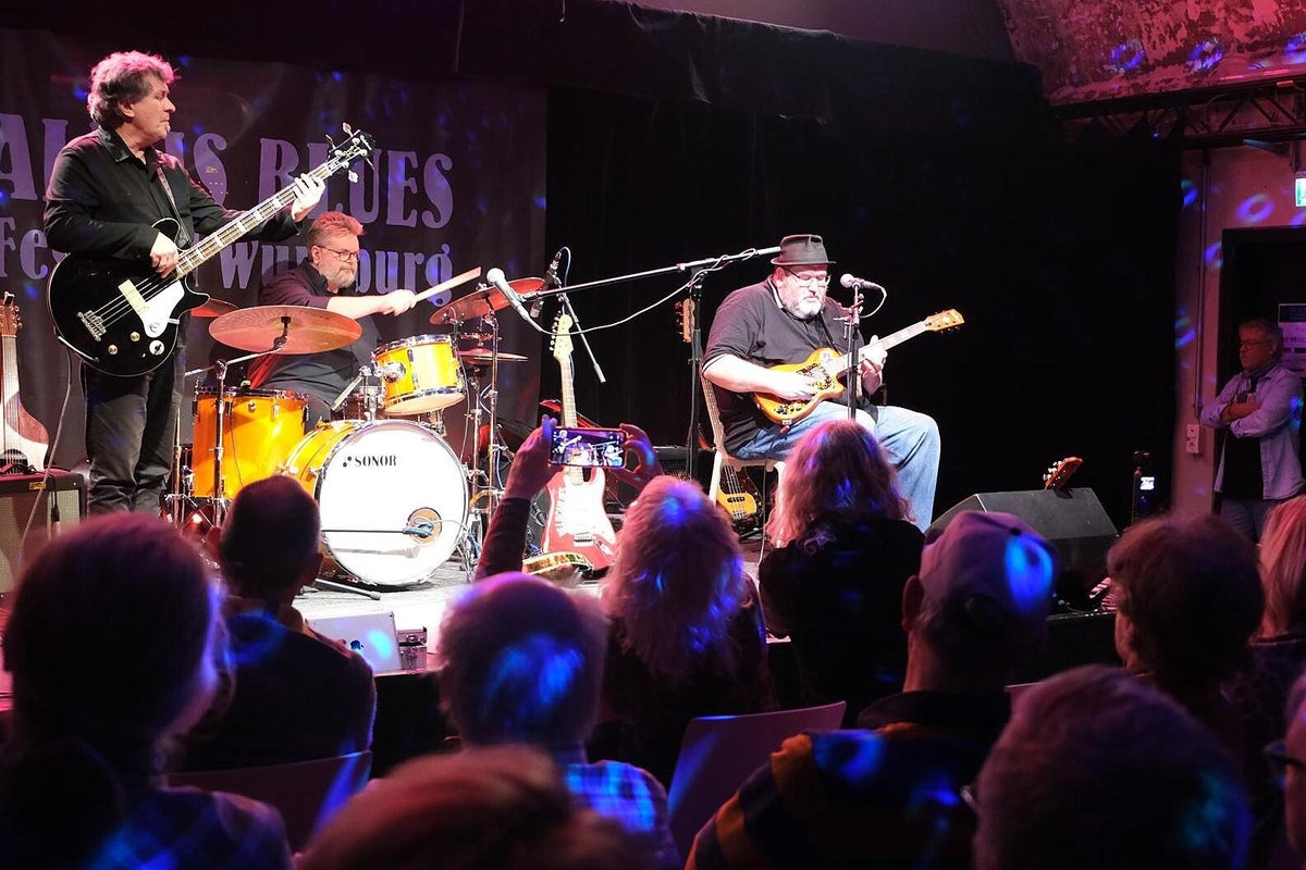 Wir trafen ein paar Tage vorher den sehr entspannten Blues-Barden Michael van Merwyk bereits in der Feldsteinkirche Dolgelin im Oderbruch Nähe polnischer Grenze. Dort spielte er als Gast im Rahmen einer 4-stündigen Blues-Revue (wir berichteten darüber) einige Titel von der aktuellen Produktion Blues Everywhere I Go. Und auch diesmal ist der sympathische Musiker aus dem westfälischen Rheda-Wiedenbrück sehr gesprächig und nahbar. Michael van Merwyk selbst: „Meine Schule waren Kneipen, Clubs und Partys. Ich singe Songs und erzähle Geschichten. Meistens spiele ich eigene Kompositionen, aber auch die von anderen Musikern in ganz eigenen Versionen. Ein guter Song ist ein guter Song.“ Und genau das hatte er uns noch einmal in seiner sehr sympathischen Art mit vielen anderen Anekdoten erzählt und später auf der Bühne wieder mit Leben gefüllt. „Kennt ihr den Unterschied zwischen Blues und Blues-Musik ?? Blues ist Gejammer über alltägliche traurige Ereignisse, beispielsweise Frau hat mich verlassen, bin arbeitslos oder die Wohnung ist weg. Aber nach einem Konzert mit Blues-Musik dagegen, fühlt man sich besser als vorher.“ Gelebte Erfahrungen eines weitgereisten Blues-Musikers die wir bestätigen können. Michael bringt seine sehr erfahrenen The Ollies, Bassist Oliver Geselbracht alias Ollie Gee (Blues Company) und Schlagzeuger Oliver „Ollie“ Spanuth (Dave Goodman), mit in die Franken-Metropole am Main. Interessant ist bei den Ollies, dass sie beide auch schon mit Big Daddy Wilson, der sein Programm am nächsten Tag zum Abschluss präsentiert, zusammen musiziert haben. Das Trio ist traumhaft eingespielt, das spürt jeder sofort. Sie spielen ein Bündel Lieder von Michaels letzten vier Alben, aber auch mit beispielsweise Get It On (T. Rex), das berührende Heroes (David Bowie) was vom Publikum mitgesungen wurde und Breaking The Law (Judas Priest), Klassiker im ureigenen Gewand dieses erfahrenen Trios. Besonders die leisen Töne sind eine starke Seite dieser Musiker. Michael füllt mit seiner ausdruckstarken Stimme problemlos den gesamten Raum bis in die hintersten Reihen. Mehrmaliger begeisterter Zwischenapplaus unterstrich das deutlich !! Wenn ihr einmal eine Gelegenheit habt, in einem heimatlichen Club, MVM Solo oder mit Ollies-Begleitung erleben zu können, geht hin und staunt über „The Bear“ Michael van Merwyk aus Westfalen. Wir wollten Michael noch einmal am nächsten Morgen im Wohnzimmer des All Is Blues Festival im Band-Hotel Lamm in Höchberg treffen, hat aber leider nicht geklappt, Michael war schon auf dem Weg zum nächsten Fantreffen Richtung Stuttgart. Dafür tauschten wir uns mit Lamm-Chef Werner Lawrenz, selbst Gitarrist, über die jetzige schwierige Situation in der Kultur aus. Sehr interessante Themen, sehr informativer Austausch. Text_Bilder: Christa & Roland Koch