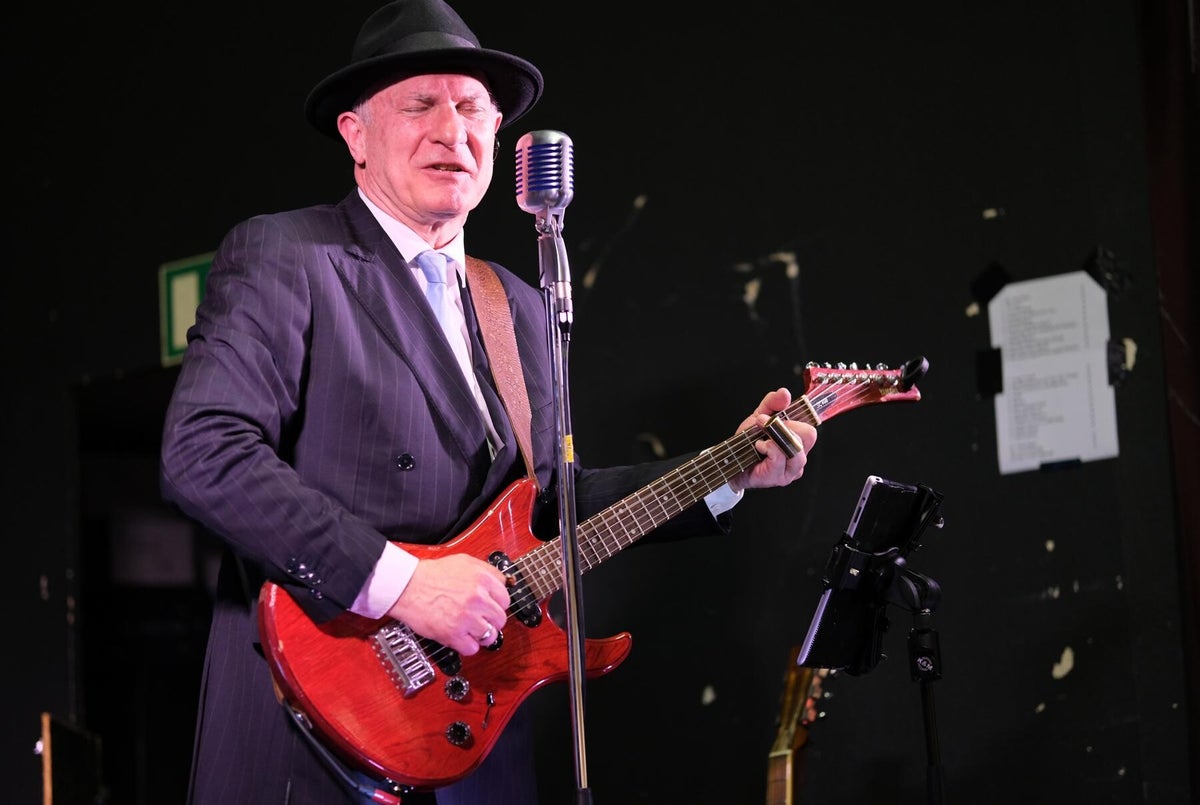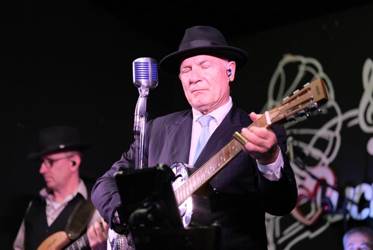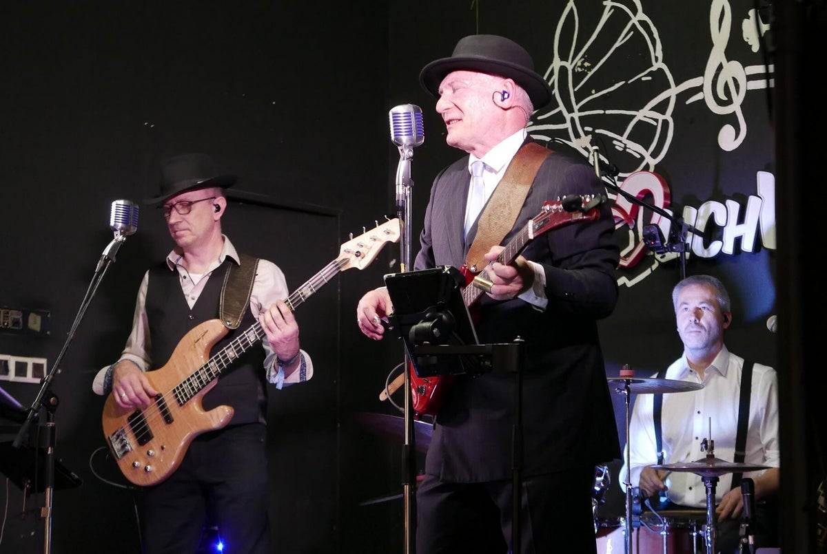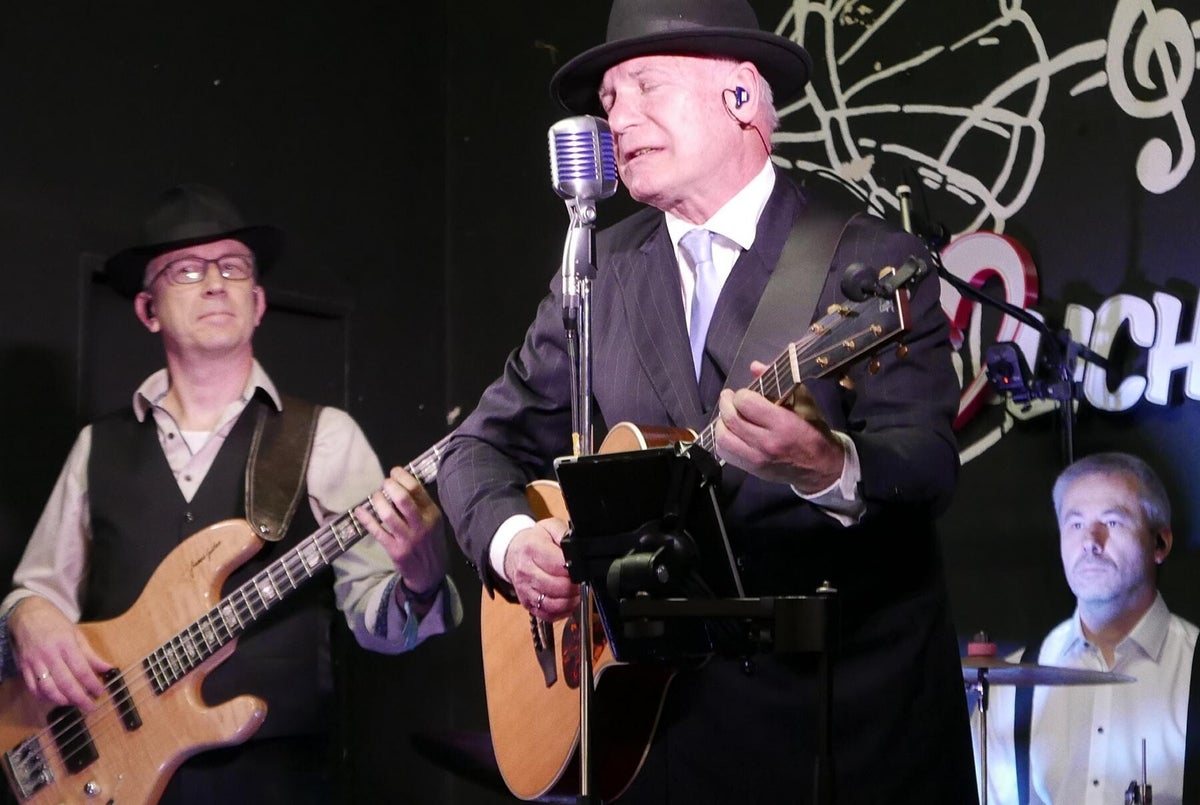 Wir kennen das breite Repertoire von Norbert’s Formationen Berchtesgaden Blues Band (Akustik-Quartett), Natural Blues (klassische Blues-Rocker) und City Blues Connection (Big Band) natürlich sehr gut. Wir werden aber immer wieder überrascht wie dieses Trio die uns bekannten Lieder präsentiert. Zuerst erkennen wir nicht mal Weepin’n’Moanin’, dass in der Blues-Spezial-Ausgabe Empire 153 auf der Heft-CD mit veröffentlicht wurde, ein echter Blues-Stampfer der das kleine aber feine Publikum mitreißt. Ebenso wie der Klassiker Dust My Broom von Robert Johnson. Aber besondere Aufmerksamkeit bekamen auch die kritischen Egger-Kompositionen Mr. President, Shame On You Mr. Trump sowie I Can’t Breathe. Noch einmal der Hinweis, dass der Mahner Norbert aus Oberbayern, seine Finger textlich immer wieder in die großen Wunden unserer Zeit legt. Aktuell sind seit dem Live Rock Gegen Rechts Festival (09-2023) an geschichtsträchtiger Stelle in Berchtesgaden auch die neuen Nazis sein Thema. Und er nimmt mutig wie kaum ein anderer Künstler hierzulande mit dem Lied Wir Stehen Gemeinsam Gegen Rechts unmissverständlich Stellung. Und damit JEDER deutschsprachige Mensch die deutliche Mitteilung auch versteht, ist Norbert’s Blues-Mahnung zum ersten Mal in Deutsch verfasst. Nach kurzem gemeinsamen Üben, wurde der Refrain des Liedes lautstark von den Besuchern mitgesungen: Wir steh’n gemeinsam gegen rechts, stoppt AfD in unserem Land! Kein Platz für AfD und Nazis, für Menschenrechte Hand in Hand. Einer von vielen Höhepunkten an diesem sehr schönen Abend im historischen Jugendstil-Saal. Das Hauptprogramm war mit einer kurzen Pause unterbrochen und das Repertoire umfasste zwei Dutzend Lieder (siehe Set-Liste) aus der über 45-jährigen Karriere von Norbert Egger, inklusive drei zusätzlicher Stücke als Zugabe. Hier wurde praktisch keiner der klassischen Blues-Stile ausgelassen. Die Kompositionen, die für die Big Band City Blues Connection arrangiert waren wurden von dieser Drei-Mann-Kapelle im Kreipl-Egger-Gewand bärenstark interpretiert. Norbert erklärte immer wieder wie einzelne Songs entstanden sind und kleine Anekdoten den Anstoß gaben für viele seine eigenen Lieder. Und das alles oft im Dialog mit dem gut gelaunten Publikum, die mit ihren Kommentaren wie beispielweise „Oh, die Gitarre hat er noch garnicht gespielt !! Ist die neu ??“ oder „Der best-angezogenste Gitarrist aus Berchtesgaden“ zur Club-Stimmung beitrugen.