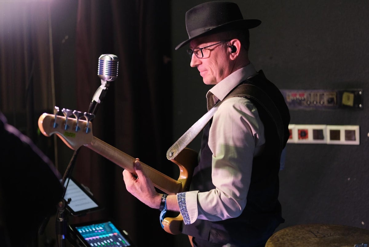 Um euch eine Vorstellung zu geben welche fantastische Veranstaltung wir kurz vor Ostern 2024 hier im 1900 gegründeten Haus von Carl Oestreich erlebt haben, nun einige Details. Es ist die Dienstälteste und mittlerweile auch letzte Kneipe im CAS-Ortsteil Schwerin. Der inzwischen über 120 Jahre alte rechteckige blitzsaubere und prachtvolle Tanzsaal hat eine große erhöhte Bühne. Zu vergleichen ist er vielleicht mit dem bekannten Musiktempel Piano in der Nähe, nur circa 5 Kilometer entfernt. Es wird auch köstlich bewirtet und man hat von jedem Platz einen großartigen Blick auf die Musiker. Der Begriff Power-Blues-Trio auf dem schönen Plakat bekommt angesichts der Menge der Technik, die unsere drei Musiker hier aufgebaut und verkabelt haben eine doppelte Bedeutung. Und wir sprechen von modernster Technik mit digitalem Mischpult, voluminösen PA-Lautsprechern, LED-Lichtanlage. Norbert Egger hat ein Dutzend Gitarren mitgebracht und der Einsatz jeder neuen Sechssaitigen wird vom Publikum mit Kommentaren gefeiert. Norbert kündigt bereits früh an, „passt gut auf, dieses Instrument spiele ich später beim Rausschmeißer.“ Überhaupt ist die Stimmung zwischen Publikum und den redefreudigen Künstlern vom ersten Moment an sehr entspannt und äußerst kameradschaftlich. So kommt es, dass der Blues-Express etwas verspätet durchstartet und so hatten die Besucher auch genügend Zeit für den kulinarischen Genuss.