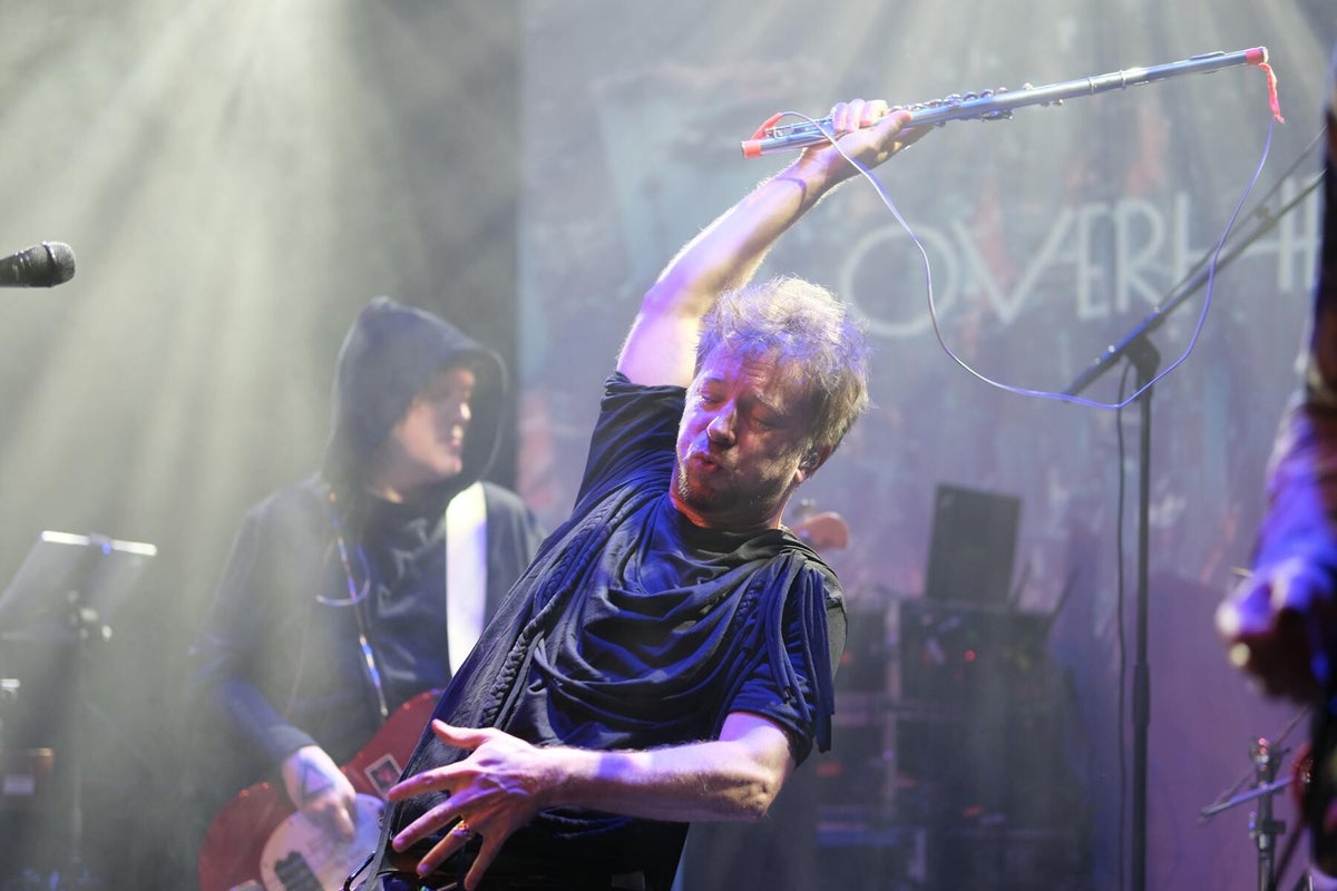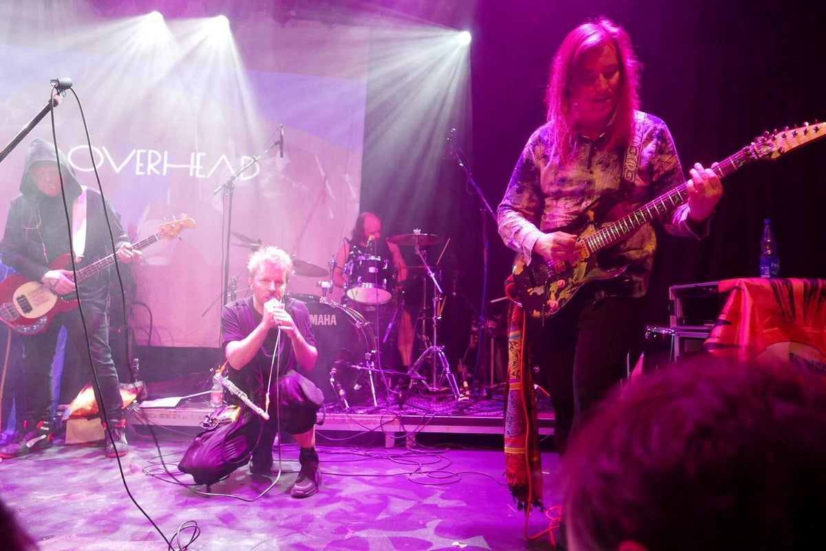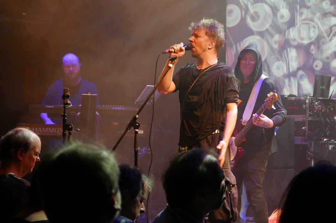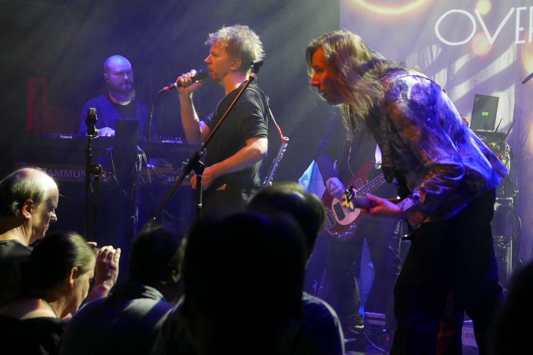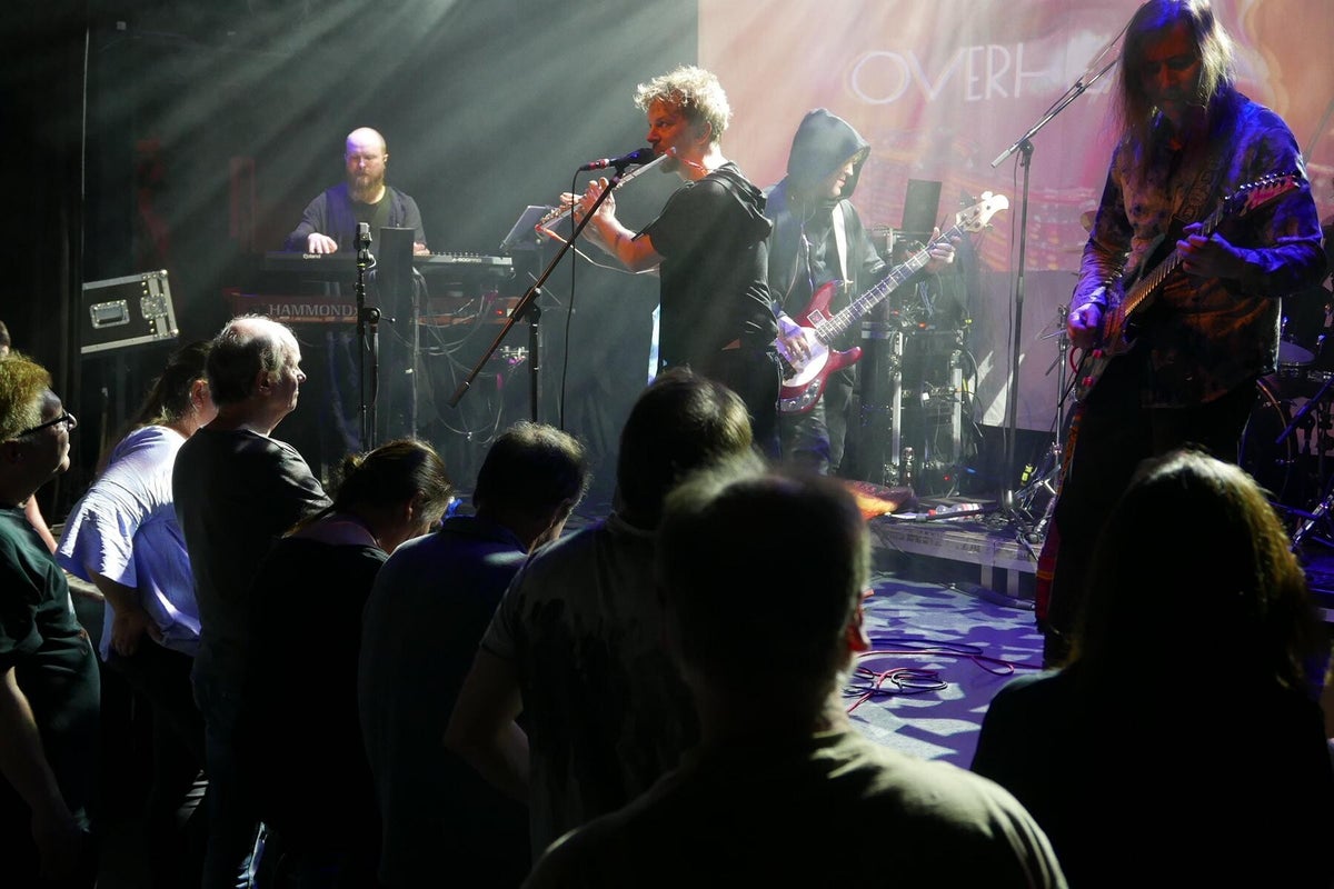 Kurze Umbaupause für die B-Seite mit Overhead aus Helsinki, die mal schnell für ein halbes Dutzend Auftritte in Deutschland, Niederlande und Belgien nach Mitteleuropa gekommen sind. Wie sehr sich beide Bands schätzen, zeigt das die Finnen schnell noch nach dem Sound-Check das Crystal-Palace-Logo in ihre Animation eingebaut hatten und damit das Quartett aus Berlin entzückten, Respekt. Overhead hat inzwischen in jeder Hinsicht große Eigenständigkeit entwickelt. Nach sieben Alben, vier Label-Wechsel, kurzes Gastspiel auch bei Progressive Promotion Records, hat die Fünfer-Bande seine letzten beiden Alben Haydenspark (2018) und Doppeldecker Telepathic Minds (2023) komplett in Eigenregie abgewickelt, inklusive die Promotion und Buchung. Sie behalten jetzt alle Fäden fest und selbstbewusst in den eigenen Händen. Genauso stand auch dieses Quintett auf der Rüsselsheimer Bühne mit modernster Licht-Ton-Technik und so gaben sie sich auch später an ihrem Merch-Stand. Auch beim Auftritt von Overhead, zufällig spielten auch sie acht Titel, standen die langen Kompositionen im Mittelpunkt. Dabei spielten sie ihre Trümpfe voll aus, konnten Alex Keskitalo (Gesang, Flöte), Jaakko Kettunen (Gitarren), Janne Pylkkönen (Bass), Tarmo Simonen (Keyboards), Ville Sjöblom (Schlagzeug) ihr Handwerk solistisch und als Kollektiv gut präsentieren. Wie zu erwarten stand das aktuelle Album mit War To End All Wars, Ghosts From The Future, Tuesday That Never Came, Telepathic Minds im Zentrum, damit schon fast 45 Minuten moderne, anspruchsvolle Rockmusik. Das Publikum war nimmermüde die Präsentation immer wieder mit Szenen-Applaus zu honorieren. Ich sah sogar mehrere Gäste die Texte mitsingen. Auch die Finnen brechen nicht mit alten Traditionen, die Zugabe ist wieder eine lange und eruptive Version des King Crimson Klassiker 21st Century Schizoid Man. Das Publikum ist begeistert und besonders Alex Keskitalo läuft zu absoluter Höchstform auf. Eine wunderbare Veranstaltung, professionell von Florian Haupt und sein Team in Szene gesetzt, die lautstark nach Wiederholung schreit. Ich habe da einige Doppeldecker im Auge, die dieses Rock-Spektakel wiederholen könnten, auch wieder gemischt und vielleicht auch mal in Deutsch oder Französisch. Eine fantastische Veranstaltung in einem schönen Musik-Tempel, die allemal noch mehr Publikum verdient hätte.