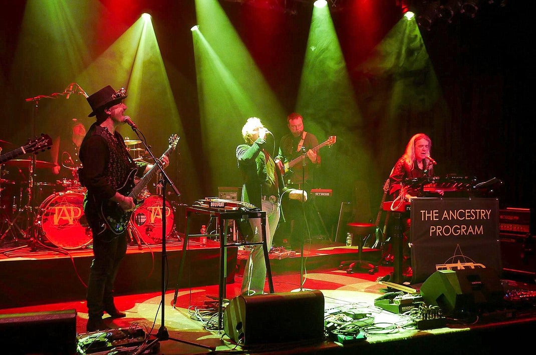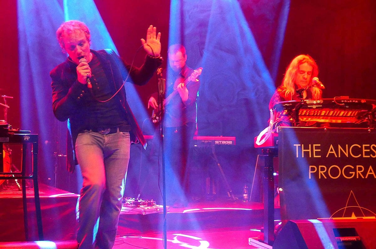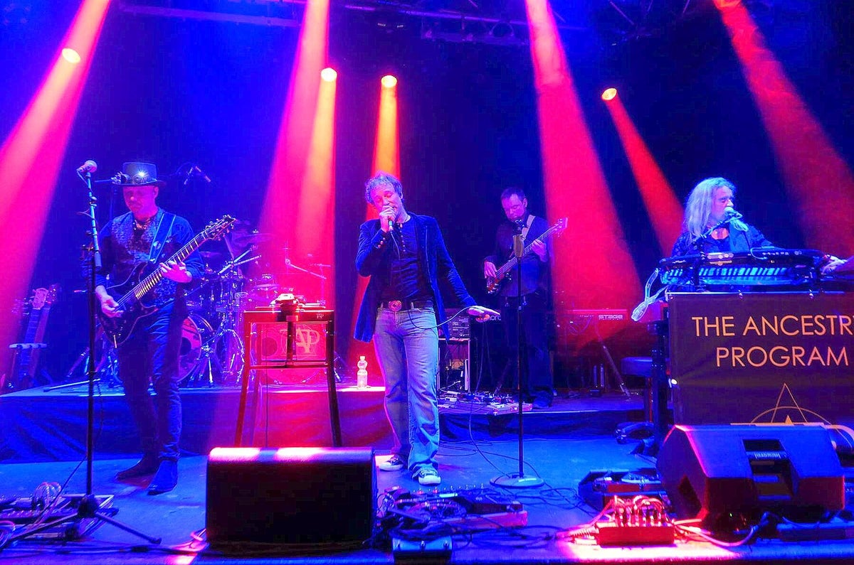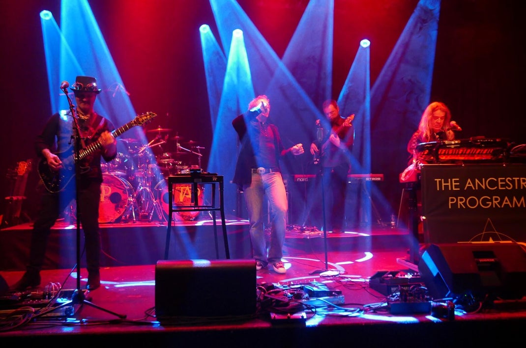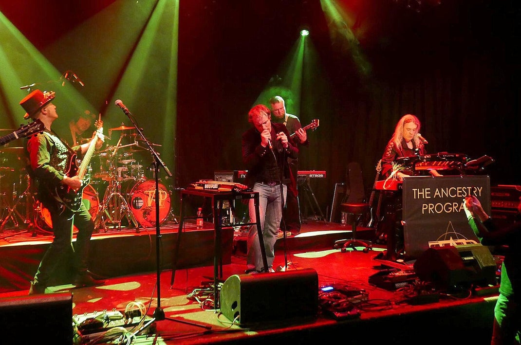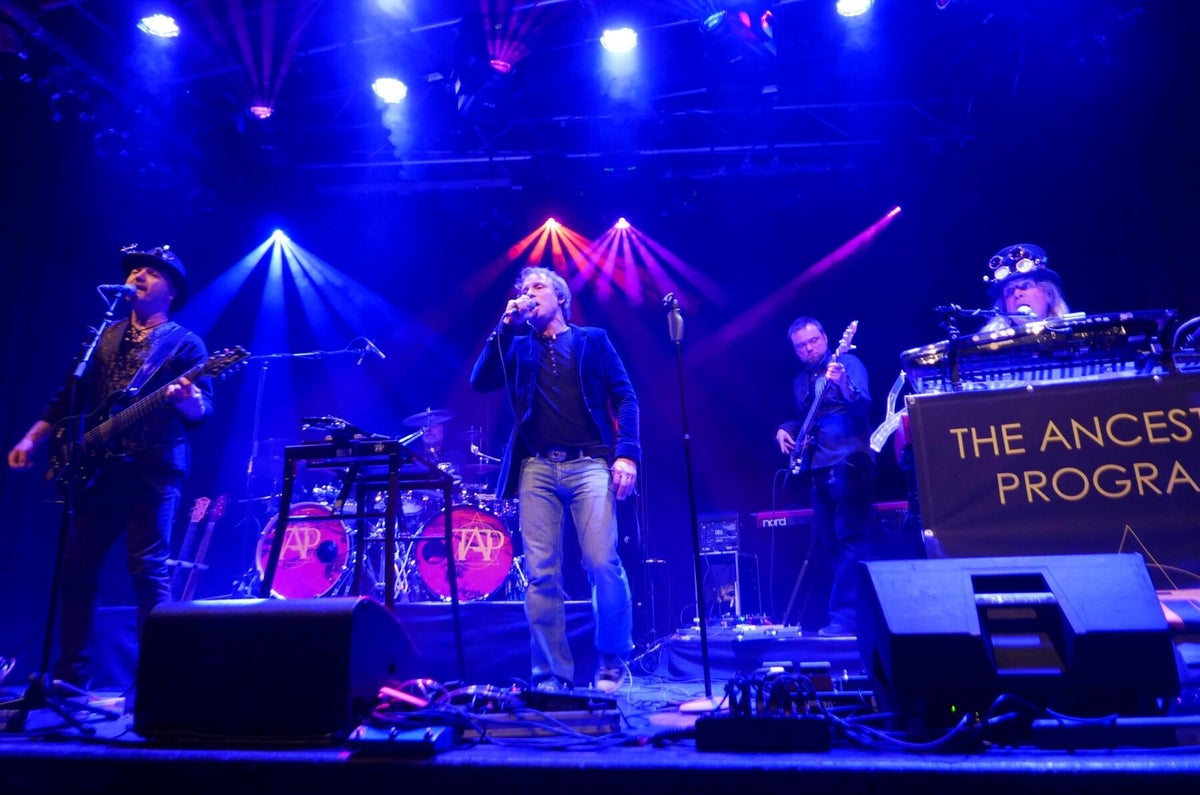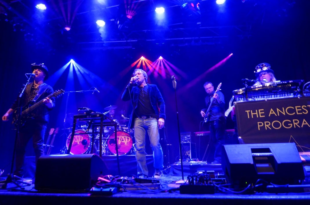 Aber das Traurige zuerst: Das Septett The Ancestry Program (TAP) aus dem Großraum München hatten leider ihr Gründungsmitglied und prägenden Gitarristen Mani Gruber aus gesundheitlichen Gründen nicht mit zu den zwei Prog-Gipfeln nach Oberhausen und Rüsselsheim mitbringen können. Deshalb mussten die Rollen im diesmal nun Quintett etwas neu verteilt werden, denn eigentlich hat TAP vier Saitenkünstler. Mike Voglmeier übernahm die Position von Mani, Tastenvirtuose Thomas Burlefinger ergänzte an der elektrischen 6-saitigen, Marco Osmajic angestammt, konzentriert am Bass und der charismatische Front-Sänger Ben Knabe setzte wie gewohnt Akzente stimmlich und Klangtupfer mit seiner Pedal-Steel-Gitarre. Als ich die Musik von TAP vor Jahren zum ersten Mal hörte, war ich überrascht von dieser komplexen, teils aber auch verspielten Musik mit Wurzeln in verschiedenen Ecken des Rock. Meine Überlegungen: Wie kann man so eine Musik Live präsentieren ?? Wie gut könnte es werden ?? Stephan und ich haben es jetzt 2-mal kurz hintereinander an zwei Orten erlebt (mit Reichenbach 2023 auf insgesamt nun drei Bühnen). Antwort: Mit Könnern an den Instrumenten, aber besonders auch mit einem homogenen Gefüge innerhalb der Band. Der Kuschelfaktor zeigte mir hier am Main die Harmonie der Musiker untereinander. Trotz einem Mann weniger auf dem Spiel-Platz, hatte man nicht eine Minute das Gefühl hier sind im Klangteppich Lücken oder Fehlstellen. Frontsänger und Steel-Gitarre-Spieler Ben Knabe sagte mir vor dem Auftritt: „Ich stecke voller Energie, werde heute für Mani und für meine Familie alles geben.“ Und er hat Wort gehalten !! War er beim Artrock-Festival 2023 noch etwas zurückhaltender, hier in Rüsselheim am Main war Ben wie entfesselt und immer in Bewegung, suchte ständig den Kontakt zu den Mitspielern. Tieftöner Marco und der grölende Schlagzeuger Andy Lind sorgten wie gewohnt für das stabile Fundament auf dem die drei Frontmänner stark aufbauen konnten. Andy, Mike und Thomas waren wie immer typisch als Ahnenforscher kostümiert und waren ständig in Bewegung. Thomas verließ immer mal wieder mit Gitarre oder mobilen Keyboard seinen Hauptarbeitsplatz hinter der Tasten-Burg. Das fachkundige Publikum beobachte wie gebannt das Geschehen auf der gut beleuchteten Bühne, honorierte den starken Auftritt immer wieder berechtigt mit Szenen-Applaus. Und den hat stellvertretend Mani Gruber auch verdient, alles gute bayrischer Ahnenforscher für deinen weiteren Weg.