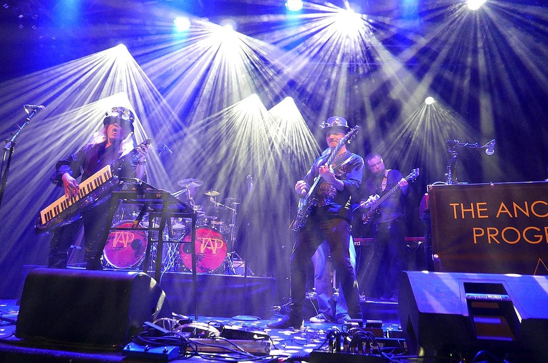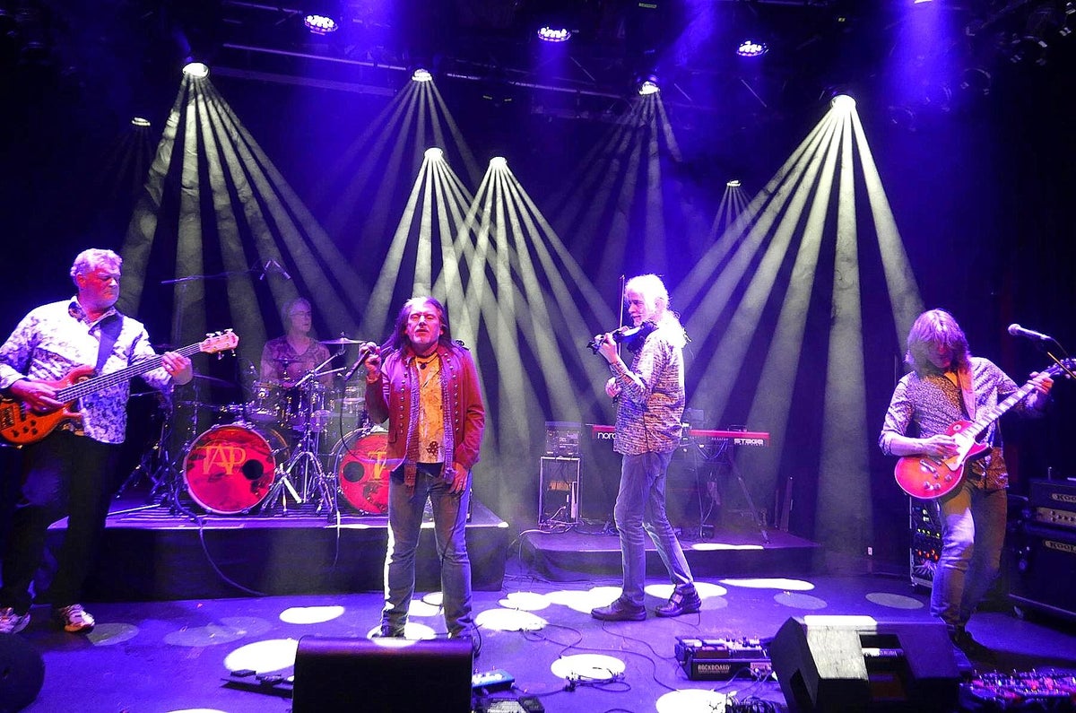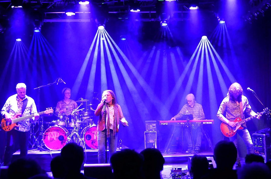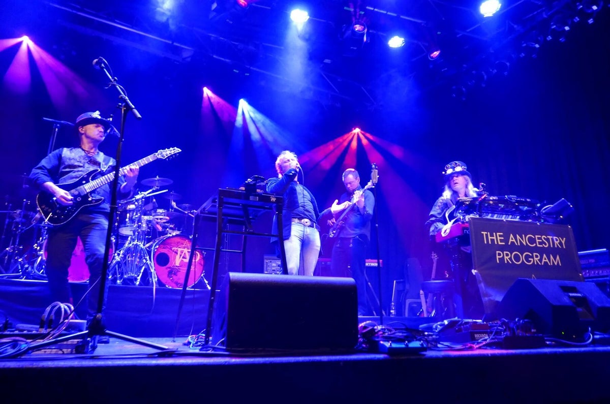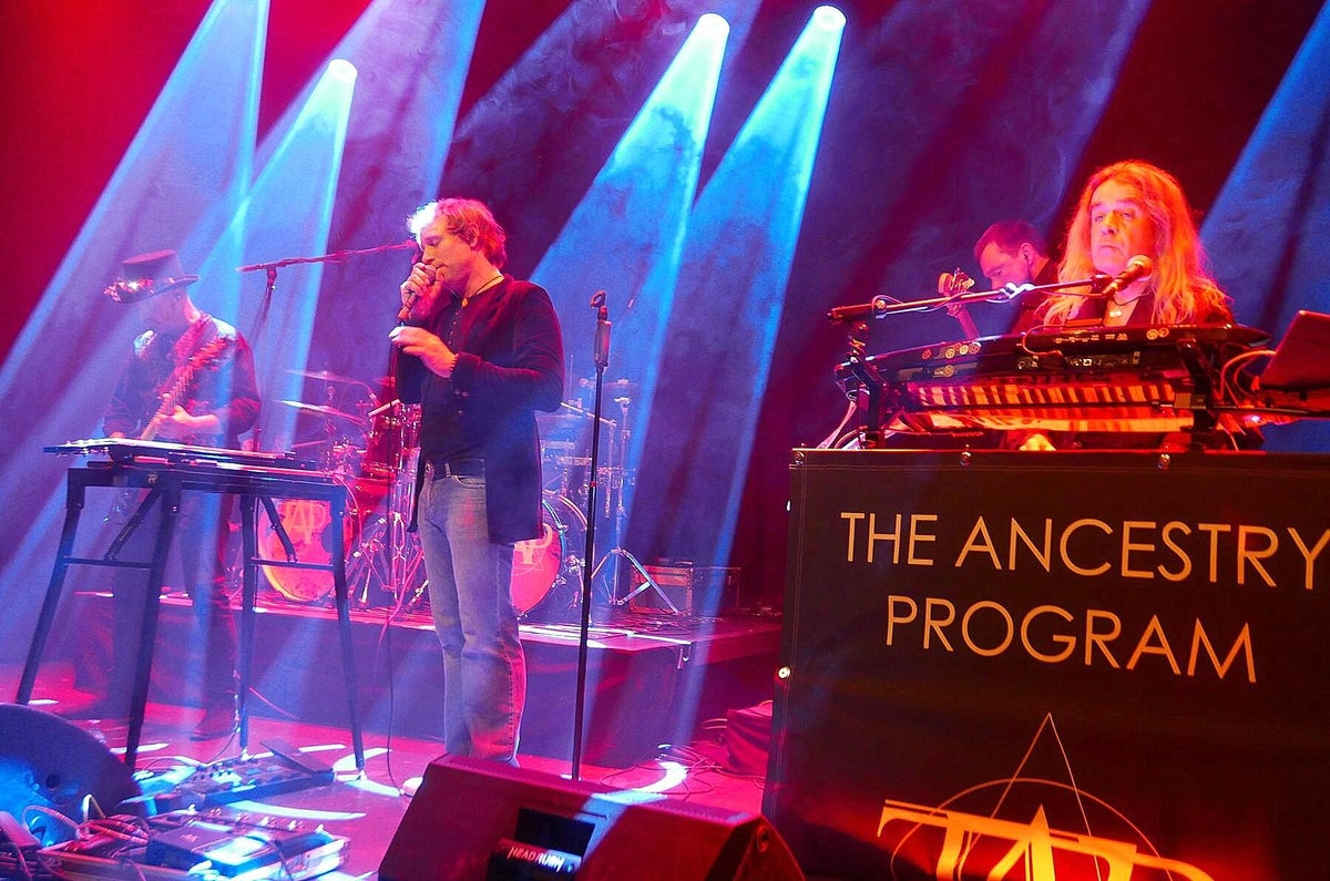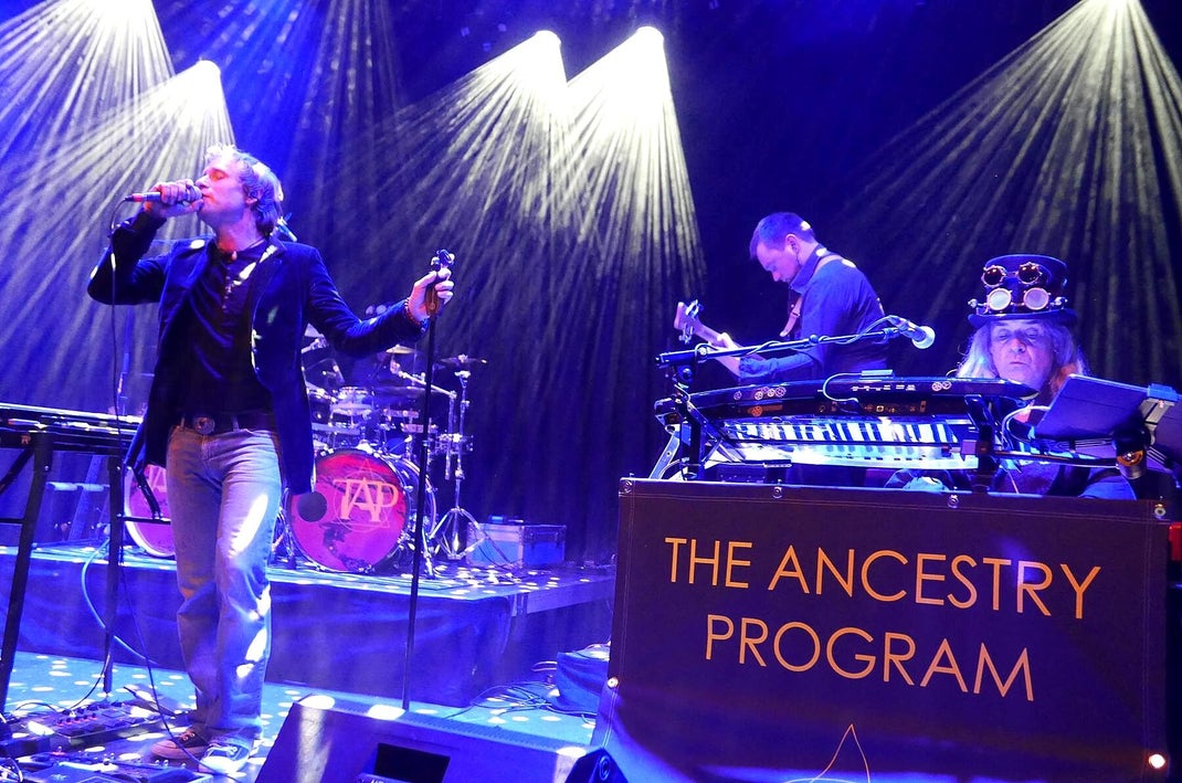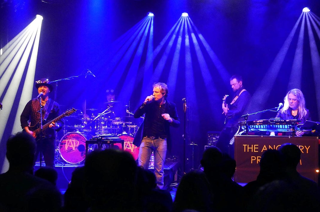 Aber das Traurige zuerst: Das Septett The Ancestry Program (TAP) aus dem Großraum München hatten leider ihr Gründungsmitglied und prägenden Gitarristen Mani Gruber aus gesundheitlichen Gründen nicht mit zu den zwei Prog-Gipfeln nach Oberhausen und Rüsselsheim mitbringen können. Deshalb mussten die Rollen im diesmal nun Quintett etwas neu verteilt werden, denn eigentlich hat TAP vier Saitenkünstler. Mike Voglmeier übernahm die Position von Mani, Tastenvirtuose Thomas Burlefinger ergänzte an der elektrischen 6-saitigen, Marco Osmajic angestammt, konzentriert am Bass und der charismatische Front-Sänger Ben Knabe setzte wie gewohnt Akzente stimmlich und Klangtupfer mit seiner Pedal-Steel-Gitarre. Als ich die Musik von TAP vor Jahren zum ersten Mal hörte, war ich überrascht von dieser komplexen, teils aber auch verspielten Musik mit Wurzeln in verschiedenen Ecken des Rock. Meine Überlegungen: Wie kann man so eine Musik Live präsentieren ?? Wie gut könnte es werden ?? Stephan und ich haben es jetzt 2-mal kurz hintereinander an zwei Orten erlebt (mit Reichenbach 2023 auf insgesamt nun drei Bühnen). Antwort: Mit Könnern an den Instrumenten, aber besonders auch mit einem homogenen Gefüge innerhalb der Band. Der Kuschelfaktor zeigte mir hier am Main die Harmonie der Musiker untereinander. Trotz einem Mann weniger auf dem Spiel-Platz, hatte man nicht eine Minute das Gefühl hier sind im Klangteppich Lücken oder Fehlstellen. Frontsänger und Steel-Gitarre-Spieler Ben Knabe sagte mir vor dem Auftritt: „Ich stecke voller Energie, werde heute für Mani und für meine Familie alles geben.“ Und er hat Wort gehalten !! War er beim Artrock-Festival 2023 noch etwas zurückhaltender, hier in Rüsselheim am Main war Ben wie entfesselt und immer in Bewegung, suchte ständig den Kontakt zu den Mitspielern. Tieftöner Marco und der grölende Schlagzeuger Andy Lind sorgten wie gewohnt für das stabile Fundament auf dem die drei Frontmänner stark aufbauen konnten. Andy, Mike und Thomas waren wie immer typisch als Ahnenforscher kostümiert und waren ständig in Bewegung. Thomas verließ immer mal wieder mit Gitarre oder mobilen Keyboard seinen Hauptarbeitsplatz hinter der Tasten-Burg. Das fachkundige Publikum beobachte wie gebannt das Geschehen auf der gut beleuchteten Bühne, honorierte den starken Auftritt immer wieder berechtigt mit Szenen-Applaus. Und den hat stellvertretend Mani Gruber auch verdient, alles gute bayrischer Ahnenforscher für deinen weiteren Weg.
