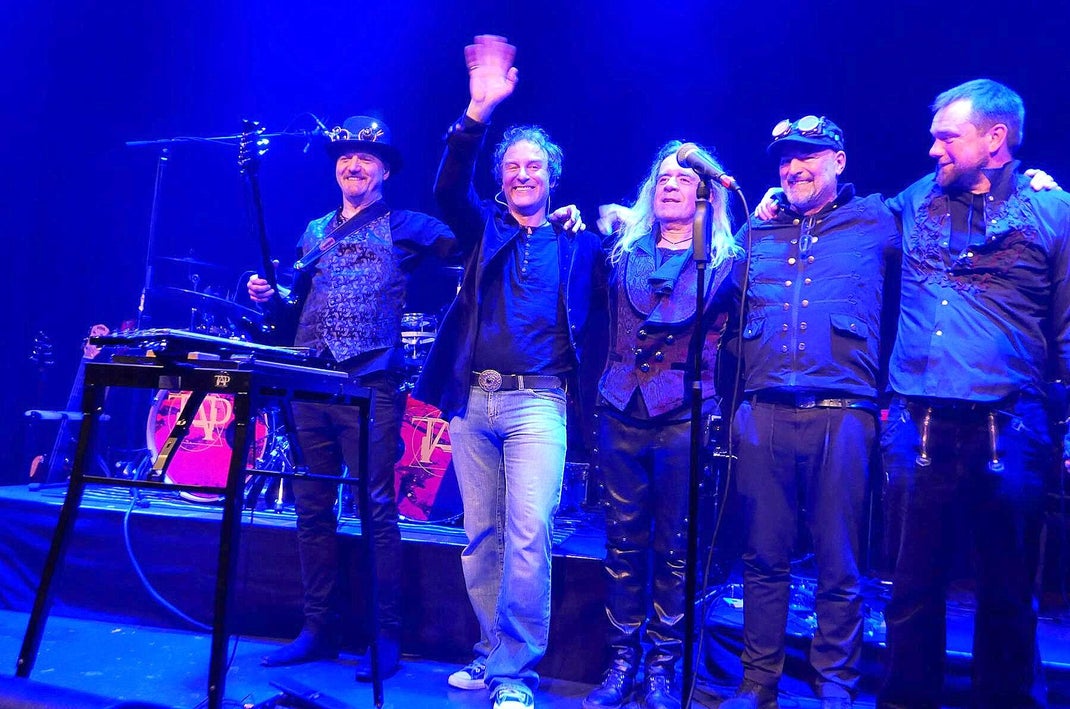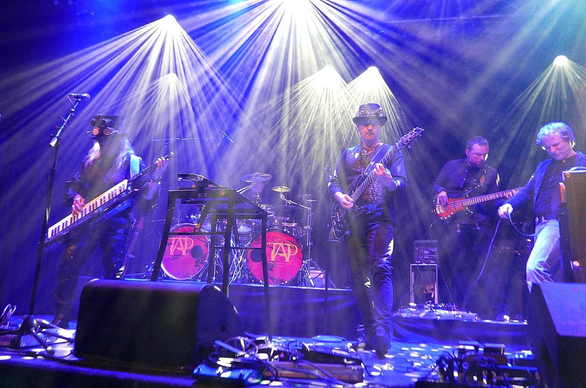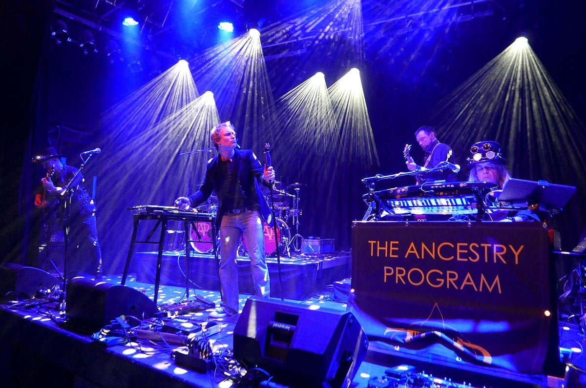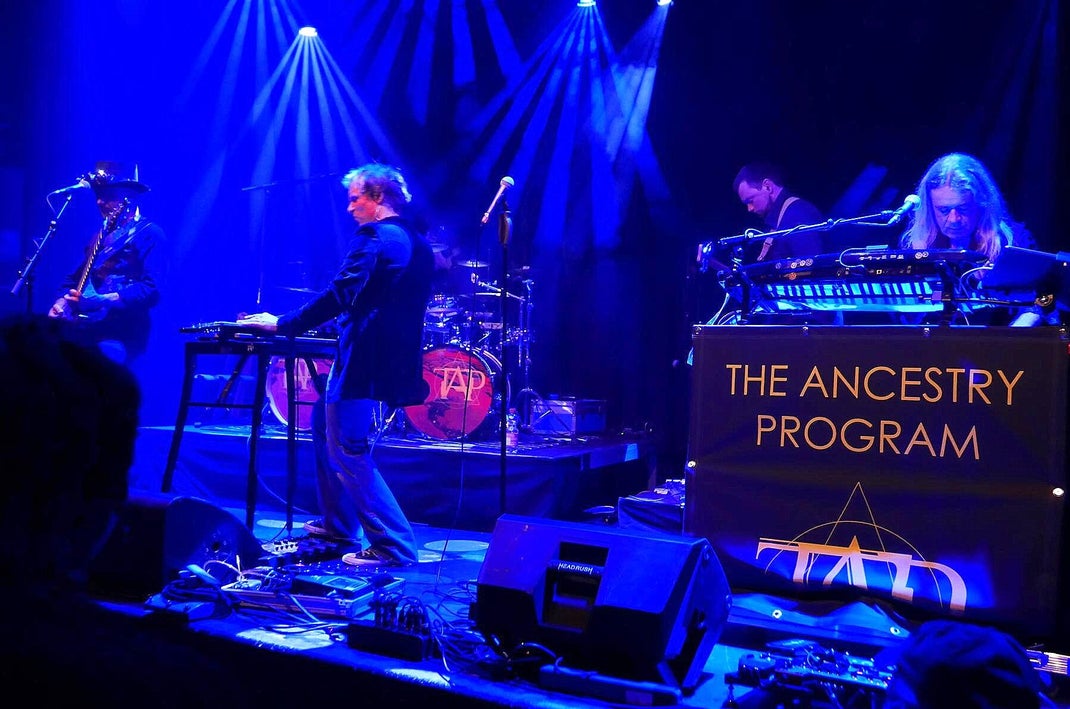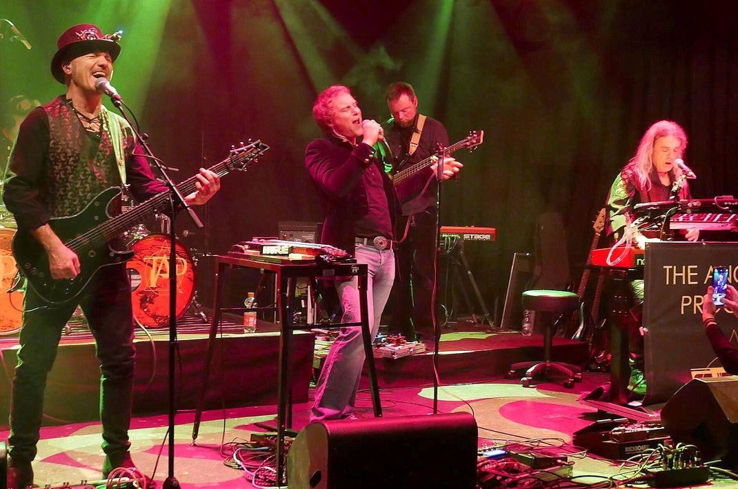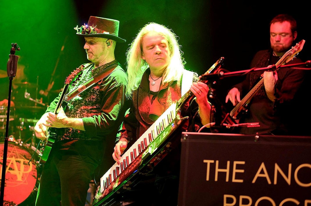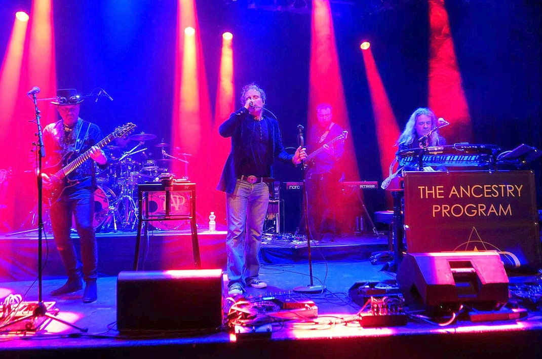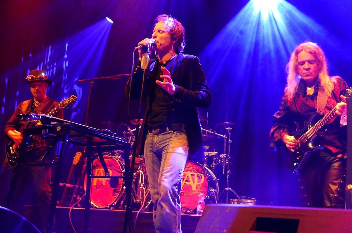 Aber das Traurige zuerst: Das Septett The Ancestry Program (TAP) aus dem Großraum München hatten leider ihr Gründungsmitglied und prägenden Gitarristen Mani Gruber aus gesundheitlichen Gründen nicht mit zu den zwei Prog-Gipfeln nach Oberhausen und Rüsselsheim mitbringen können. Deshalb mussten die Rollen im diesmal nun Quintett etwas neu verteilt werden, denn eigentlich hat TAP vier Saitenkünstler. Mike Voglmeier übernahm die Position von Mani, Tastenvirtuose Thomas Burlefinger ergänzte an der elektrischen 6-saitigen, Marco Osmajic angestammt, konzentriert am Bass und der charismatische Front-Sänger Ben Knabe setzte wie gewohnt Akzente stimmlich und Klangtupfer mit seiner Pedal-Steel-Gitarre. Als ich die Musik von TAP vor Jahren zum ersten Mal hörte, war ich überrascht von dieser komplexen, teils aber auch verspielten Musik mit Wurzeln in verschiedenen Ecken des Rock. Meine Überlegungen: Wie kann man so eine Musik Live präsentieren ?? Wie gut könnte es werden ?? Stephan und ich haben es jetzt 2-mal kurz hintereinander an zwei Orten erlebt (mit Reichenbach 2023 auf insgesamt nun drei Bühnen). Antwort: Mit Könnern an den Instrumenten, aber besonders auch mit einem homogenen Gefüge innerhalb der Band. Der Kuschelfaktor zeigte mir hier am Main die Harmonie der Musiker untereinander. Trotz einem Mann weniger auf dem Spiel-Platz, hatte man nicht eine Minute das Gefühl hier sind im Klangteppich Lücken oder Fehlstellen. Frontsänger und Steel-Gitarre-Spieler Ben Knabe sagte mir vor dem Auftritt: „Ich stecke voller Energie, werde heute für Mani und für meine Familie alles geben.“ Und er hat Wort gehalten !! War er beim Artrock-Festival 2023 noch etwas zurückhaltender, hier in Rüsselheim am Main war Ben wie entfesselt und immer in Bewegung, suchte ständig den Kontakt zu den Mitspielern. Tieftöner Marco und der grölende Schlagzeuger Andy Lind sorgten wie gewohnt für das stabile Fundament auf dem die drei Frontmänner stark aufbauen konnten. Andy, Mike und Thomas waren wie immer typisch als Ahnenforscher kostümiert und waren ständig in Bewegung. Thomas verließ immer mal wieder mit Gitarre oder mobilen Keyboard seinen Hauptarbeitsplatz hinter der Tasten-Burg. Das fachkundige Publikum beobachte wie gebannt das Geschehen auf der gut beleuchteten Bühne, honorierte den starken Auftritt immer wieder berechtigt mit Szenen-Applaus. Und den hat stellvertretend Mani Gruber auch verdient, alles gute bayrischer Ahnenforscher für deinen weiteren Weg.