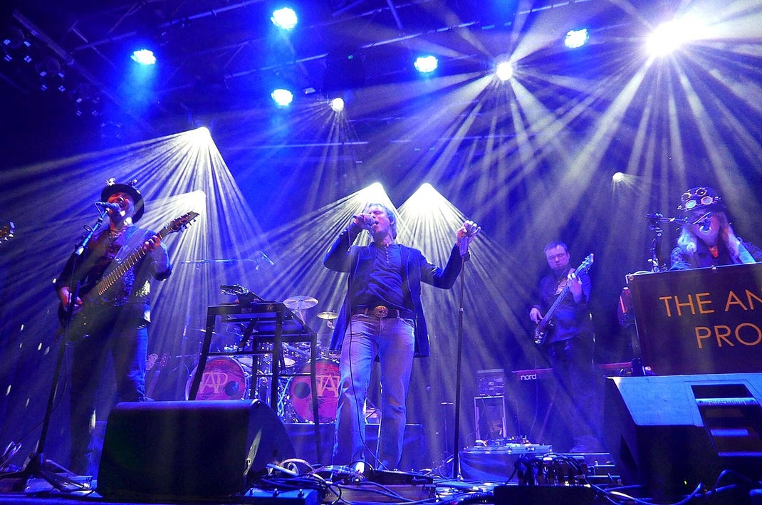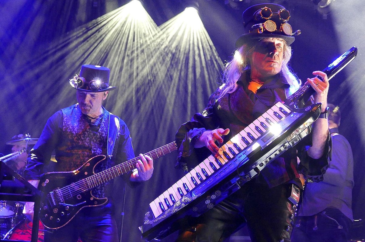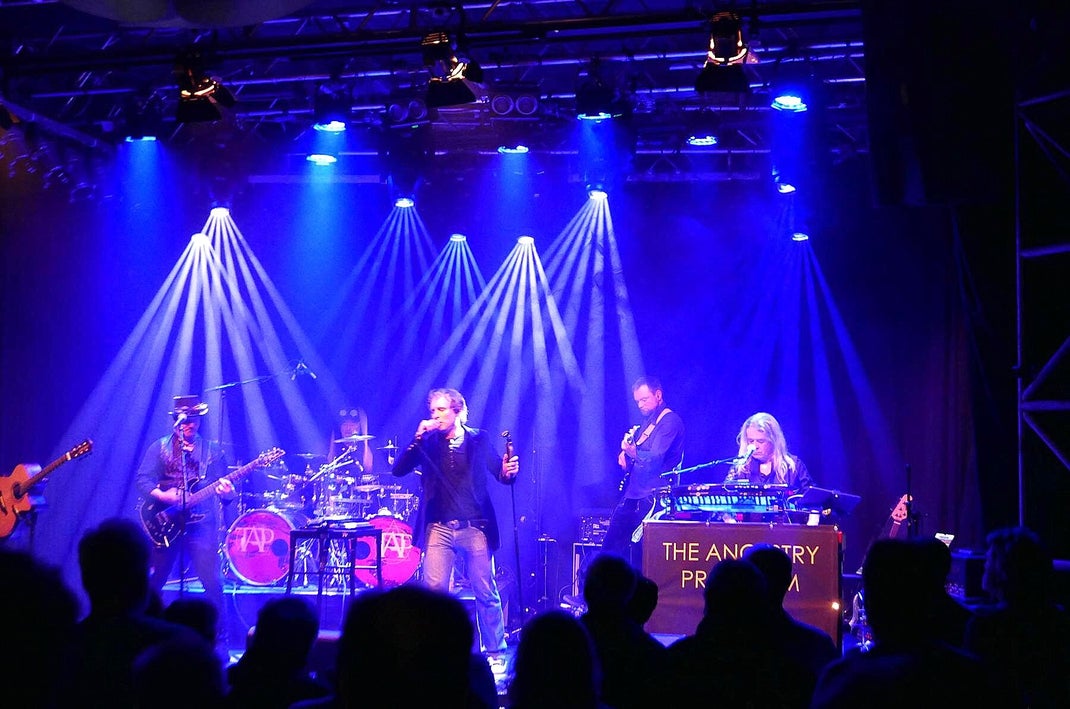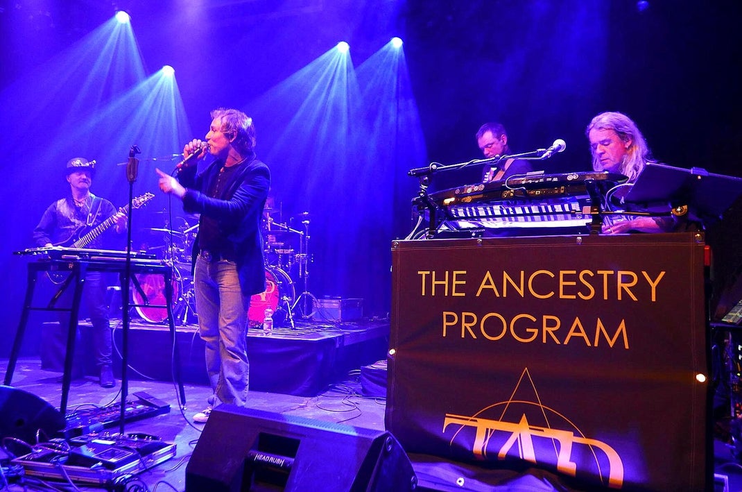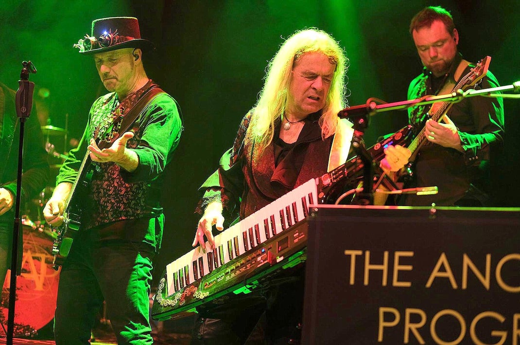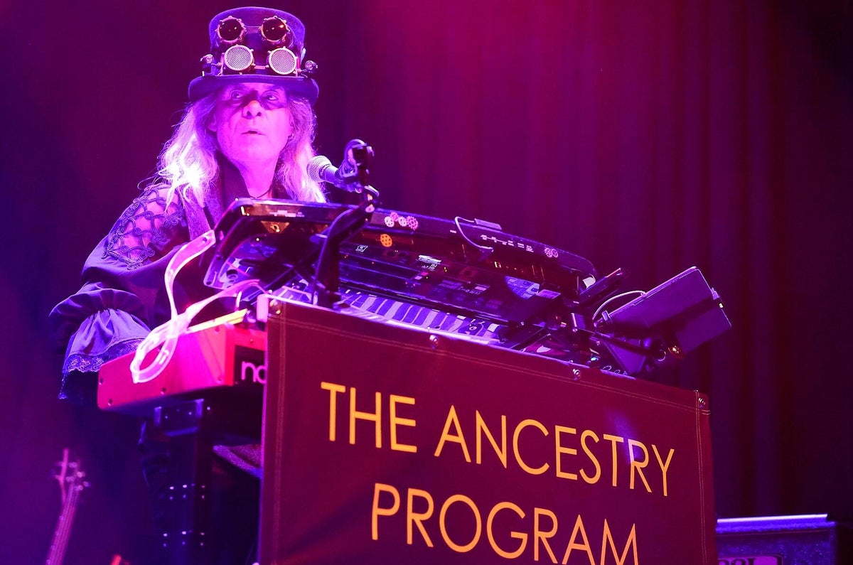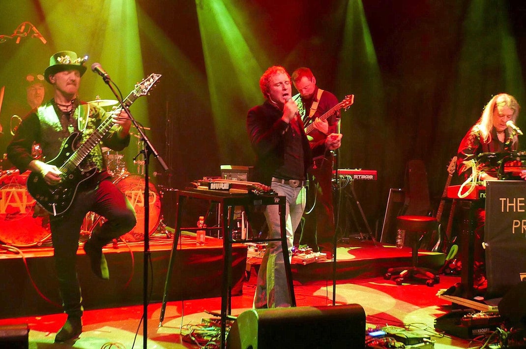 Aber das Traurige zuerst: Das Septett The Ancestry Program (TAP) aus dem Großraum München hatten leider ihr Gründungsmitglied und prägenden Gitarristen Mani Gruber aus gesundheitlichen Gründen nicht mit zu den zwei Prog-Gipfeln nach Oberhausen und Rüsselsheim mitbringen können. Deshalb mussten die Rollen im diesmal nun Quintett etwas neu verteilt werden, denn eigentlich hat TAP vier Saitenkünstler. Mike Voglmeier übernahm die Position von Mani, Tastenvirtuose Thomas Burlefinger ergänzte an der elektrischen 6-saitigen, Marco Osmajic angestammt, konzentriert am Bass und der charismatische Front-Sänger Ben Knabe setzte wie gewohnt Akzente stimmlich und Klangtupfer mit seiner Pedal-Steel-Gitarre. Als ich die Musik von TAP vor Jahren zum ersten Mal hörte, war ich überrascht von dieser komplexen, teils aber auch verspielten Musik mit Wurzeln in verschiedenen Ecken des Rock. Meine Überlegungen: Wie kann man so eine Musik Live präsentieren ?? Wie gut könnte es werden ?? Stephan und ich haben es jetzt 2-mal kurz hintereinander an zwei Orten erlebt (mit Reichenbach 2023 auf insgesamt nun drei Bühnen). Antwort: Mit Könnern an den Instrumenten, aber besonders auch mit einem homogenen Gefüge innerhalb der Band. Der Kuschelfaktor zeigte mir hier am Main die Harmonie der Musiker untereinander. Trotz einem Mann weniger auf dem Spiel-Platz, hatte man nicht eine Minute das Gefühl hier sind im Klangteppich Lücken oder Fehlstellen. Frontsänger und Steel-Gitarre-Spieler Ben Knabe sagte mir vor dem Auftritt: „Ich stecke voller Energie, werde heute für Mani und für meine Familie alles geben.“ Und er hat Wort gehalten !! War er beim Artrock-Festival 2023 noch etwas zurückhaltender, hier in Rüsselheim am Main war Ben wie entfesselt und immer in Bewegung, suchte ständig den Kontakt zu den Mitspielern. Tieftöner Marco und der grölende Schlagzeuger Andy Lind sorgten wie gewohnt für das stabile Fundament auf dem die drei Frontmänner stark aufbauen konnten. Andy, Mike und Thomas waren wie immer typisch als Ahnenforscher kostümiert und waren ständig in Bewegung. Thomas verließ immer mal wieder mit Gitarre oder mobilen Keyboard seinen Hauptarbeitsplatz hinter der Tasten-Burg. Das fachkundige Publikum beobachte wie gebannt das Geschehen auf der gut beleuchteten Bühne, honorierte den starken Auftritt immer wieder berechtigt mit Szenen-Applaus. Und den hat stellvertretend Mani Gruber auch verdient, alles gute bayrischer Ahnenforscher für deinen weiteren Weg.