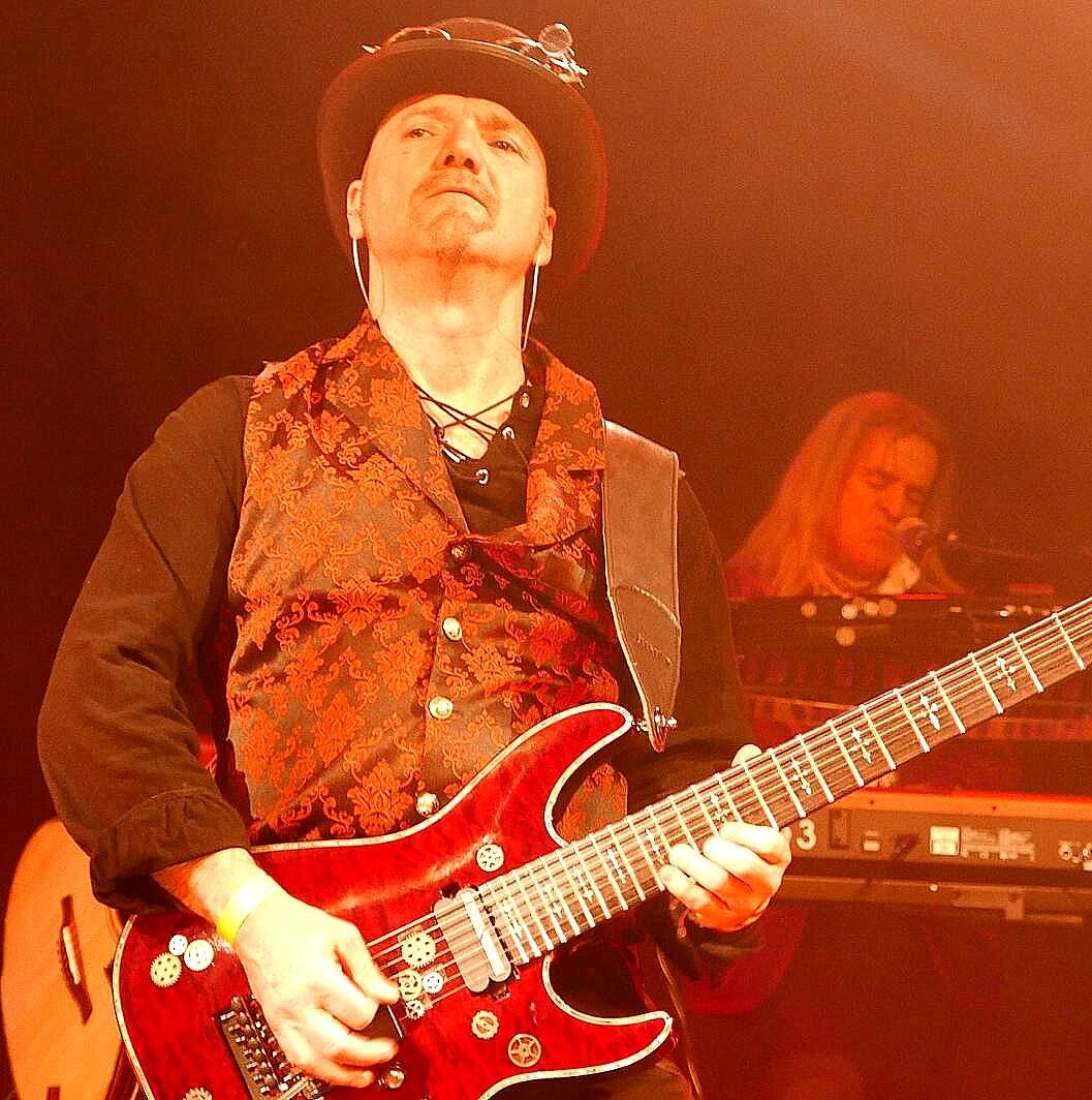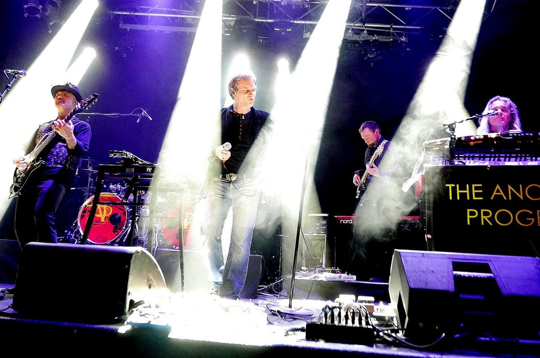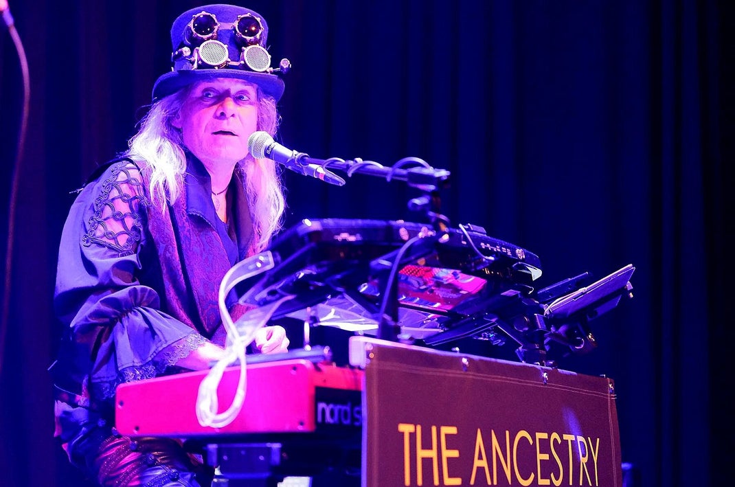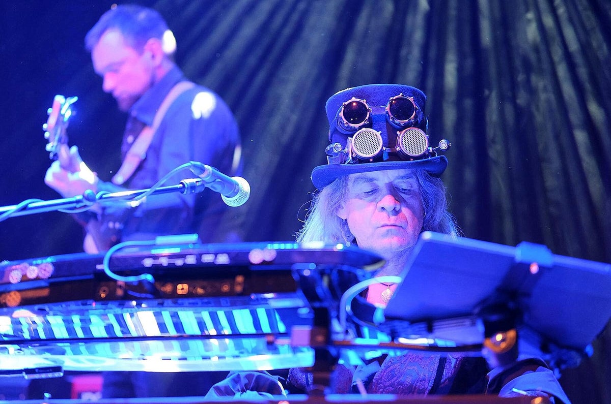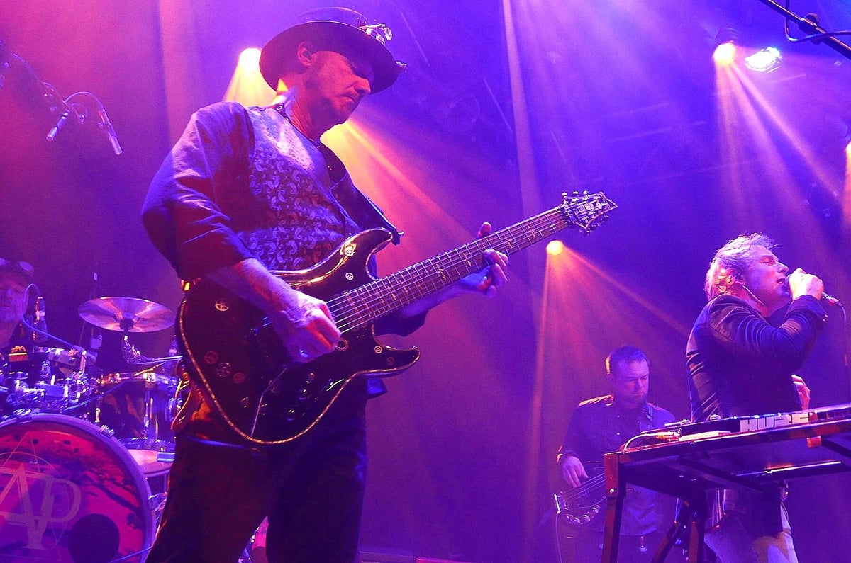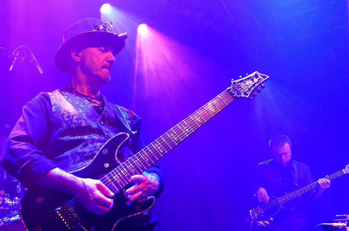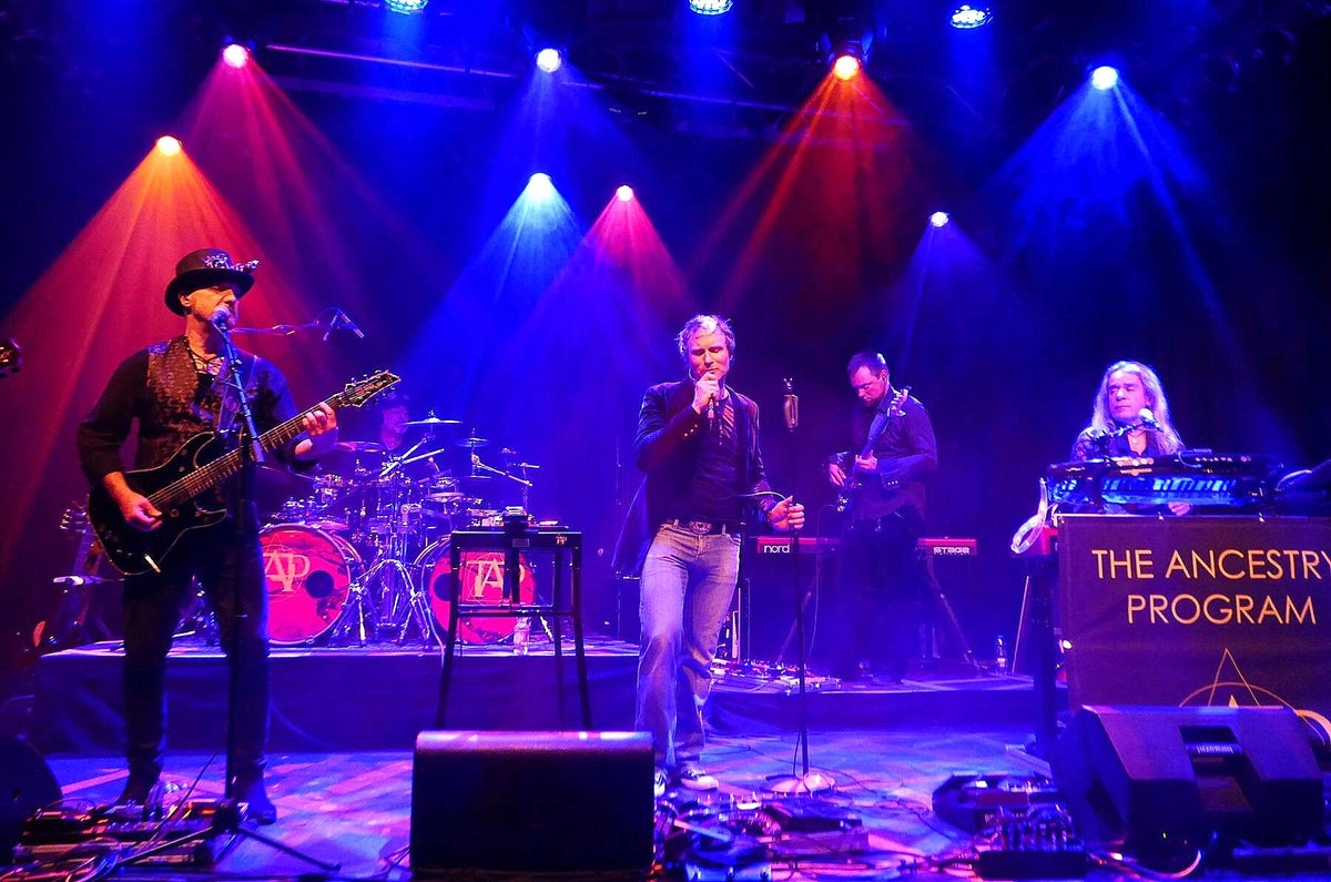 Aber das Traurige zuerst: Das Septett The Ancestry Program (TAP) aus dem Großraum München hatten leider ihr Gründungsmitglied und prägenden Gitarristen Mani Gruber aus gesundheitlichen Gründen nicht mit zu den zwei Prog-Gipfeln nach Oberhausen und Rüsselsheim mitbringen können. Deshalb mussten die Rollen im diesmal nun Quintett etwas neu verteilt werden, denn eigentlich hat TAP vier Saitenkünstler. Mike Voglmeier übernahm die Position von Mani, Tastenvirtuose Thomas Burlefinger ergänzte an der elektrischen 6-saitigen, Marco Osmajic angestammt, konzentriert am Bass und der charismatische Front-Sänger Ben Knabe setzte wie gewohnt Akzente stimmlich und Klangtupfer mit seiner Pedal-Steel-Gitarre. Als ich die Musik von TAP vor Jahren zum ersten Mal hörte, war ich überrascht von dieser komplexen, teils aber auch verspielten Musik mit Wurzeln in verschiedenen Ecken des Rock. Meine Überlegungen: Wie kann man so eine Musik Live präsentieren ?? Wie gut könnte es werden ?? Stephan und ich haben es jetzt 2-mal kurz hintereinander an zwei Orten erlebt (mit Reichenbach 2023 auf insgesamt nun drei Bühnen). Antwort: Mit Könnern an den Instrumenten, aber besonders auch mit einem homogenen Gefüge innerhalb der Band. Der Kuschelfaktor zeigte mir hier am Main die Harmonie der Musiker untereinander. Trotz einem Mann weniger auf dem Spiel-Platz, hatte man nicht eine Minute das Gefühl hier sind im Klangteppich Lücken oder Fehlstellen. Frontsänger und Steel-Gitarre-Spieler Ben Knabe sagte mir vor dem Auftritt: „Ich stecke voller Energie, werde heute für Mani und für meine Familie alles geben.“ Und er hat Wort gehalten !! War er beim Artrock-Festival 2023 noch etwas zurückhaltender, hier in Rüsselheim am Main war Ben wie entfesselt und immer in Bewegung, suchte ständig den Kontakt zu den Mitspielern. Tieftöner Marco und der grölende Schlagzeuger Andy Lind sorgten wie gewohnt für das stabile Fundament auf dem die drei Frontmänner stark aufbauen konnten. Andy, Mike und Thomas waren wie immer typisch als Ahnenforscher kostümiert und waren ständig in Bewegung. Thomas verließ immer mal wieder mit Gitarre oder mobilen Keyboard seinen Hauptarbeitsplatz hinter der Tasten-Burg. Das fachkundige Publikum beobachte wie gebannt das Geschehen auf der gut beleuchteten Bühne, honorierte den starken Auftritt immer wieder berechtigt mit Szenen-Applaus. Und den hat stellvertretend Mani Gruber auch verdient, alles gute bayrischer Ahnenforscher für deinen weiteren Weg.
