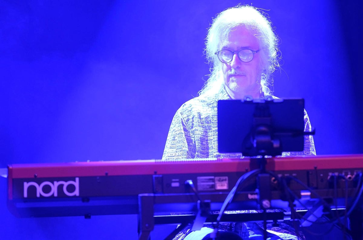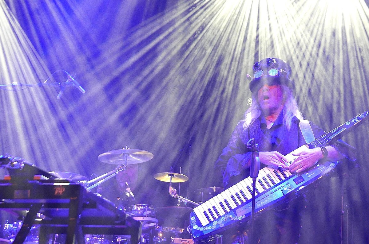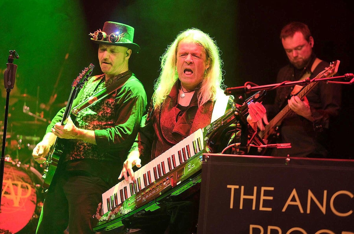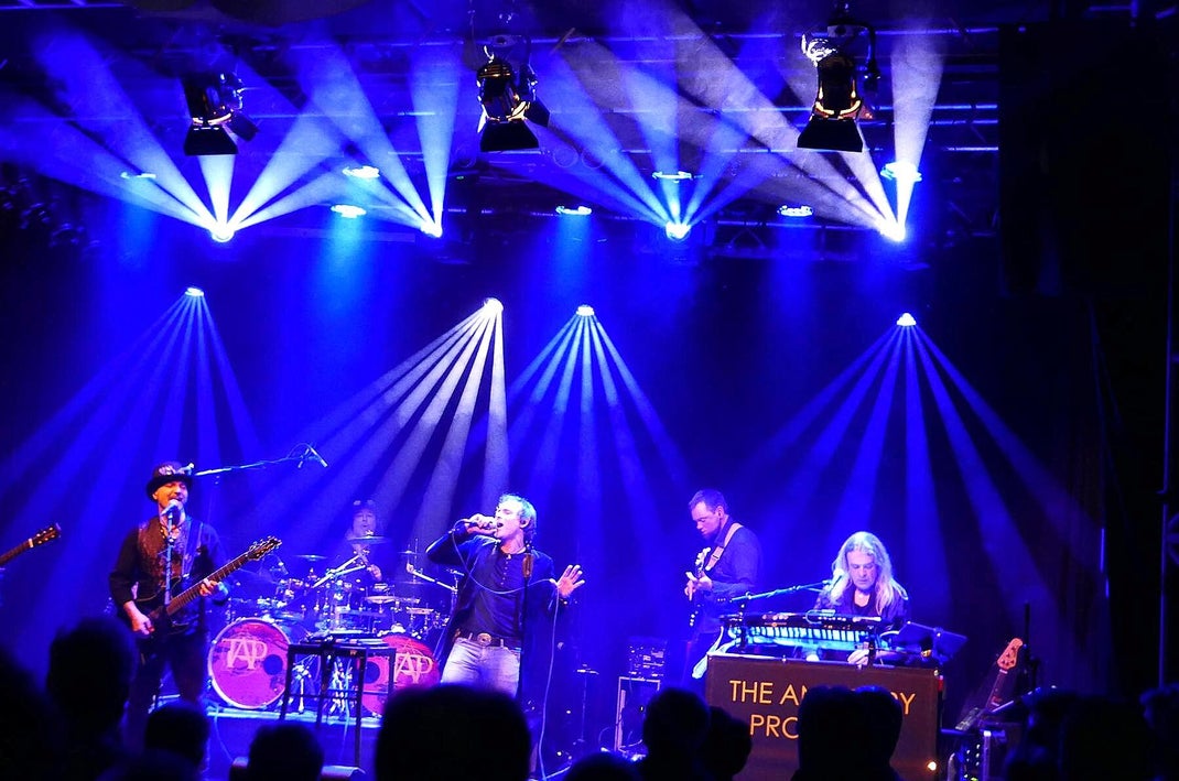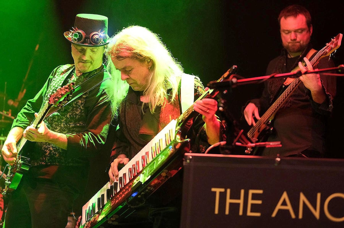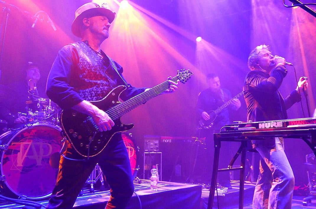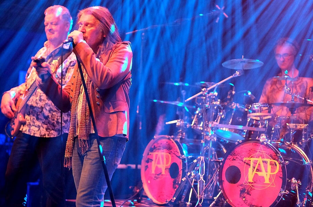 Aber das Traurige zuerst: Das Septett The Ancestry Program (TAP) aus dem Großraum München hatten leider ihr Gründungsmitglied und prägenden Gitarristen Mani Gruber aus gesundheitlichen Gründen nicht mit zu den zwei Prog-Gipfeln nach Oberhausen und Rüsselsheim mitbringen können. Deshalb mussten die Rollen im diesmal nun Quintett etwas neu verteilt werden, denn eigentlich hat TAP vier Saitenkünstler. Mike Voglmeier übernahm die Position von Mani, Tastenvirtuose Thomas Burlefinger ergänzte an der elektrischen 6-saitigen, Marco Osmajic angestammt, konzentriert am Bass und der charismatische Front-Sänger Ben Knabe setzte wie gewohnt Akzente stimmlich und Klangtupfer mit seiner Pedal-Steel-Gitarre. Als ich die Musik von TAP vor Jahren zum ersten Mal hörte, war ich überrascht von dieser komplexen, teils aber auch verspielten Musik mit Wurzeln in verschiedenen Ecken des Rock. Meine Überlegungen: Wie kann man so eine Musik Live präsentieren ?? Wie gut könnte es werden ?? Stephan und ich haben es jetzt 2-mal kurz hintereinander an zwei Orten erlebt (mit Reichenbach 2023 auf insgesamt nun drei Bühnen). Antwort: Mit Könnern an den Instrumenten, aber besonders auch mit einem homogenen Gefüge innerhalb der Band. Der Kuschelfaktor zeigte mir hier am Main die Harmonie der Musiker untereinander. Trotz einem Mann weniger auf dem Spiel-Platz, hatte man nicht eine Minute das Gefühl hier sind im Klangteppich Lücken oder Fehlstellen. Frontsänger und Steel-Gitarre-Spieler Ben Knabe sagte mir vor dem Auftritt: „Ich stecke voller Energie, werde heute für Mani und für meine Familie alles geben.“ Und er hat Wort gehalten !! War er beim Artrock-Festival 2023 noch etwas zurückhaltender, hier in Rüsselheim am Main war Ben wie entfesselt und immer in Bewegung, suchte ständig den Kontakt zu den Mitspielern. Tieftöner Marco und der grölende Schlagzeuger Andy Lind sorgten wie gewohnt für das stabile Fundament auf dem die drei Frontmänner stark aufbauen konnten. Andy, Mike und Thomas waren wie immer typisch als Ahnenforscher kostümiert und waren ständig in Bewegung. Thomas verließ immer mal wieder mit Gitarre oder mobilen Keyboard seinen Hauptarbeitsplatz hinter der Tasten-Burg. Das fachkundige Publikum beobachte wie gebannt das Geschehen auf der gut beleuchteten Bühne, honorierte den starken Auftritt immer wieder berechtigt mit Szenen-Applaus. Und den hat stellvertretend Mani Gruber auch verdient, alles gute bayrischer Ahnenforscher für deinen weiteren Weg.