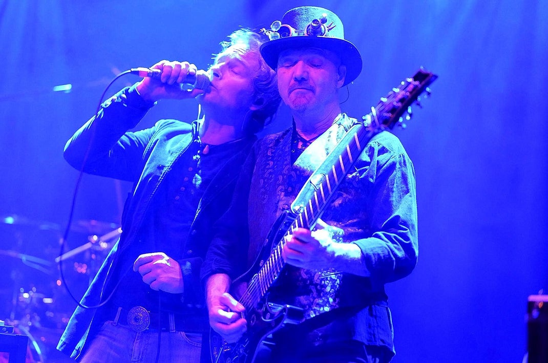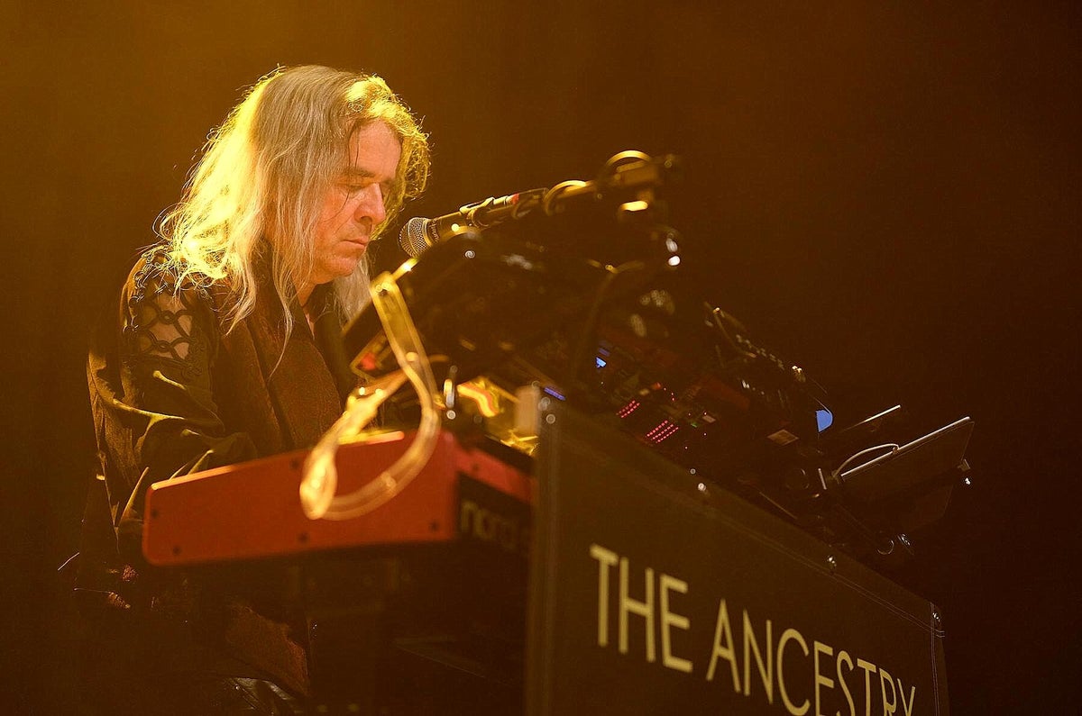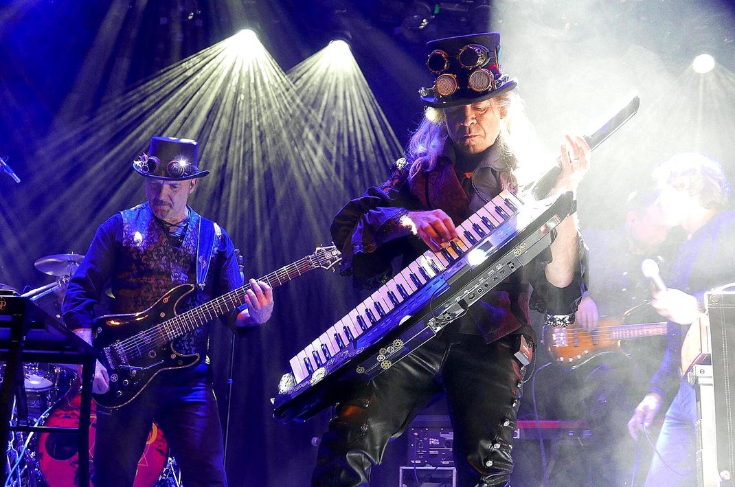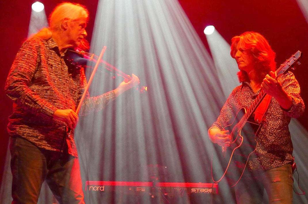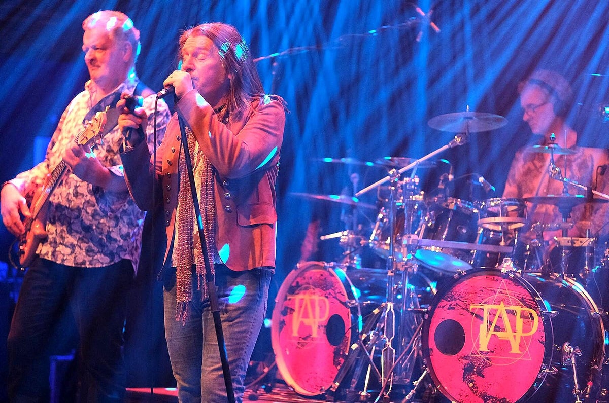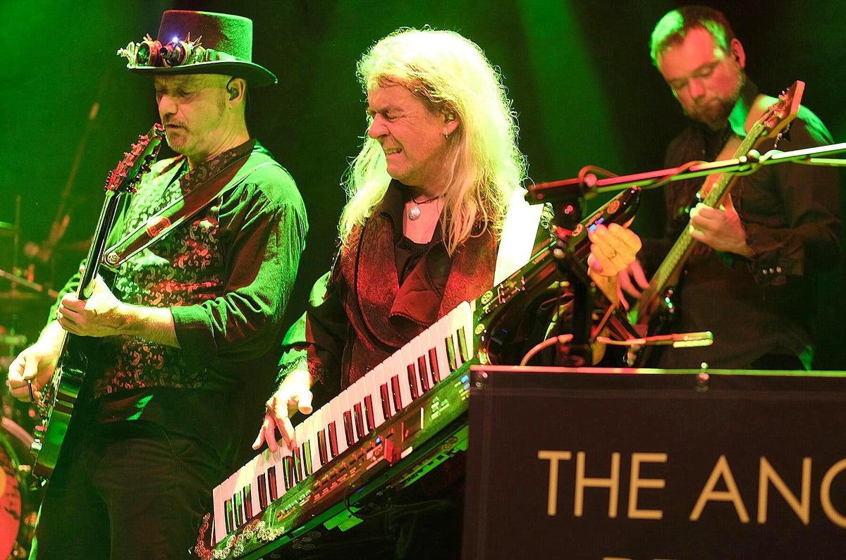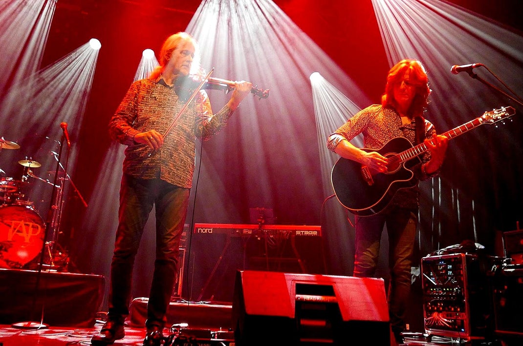 Aber das Traurige zuerst: Das Septett The Ancestry Program (TAP) aus dem Großraum München hatten leider ihr Gründungsmitglied und prägenden Gitarristen Mani Gruber aus gesundheitlichen Gründen nicht mit zu den zwei Prog-Gipfeln nach Oberhausen und Rüsselsheim mitbringen können. Deshalb mussten die Rollen im diesmal nun Quintett etwas neu verteilt werden, denn eigentlich hat TAP vier Saitenkünstler. Mike Voglmeier übernahm die Position von Mani, Tastenvirtuose Thomas Burlefinger ergänzte an der elektrischen 6-saitigen, Marco Osmajic angestammt, konzentriert am Bass und der charismatische Front-Sänger Ben Knabe setzte wie gewohnt Akzente stimmlich und Klangtupfer mit seiner Pedal-Steel-Gitarre. Als ich die Musik von TAP vor Jahren zum ersten Mal hörte, war ich überrascht von dieser komplexen, teils aber auch verspielten Musik mit Wurzeln in verschiedenen Ecken des Rock. Meine Überlegungen: Wie kann man so eine Musik Live präsentieren ?? Wie gut könnte es werden ?? Stephan und ich haben es jetzt 2-mal kurz hintereinander an zwei Orten erlebt (mit Reichenbach 2023 auf insgesamt nun drei Bühnen). Antwort: Mit Könnern an den Instrumenten, aber besonders auch mit einem homogenen Gefüge innerhalb der Band. Der Kuschelfaktor zeigte mir hier am Main die Harmonie der Musiker untereinander. Trotz einem Mann weniger auf dem Spiel-Platz, hatte man nicht eine Minute das Gefühl hier sind im Klangteppich Lücken oder Fehlstellen. Frontsänger und Steel-Gitarre-Spieler Ben Knabe sagte mir vor dem Auftritt: „Ich stecke voller Energie, werde heute für Mani und für meine Familie alles geben.“ Und er hat Wort gehalten !! War er beim Artrock-Festival 2023 noch etwas zurückhaltender, hier in Rüsselheim am Main war Ben wie entfesselt und immer in Bewegung, suchte ständig den Kontakt zu den Mitspielern. Tieftöner Marco und der grölende Schlagzeuger Andy Lind sorgten wie gewohnt für das stabile Fundament auf dem die drei Frontmänner stark aufbauen konnten. Andy, Mike und Thomas waren wie immer typisch als Ahnenforscher kostümiert und waren ständig in Bewegung. Thomas verließ immer mal wieder mit Gitarre oder mobilen Keyboard seinen Hauptarbeitsplatz hinter der Tasten-Burg. Das fachkundige Publikum beobachte wie gebannt das Geschehen auf der gut beleuchteten Bühne, honorierte den starken Auftritt immer wieder berechtigt mit Szenen-Applaus. Und den hat stellvertretend Mani Gruber auch verdient, alles gute bayrischer Ahnenforscher für deinen weiteren Weg.