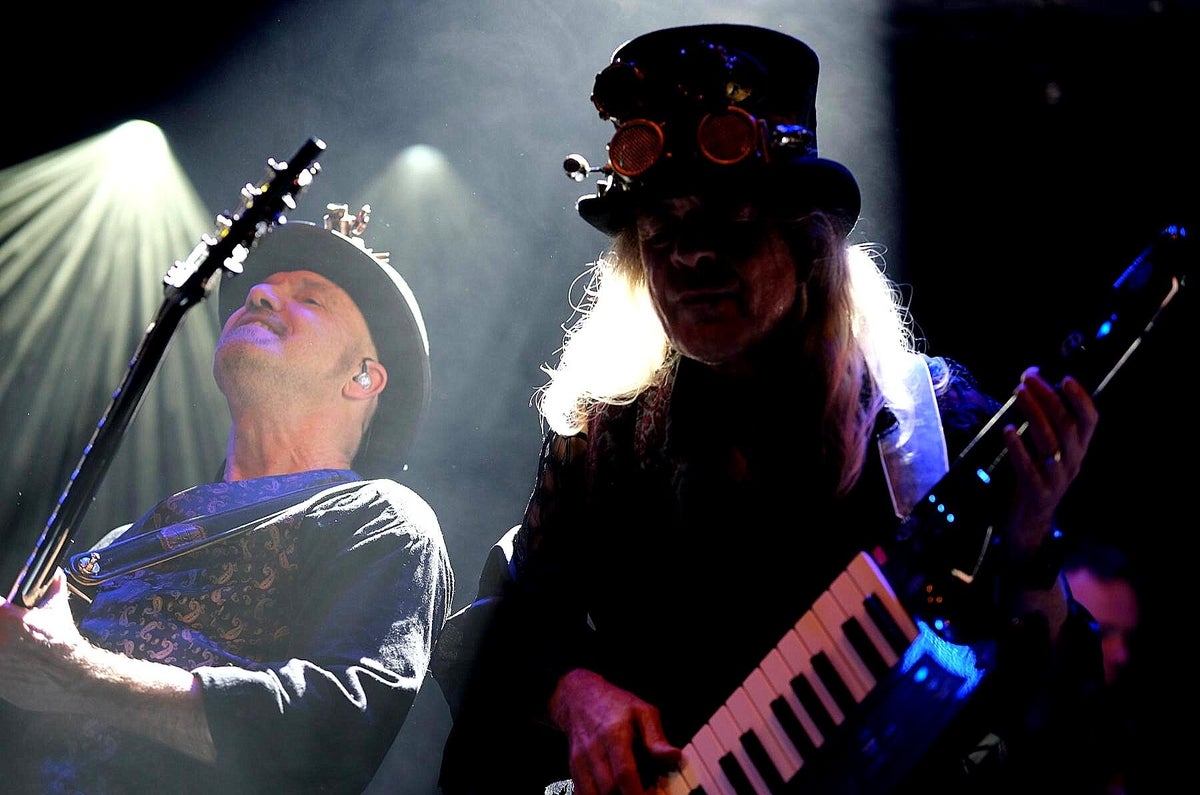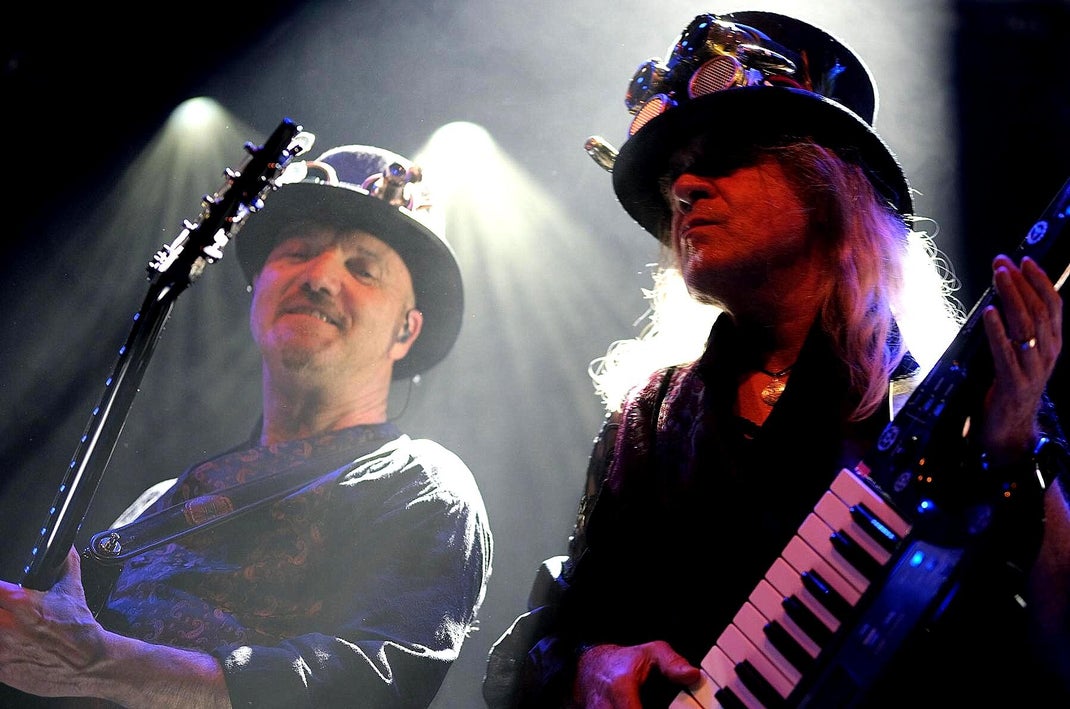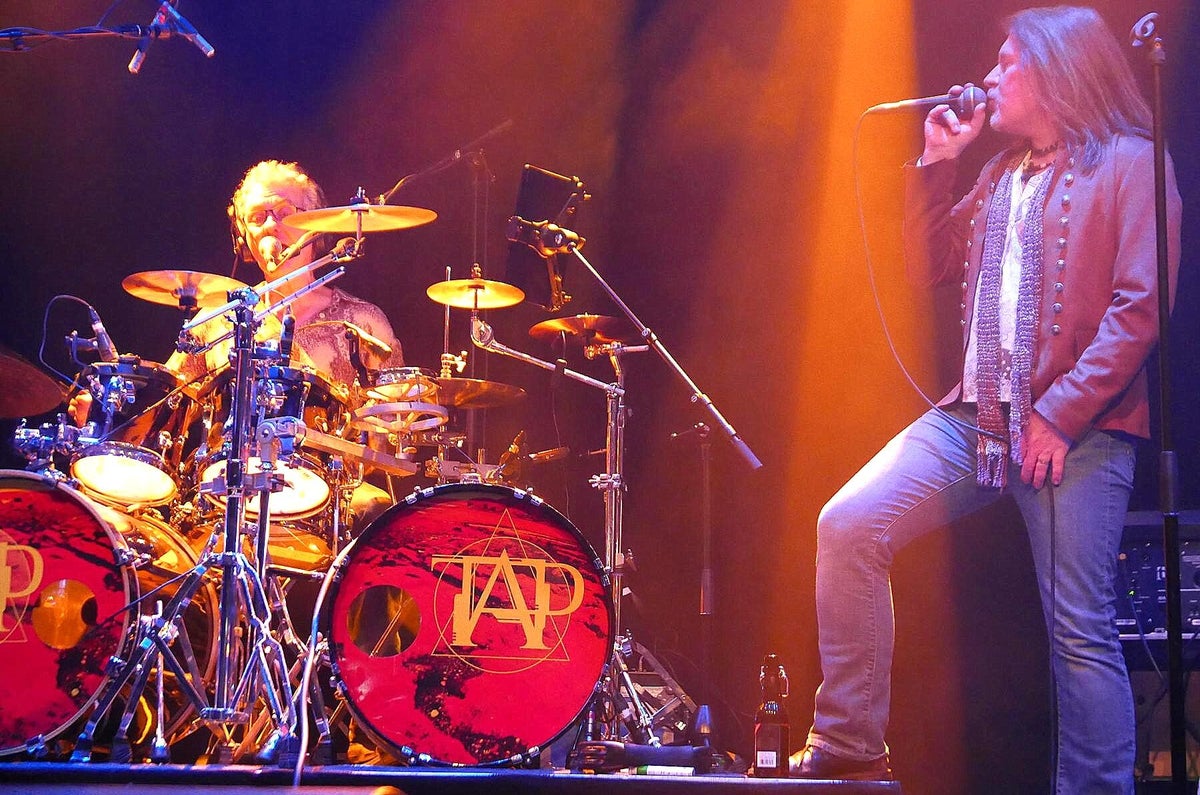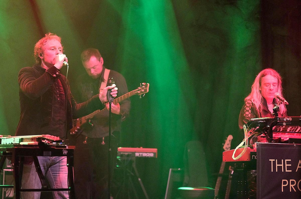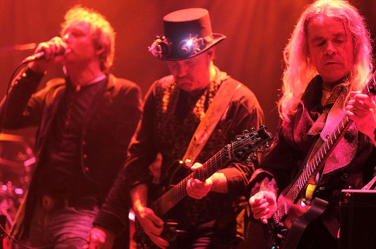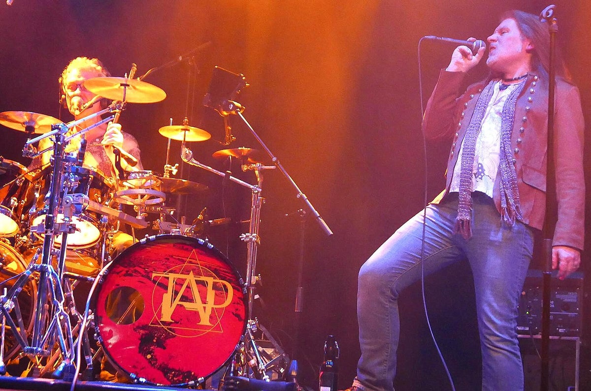 Aber das Traurige zuerst: Das Septett The Ancestry Program (TAP) aus dem Großraum München hatten leider ihr Gründungsmitglied und prägenden Gitarristen Mani Gruber aus gesundheitlichen Gründen nicht mit zu den zwei Prog-Gipfeln nach Oberhausen und Rüsselsheim mitbringen können. Deshalb mussten die Rollen im diesmal nun Quintett etwas neu verteilt werden, denn eigentlich hat TAP vier Saitenkünstler. Mike Voglmeier übernahm die Position von Mani, Tastenvirtuose Thomas Burlefinger ergänzte an der elektrischen 6-saitigen, Marco Osmajic angestammt, konzentriert am Bass und der charismatische Front-Sänger Ben Knabe setzte wie gewohnt Akzente stimmlich und Klangtupfer mit seiner Pedal-Steel-Gitarre. Als ich die Musik von TAP vor Jahren zum ersten Mal hörte, war ich überrascht von dieser komplexen, teils aber auch verspielten Musik mit Wurzeln in verschiedenen Ecken des Rock. Meine Überlegungen: Wie kann man so eine Musik Live präsentieren ?? Wie gut könnte es werden ?? Stephan und ich haben es jetzt 2-mal kurz hintereinander an zwei Orten erlebt (mit Reichenbach 2023 auf insgesamt nun drei Bühnen). Antwort: Mit Könnern an den Instrumenten, aber besonders auch mit einem homogenen Gefüge innerhalb der Band. Der Kuschelfaktor zeigte mir hier am Main die Harmonie der Musiker untereinander. Trotz einem Mann weniger auf dem Spiel-Platz, hatte man nicht eine Minute das Gefühl hier sind im Klangteppich Lücken oder Fehlstellen. Frontsänger und Steel-Gitarre-Spieler Ben Knabe sagte mir vor dem Auftritt: „Ich stecke voller Energie, werde heute für Mani und für meine Familie alles geben.“ Und er hat Wort gehalten !! War er beim Artrock-Festival 2023 noch etwas zurückhaltender, hier in Rüsselheim am Main war Ben wie entfesselt und immer in Bewegung, suchte ständig den Kontakt zu den Mitspielern. Tieftöner Marco und der grölende Schlagzeuger Andy Lind sorgten wie gewohnt für das stabile Fundament auf dem die drei Frontmänner stark aufbauen konnten. Andy, Mike und Thomas waren wie immer typisch als Ahnenforscher kostümiert und waren ständig in Bewegung. Thomas verließ immer mal wieder mit Gitarre oder mobilen Keyboard seinen Hauptarbeitsplatz hinter der Tasten-Burg. Das fachkundige Publikum beobachte wie gebannt das Geschehen auf der gut beleuchteten Bühne, honorierte den starken Auftritt immer wieder berechtigt mit Szenen-Applaus. Und den hat stellvertretend Mani Gruber auch verdient, alles gute bayrischer Ahnenforscher für deinen weiteren Weg.