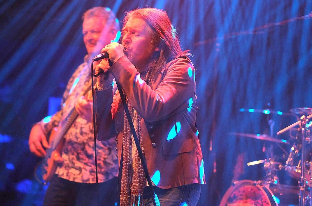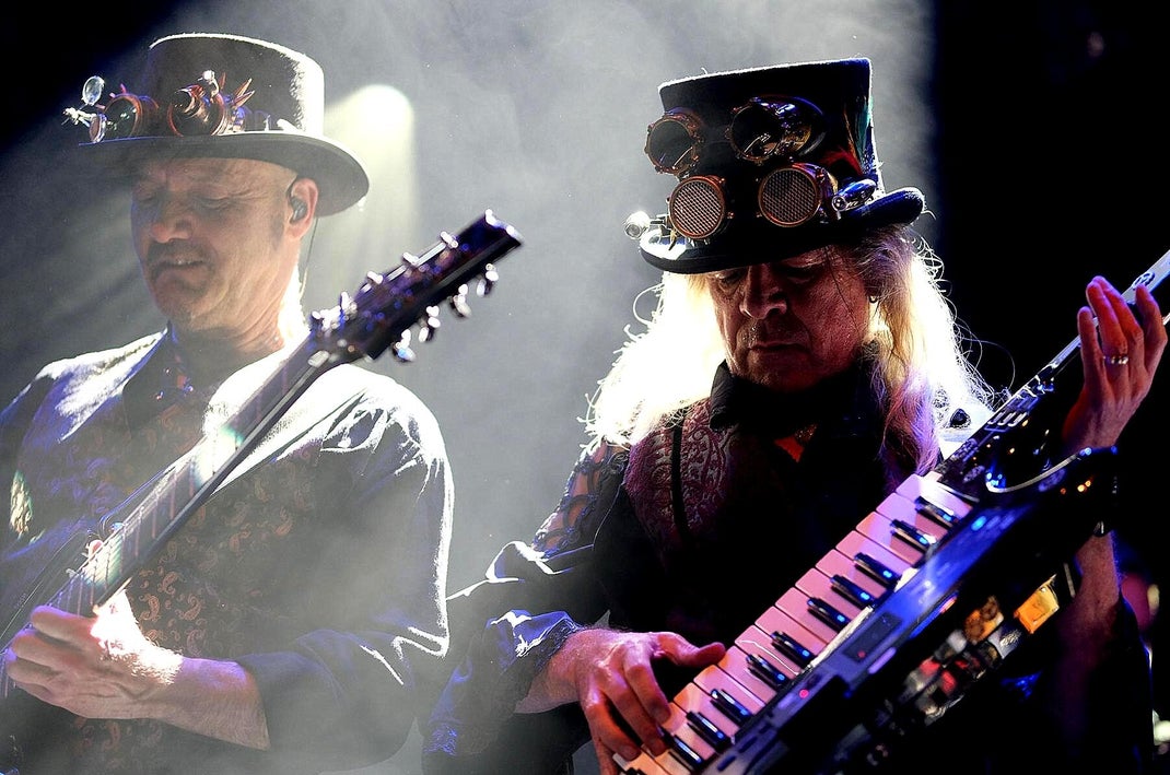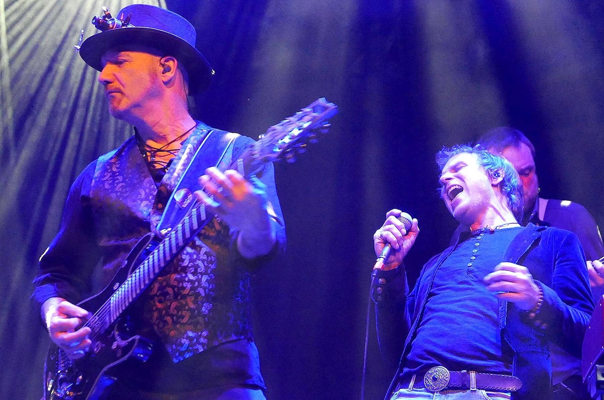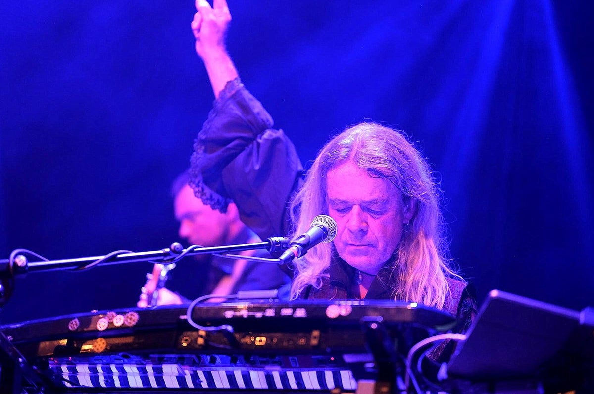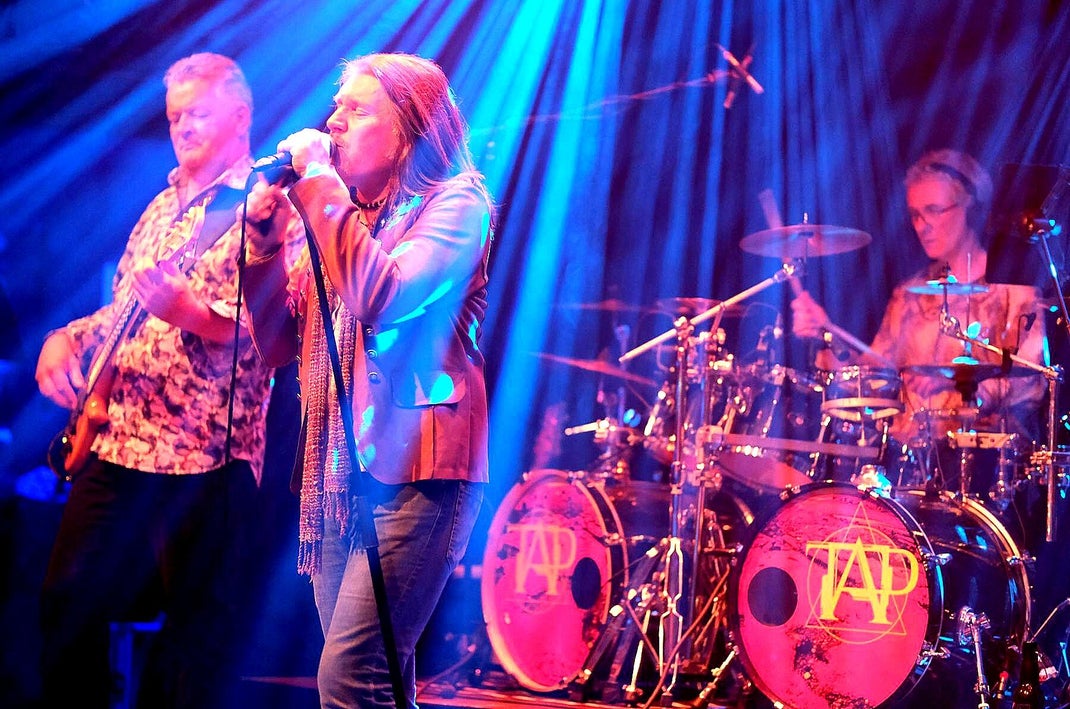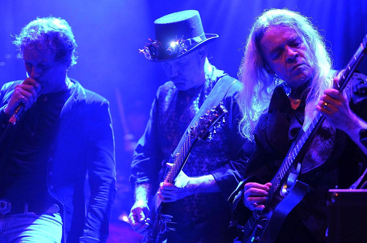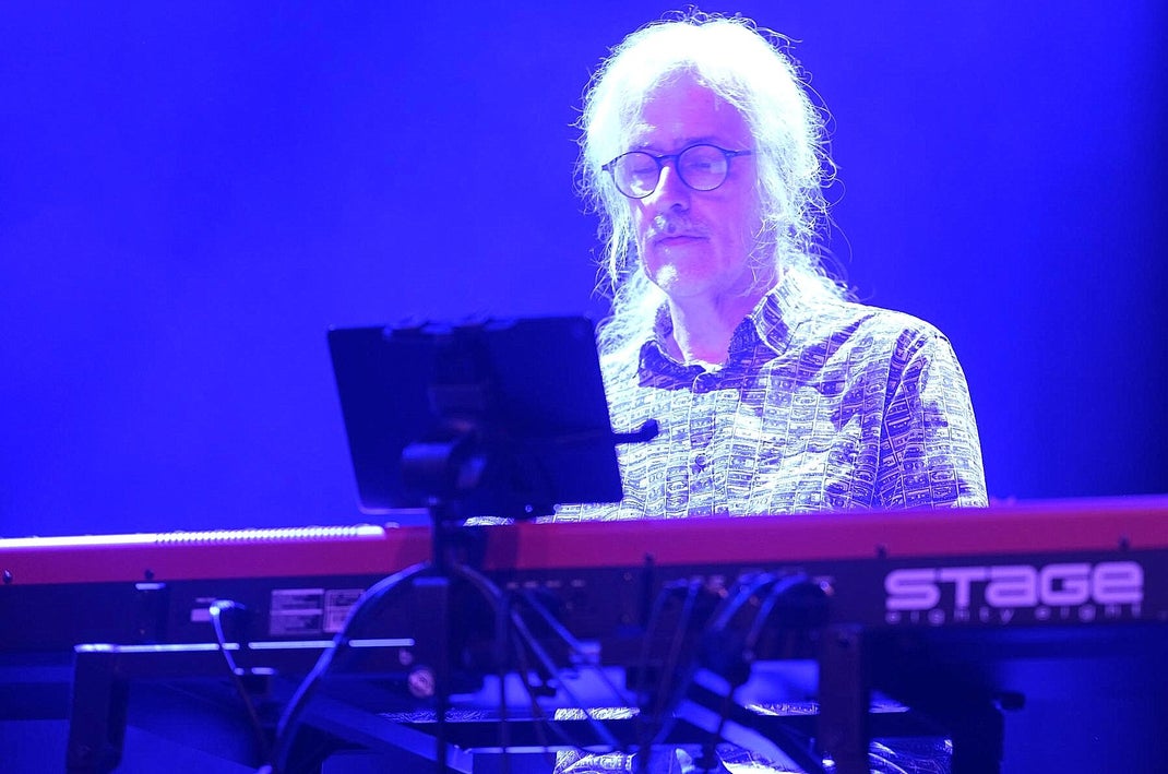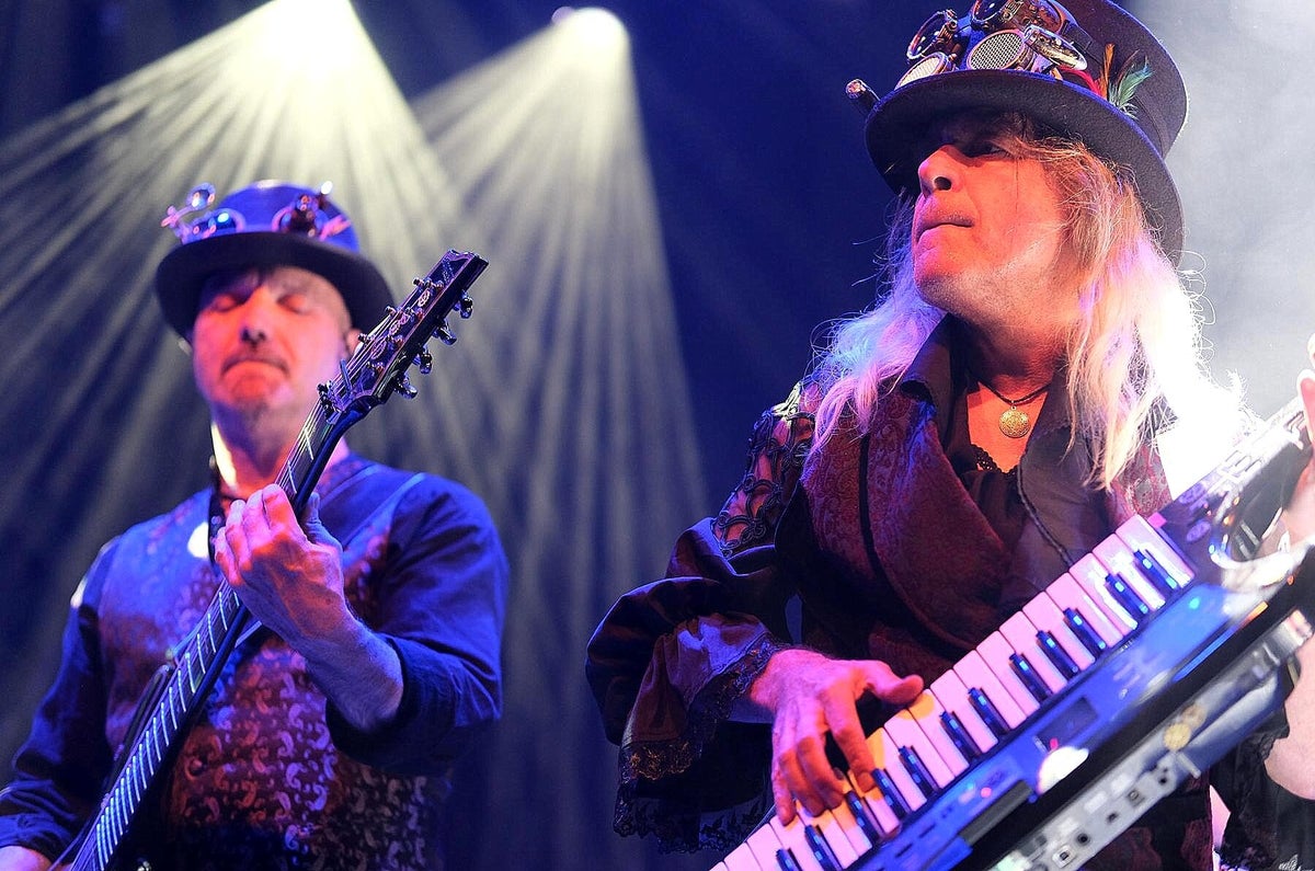 Aber das Traurige zuerst: Das Septett The Ancestry Program (TAP) aus dem Großraum München hatten leider ihr Gründungsmitglied und prägenden Gitarristen Mani Gruber aus gesundheitlichen Gründen nicht mit zu den zwei Prog-Gipfeln nach Oberhausen und Rüsselsheim mitbringen können. Deshalb mussten die Rollen im diesmal nun Quintett etwas neu verteilt werden, denn eigentlich hat TAP vier Saitenkünstler. Mike Voglmeier übernahm die Position von Mani, Tastenvirtuose Thomas Burlefinger ergänzte an der elektrischen 6-saitigen, Marco Osmajic angestammt, konzentriert am Bass und der charismatische Front-Sänger Ben Knabe setzte wie gewohnt Akzente stimmlich und Klangtupfer mit seiner Pedal-Steel-Gitarre. Als ich die Musik von TAP vor Jahren zum ersten Mal hörte, war ich überrascht von dieser komplexen, teils aber auch verspielten Musik mit Wurzeln in verschiedenen Ecken des Rock. Meine Überlegungen: Wie kann man so eine Musik Live präsentieren ?? Wie gut könnte es werden ?? Stephan und ich haben es jetzt 2-mal kurz hintereinander an zwei Orten erlebt (mit Reichenbach 2023 auf insgesamt nun drei Bühnen). Antwort: Mit Könnern an den Instrumenten, aber besonders auch mit einem homogenen Gefüge innerhalb der Band. Der Kuschelfaktor zeigte mir hier am Main die Harmonie der Musiker untereinander. Trotz einem Mann weniger auf dem Spiel-Platz, hatte man nicht eine Minute das Gefühl hier sind im Klangteppich Lücken oder Fehlstellen. Frontsänger und Steel-Gitarre-Spieler Ben Knabe sagte mir vor dem Auftritt: „Ich stecke voller Energie, werde heute für Mani und für meine Familie alles geben.“ Und er hat Wort gehalten !! War er beim Artrock-Festival 2023 noch etwas zurückhaltender, hier in Rüsselheim am Main war Ben wie entfesselt und immer in Bewegung, suchte ständig den Kontakt zu den Mitspielern. Tieftöner Marco und der grölende Schlagzeuger Andy Lind sorgten wie gewohnt für das stabile Fundament auf dem die drei Frontmänner stark aufbauen konnten. Andy, Mike und Thomas waren wie immer typisch als Ahnenforscher kostümiert und waren ständig in Bewegung. Thomas verließ immer mal wieder mit Gitarre oder mobilen Keyboard seinen Hauptarbeitsplatz hinter der Tasten-Burg. Das fachkundige Publikum beobachte wie gebannt das Geschehen auf der gut beleuchteten Bühne, honorierte den starken Auftritt immer wieder berechtigt mit Szenen-Applaus. Und den hat stellvertretend Mani Gruber auch verdient, alles gute bayrischer Ahnenforscher für deinen weiteren Weg.
