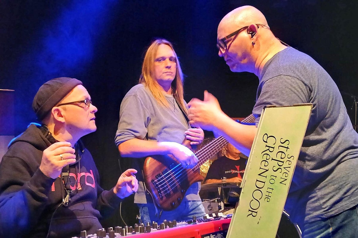 Ulf thronte hinten in seinem Halbkreis aus Trommeln und Becken. Aus Sicht des Publikums linksseitig Tieftöner Denis sowie Marek hinter seiner Keyboard-Burg mit Seven Steps To The Green Door-Logo, mittig davor und rechtsseitig daneben die beiden Sänger Sören und Larry, die sich beim Gesang abwechselten, einige Passagen aber auch zusammen oder im Zwiegespräch vortrugen. Der sechste im Bunde ist Neuzugang Gitarrist Ian von Ossowski ganz rechts außen. Der erledigte seine Aufgabe übrigens meisterlich. Denn die grandiosen Kompositionen, meist aus der Feder von Meister-Komponist Marek, sind in jeder Hinsicht komplex. Nach zwei Liedern sind die Erlebnisse von vor der Ankunft hier in der Halle vergessen und die Band agiert zunehmend homogener und immer flüssiger. Oft gibt es Szenenapplaus und die Stimmung steigt stetig. Heute hier im Rind zu bestehen ist nicht einfach, denn es ist überwiegend Fachpublikum aus allen Himmelsrichtungen angereist, auch das Stone Prog Magazin mit einer Busladung Prog-Gourmets aus den Sachsen-Metropolen. Die wollen nach Mitternacht auch noch den 60er vom Chemnitzer Prog-Leitwolf Holger Stöckel feiern. Mit dabei auch Marcus Wicker, der nach dem Vorbericht nun auch noch authentisches Material für eine Reportage im eclipsed-Magazin sammelt. Ebenso hatte es sich Label-Chef Dirk Jacob von Tempus Fugit nicht nehmen lassen, quasi das Debüt-Konzert seines Schützling Marek Arnold mit dem The Artrock Project zu besuchen und die Entwicklung dieses Live-Projekts auf Herz und Nieren zu begutachten.